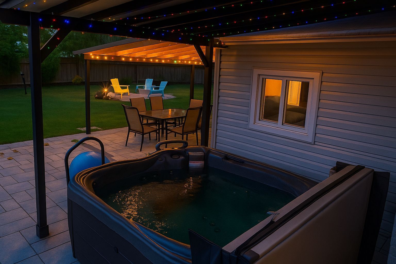 • Professionally landscaped backyard with fire pit and hot tub for relaxation.