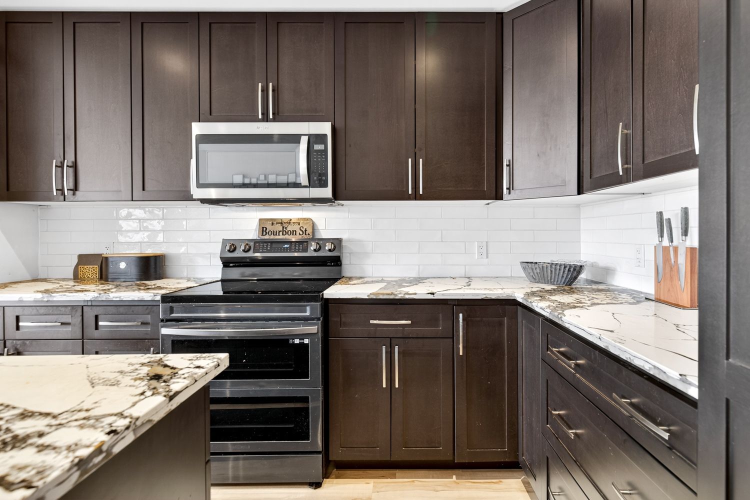 • Stylish kitchen featuring dark cabinetry, stone countertops, and stainless steel appliances.