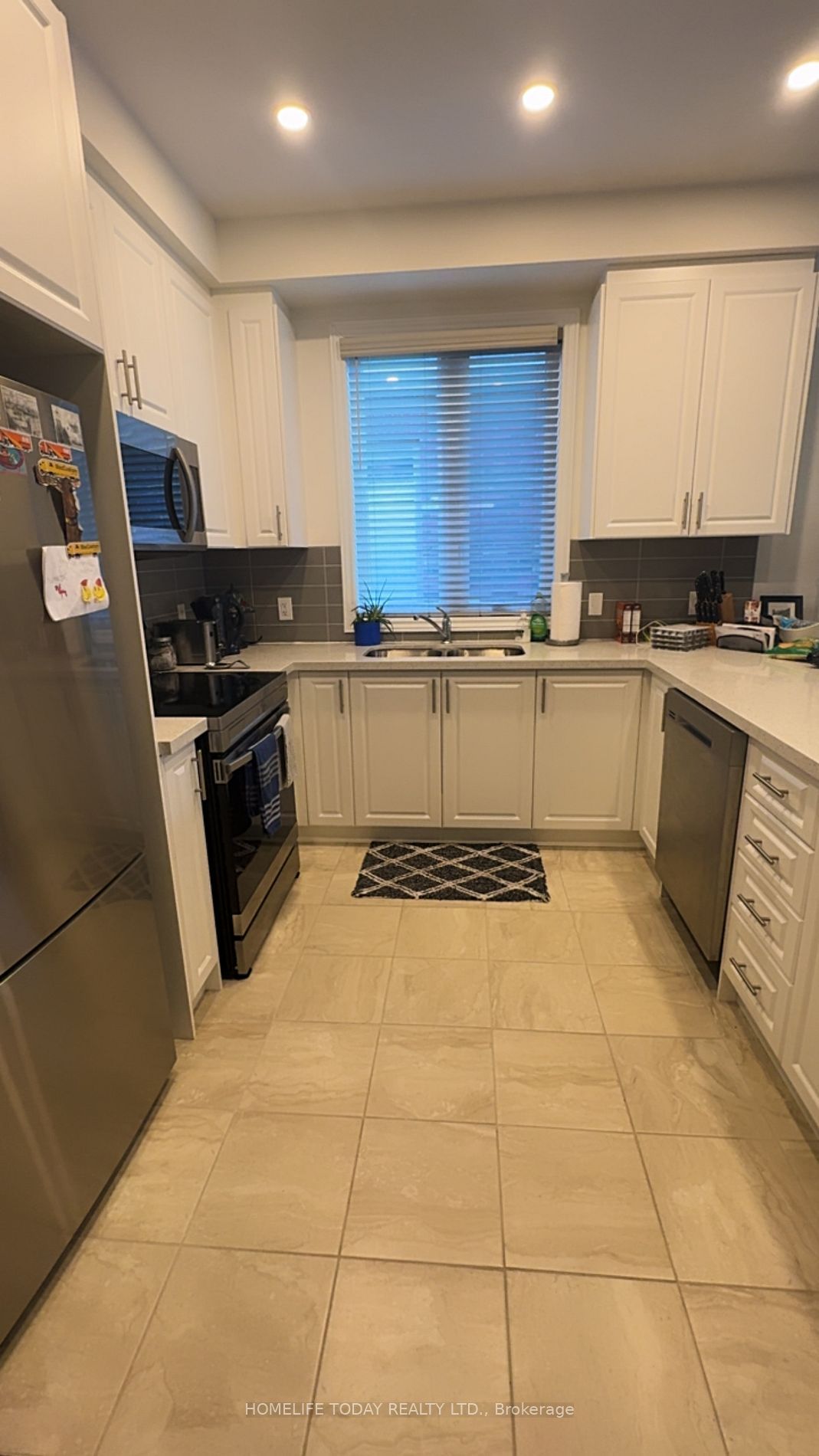 • Modern kitchen with stainless steel appliances and breakfast area.