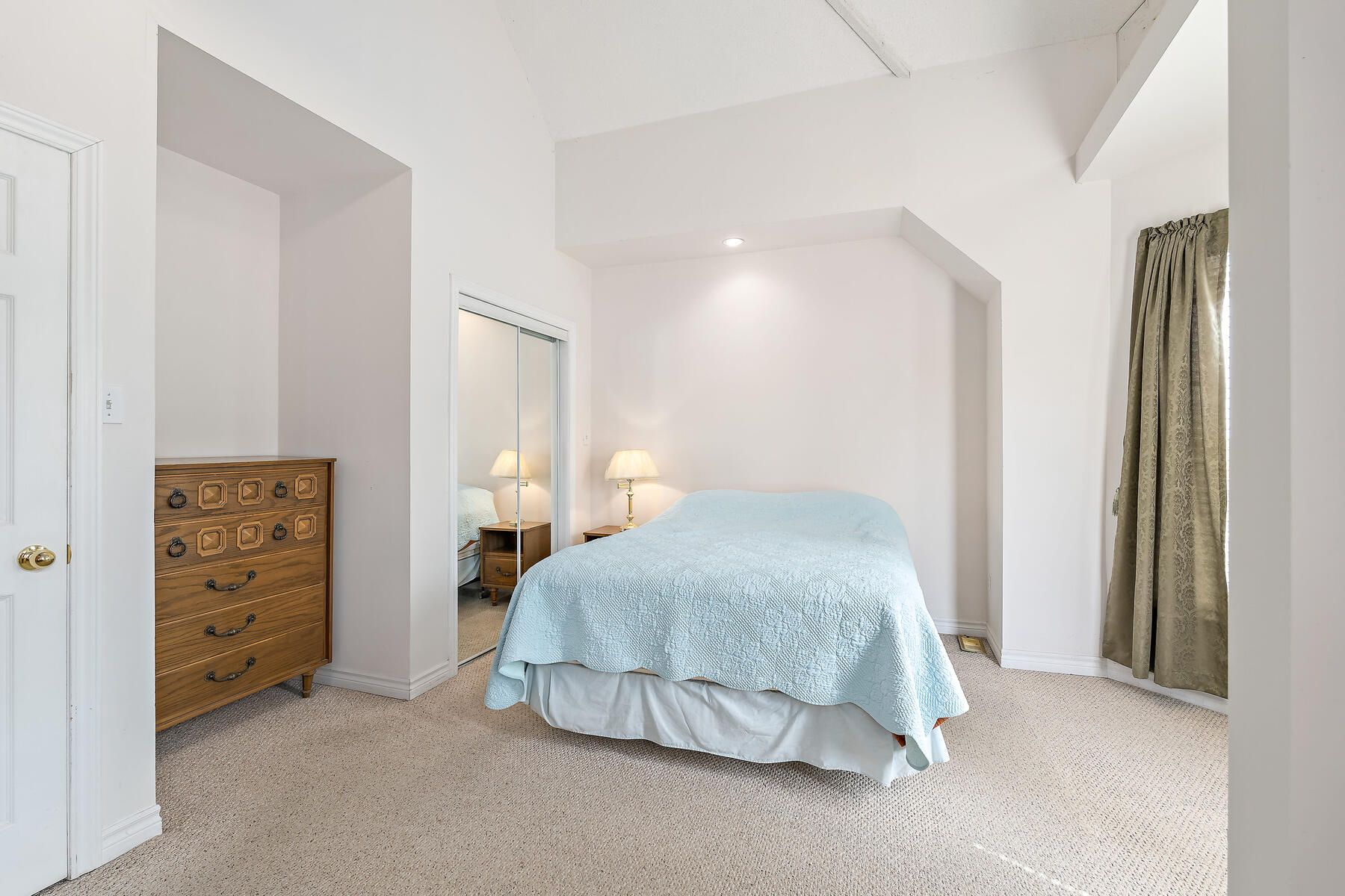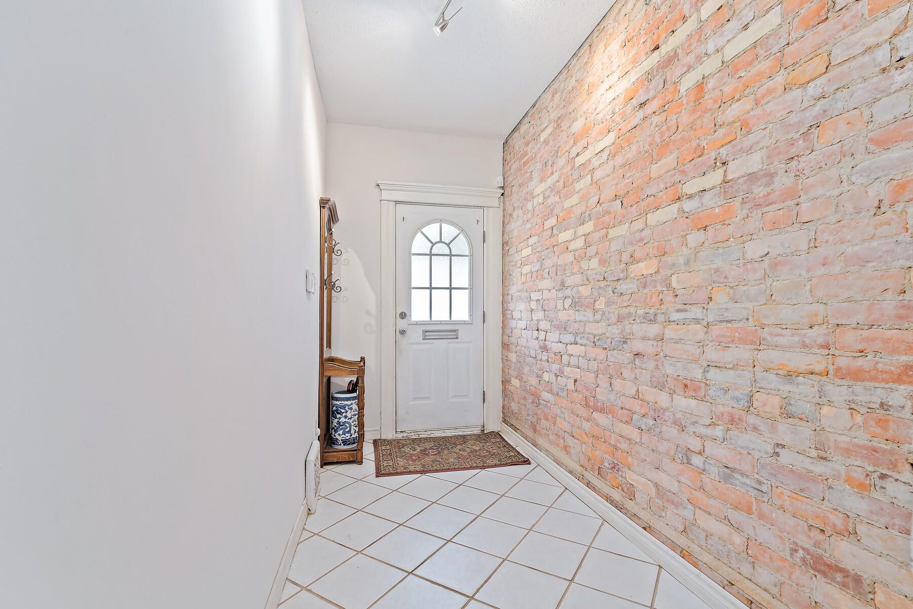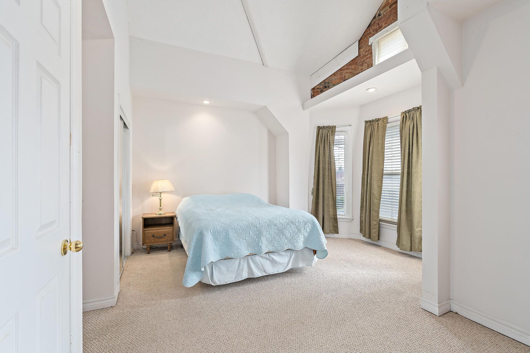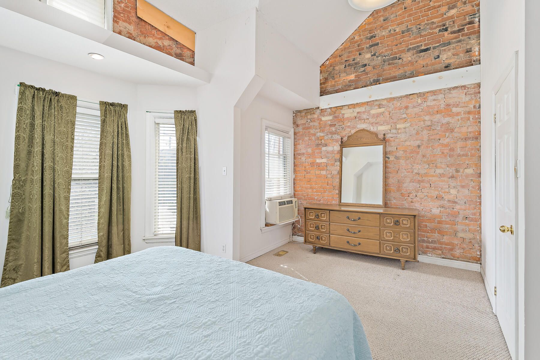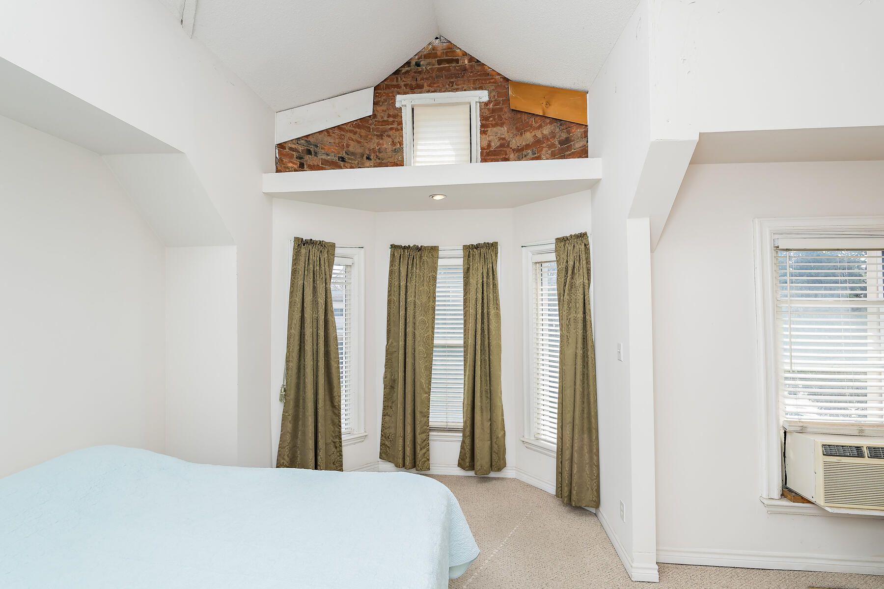 • Primary bedroom has a striking cathedral ceiling and exposed brick.