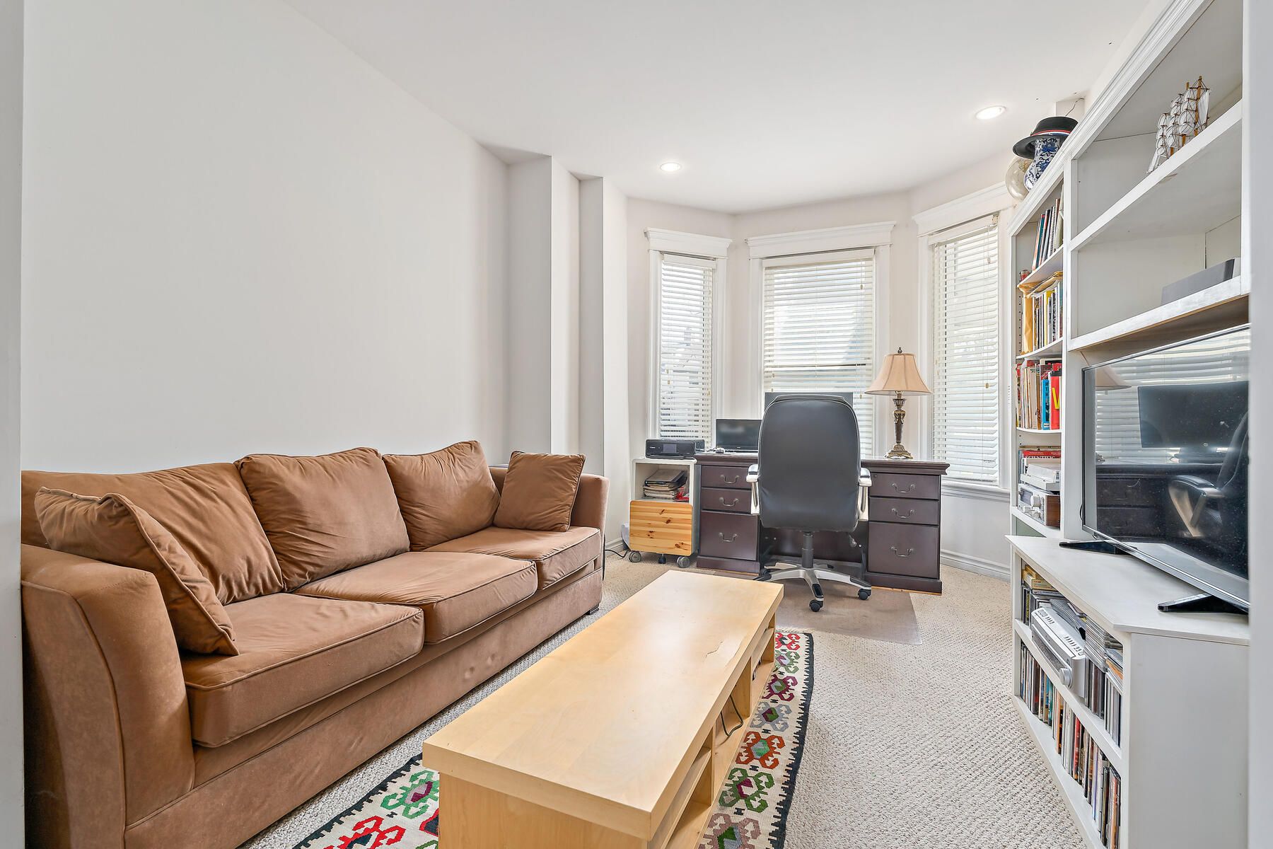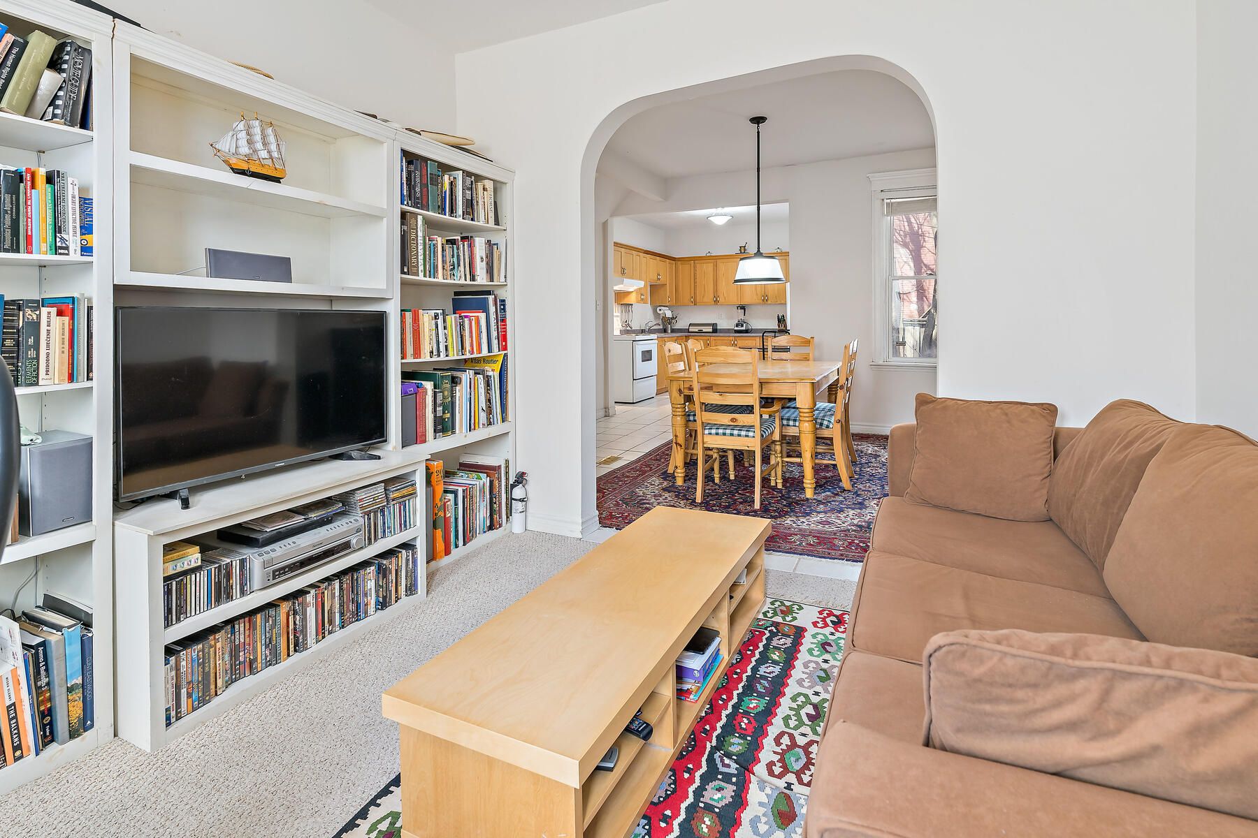 • Living room features a built-in library for book lovers.