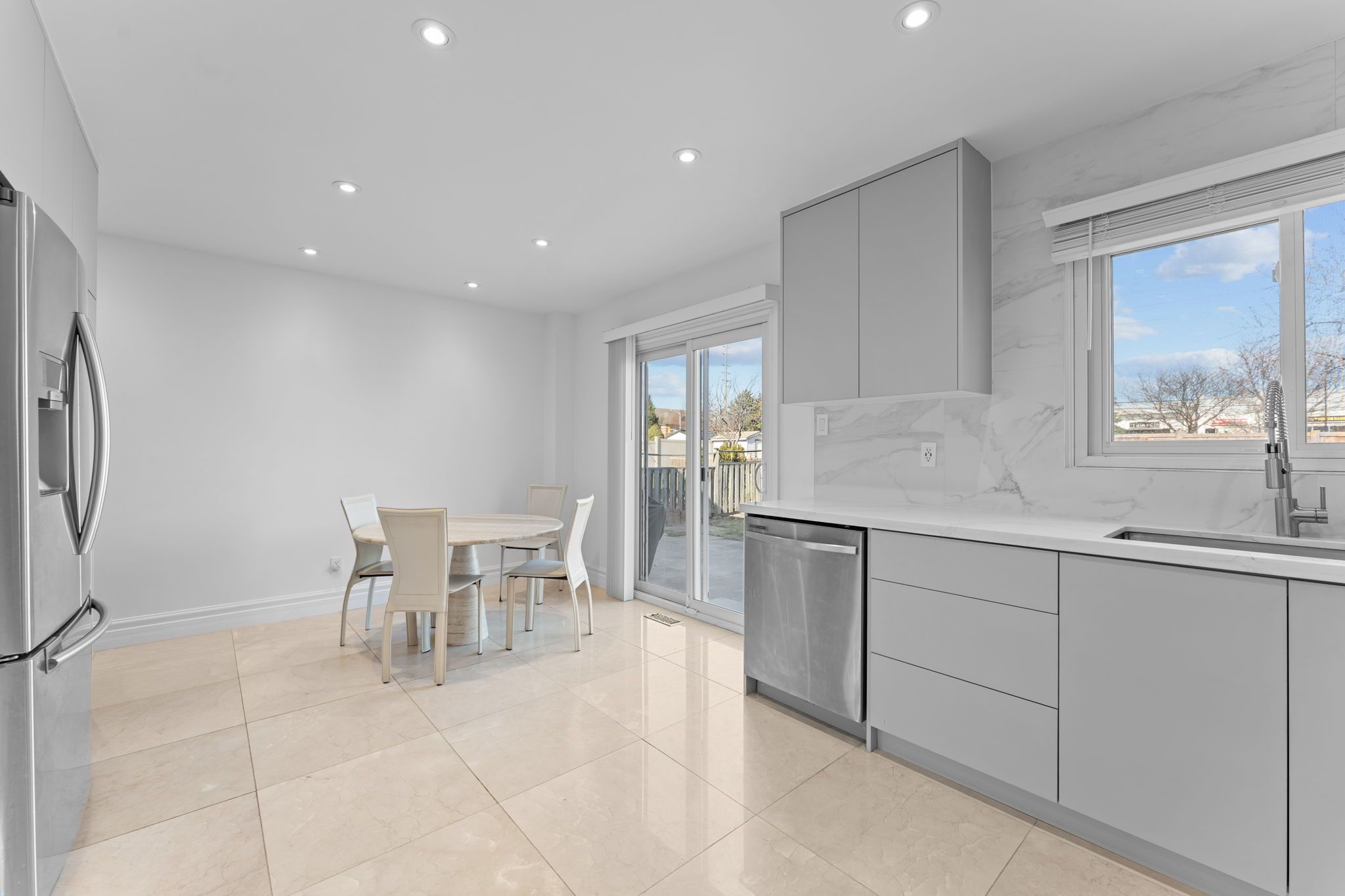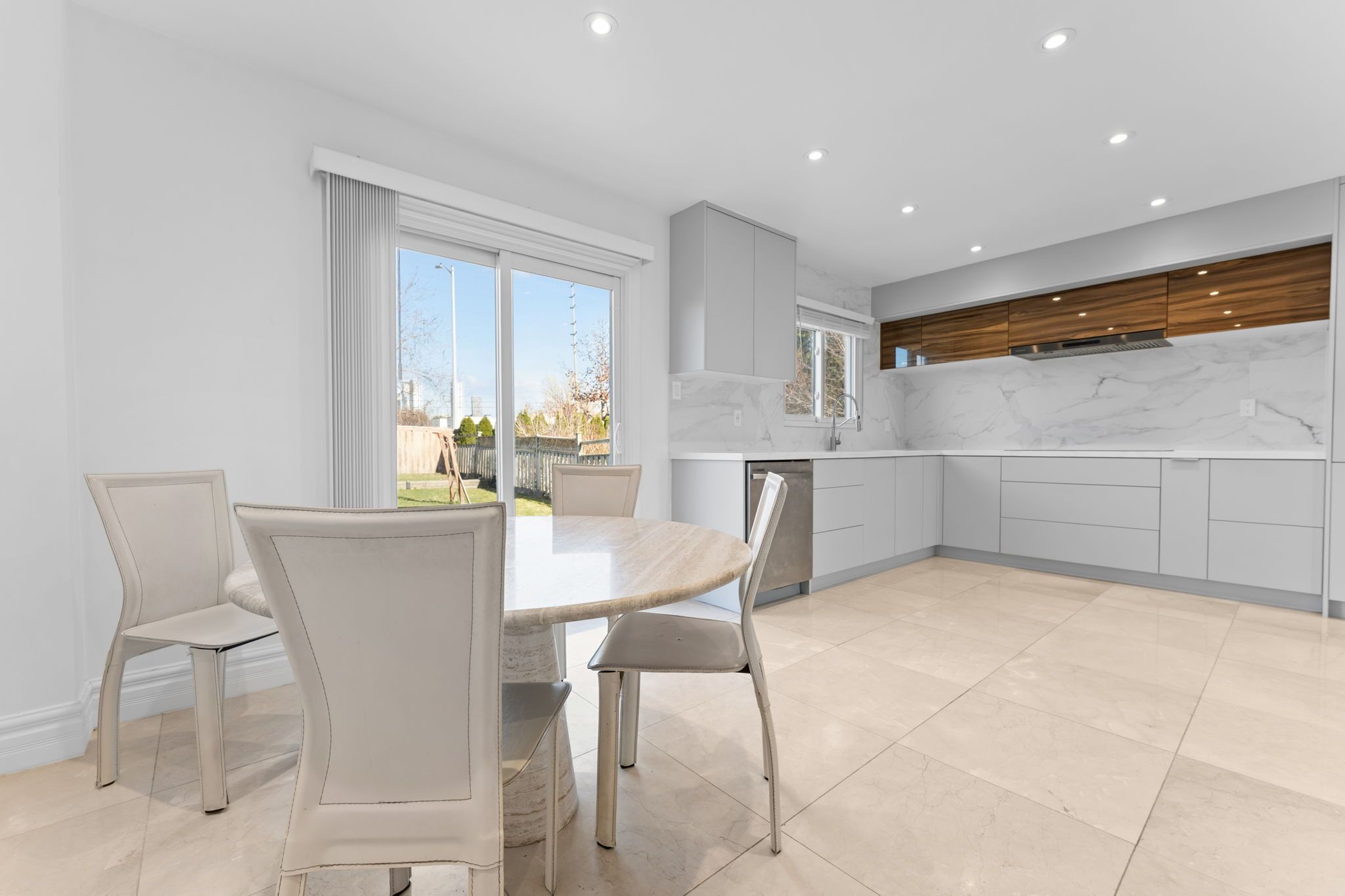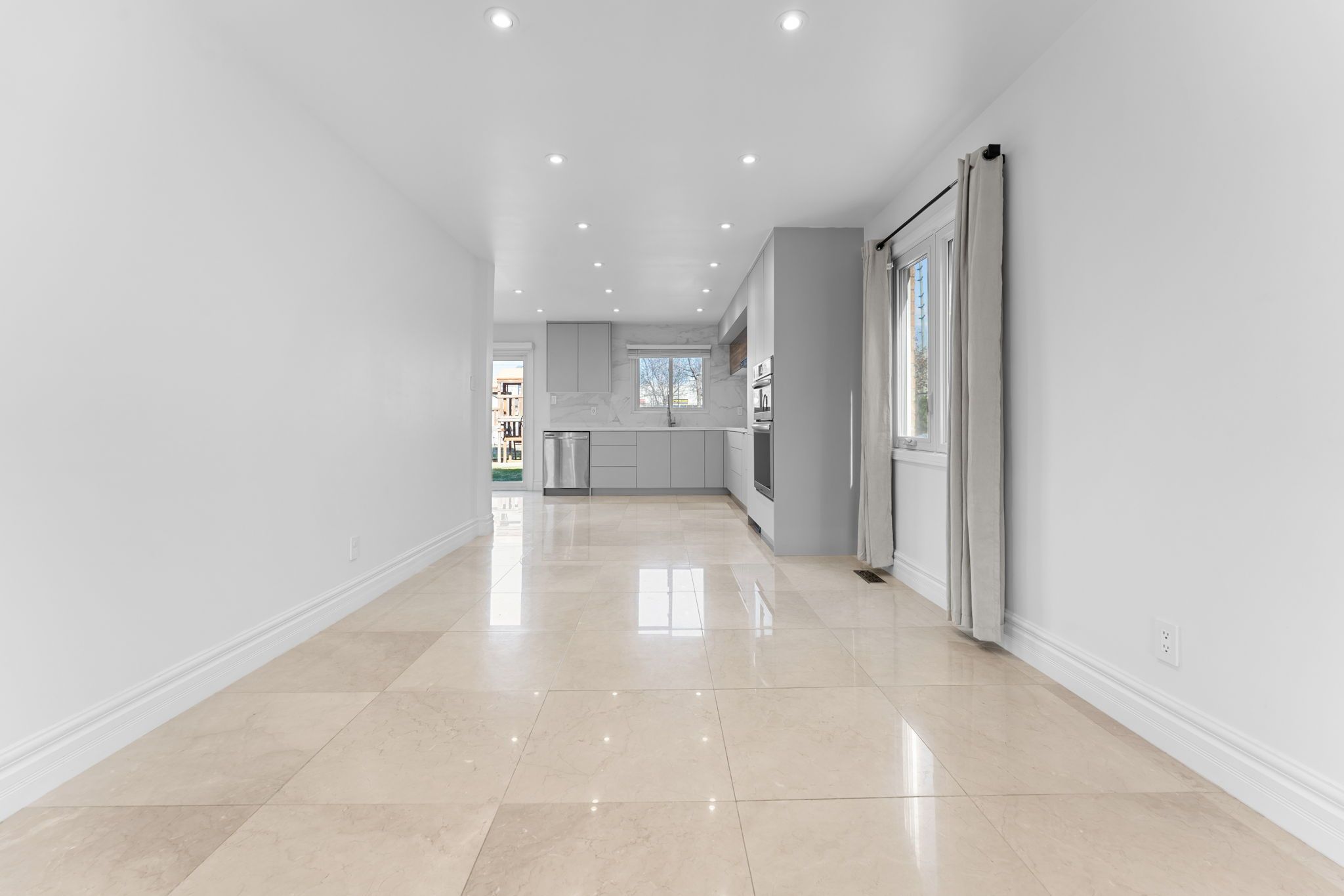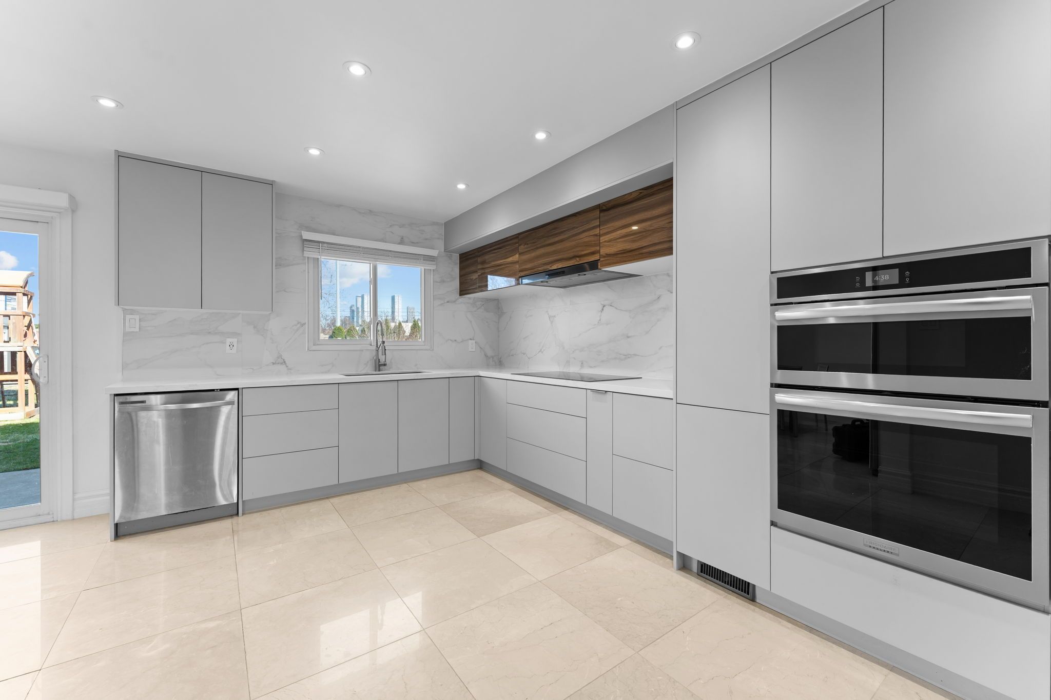 Beautifully renovated detached residence in sought-after east woodbridge, set on a premium lot offering privacy with no homes directly behind. Boasting 3,275 sq. Ft. Of total living space and over $250k in upgrades, this move-in ready home has been thoughtfully reimagined with timeless finishes and modern design. The entire main floor is finished in elegant carrara marble, setting a luxurious tone throughout the main level. Enhanced with pot lights, the home feels bright, polished, and refined. At the heart of the home is a stunning all-new kitchen featuring brand new custom cabinetry and high-end built-in oven and microwave appliances. New interior doors on the main and upper levels, upgraded hardwood floors, smooth ceilings, and a seamless open-concept layout further elevate the home's appeal. The redesigned staircase with sleek matte black metal balusters adds a refined modern touch, while renovated washrooms with double vanities bring both style and function. Spacious principal rooms, samsung laundry appliances, and a private backyard complete with a built-in playground make this exceptional home ideally suited for family living and entertaining. Conveniently located close to schools, parks, shopping, and major highway access.