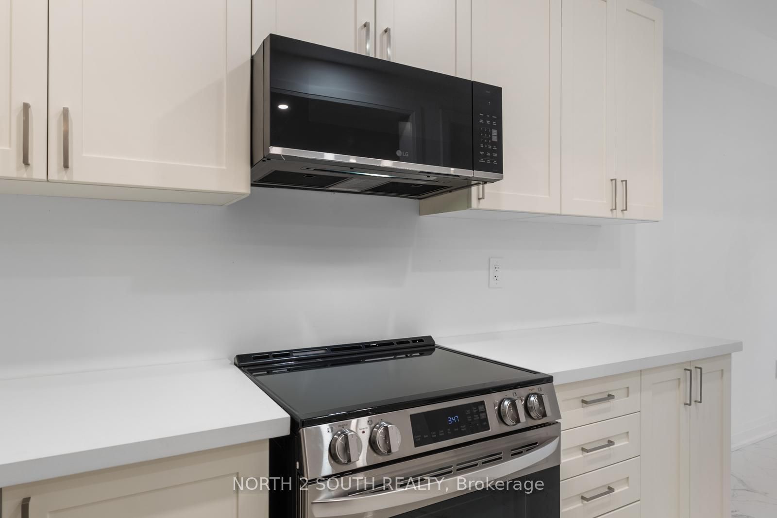 • Upgraded kitchen featuring tall cabinets and quartz countertops.