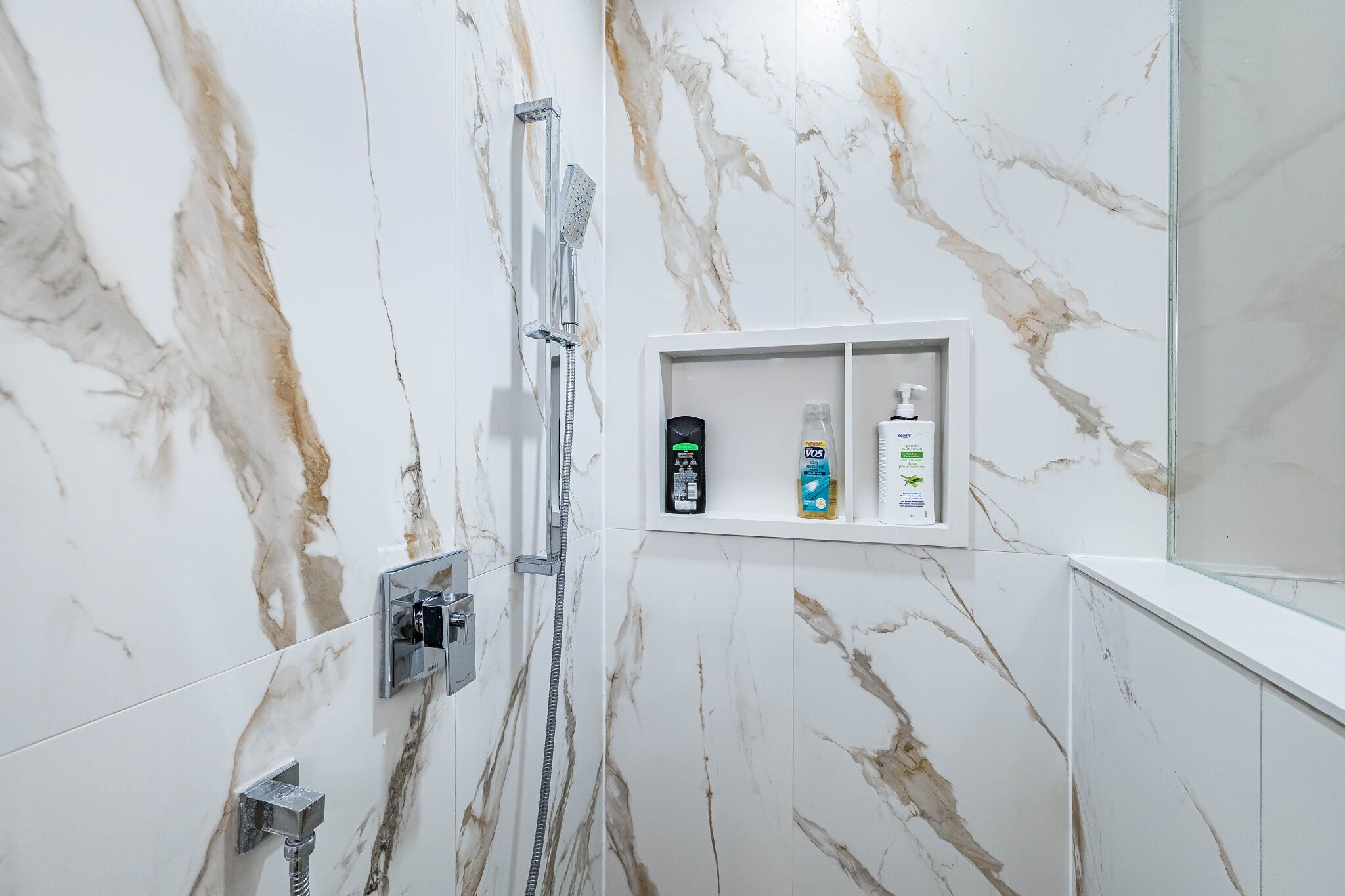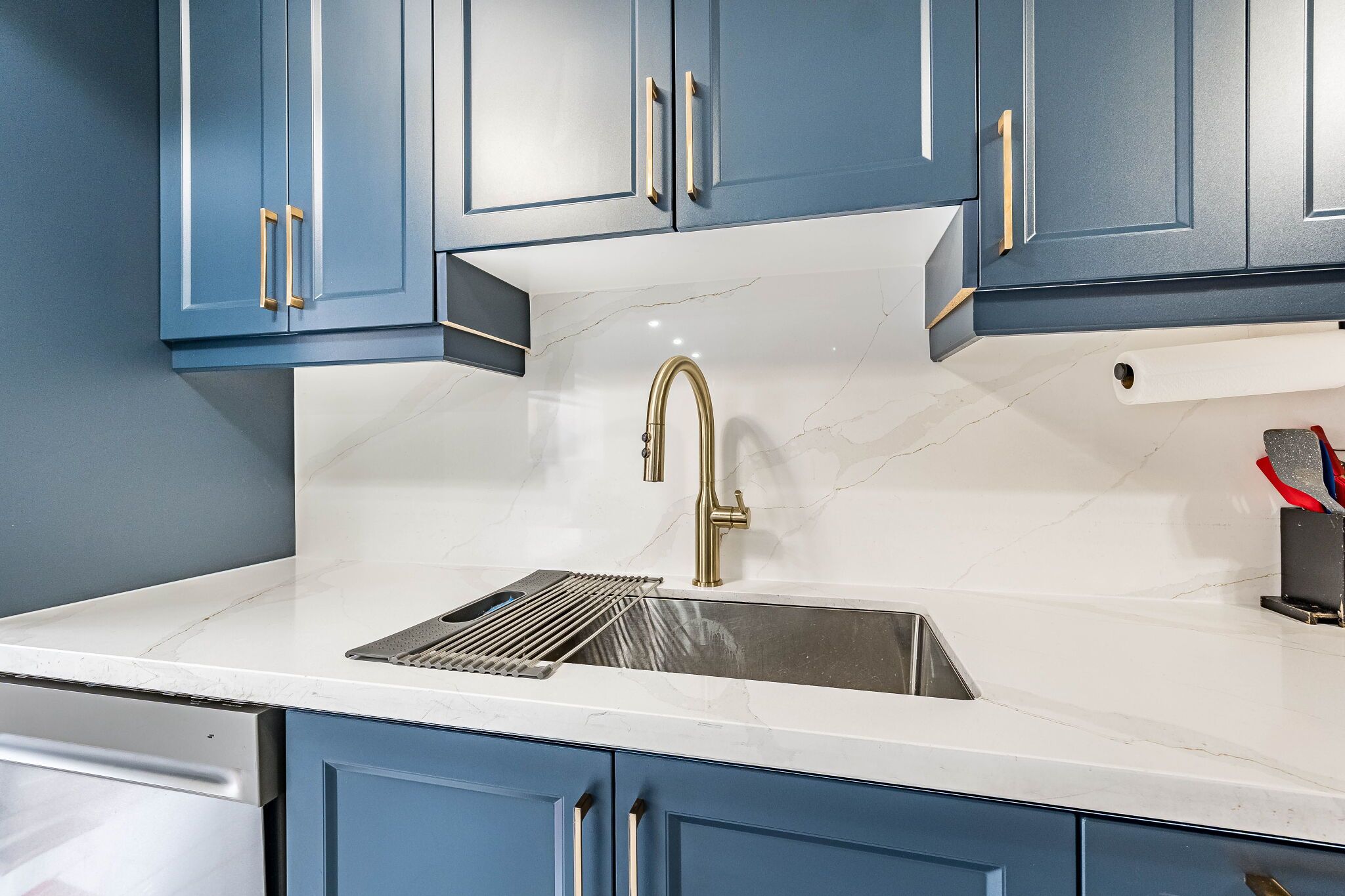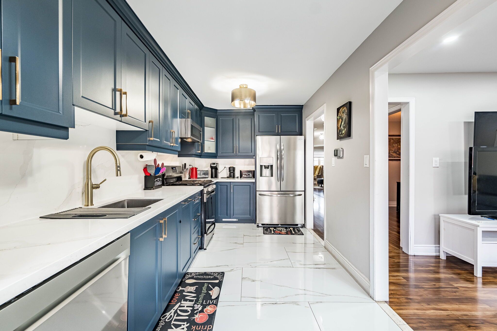 • Stylish kitchen with custom cabinetry and stainless steel appliances.