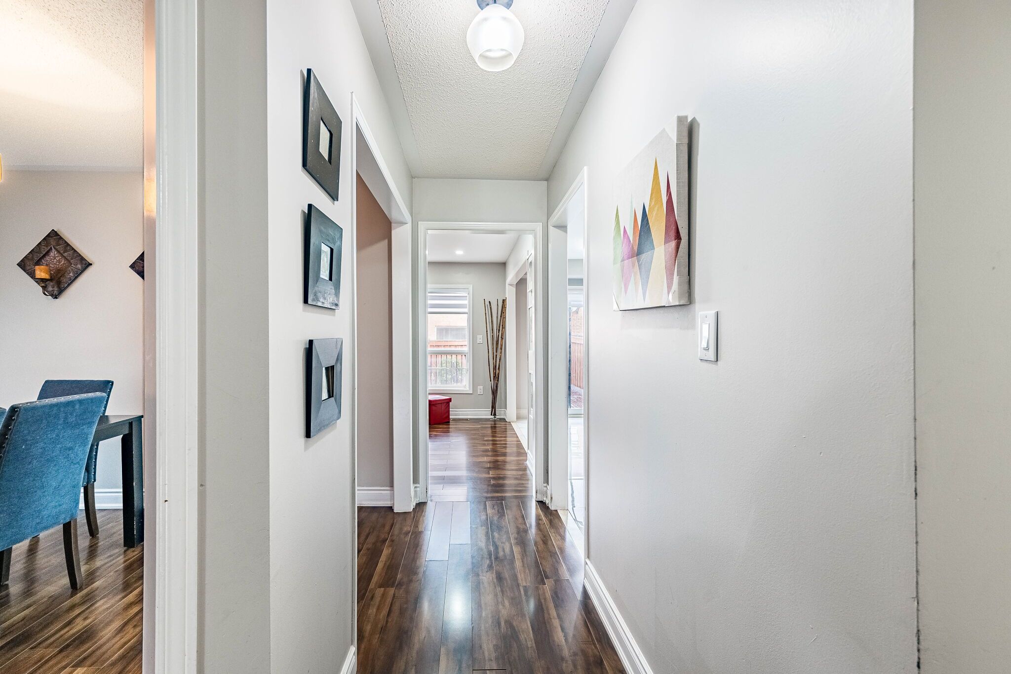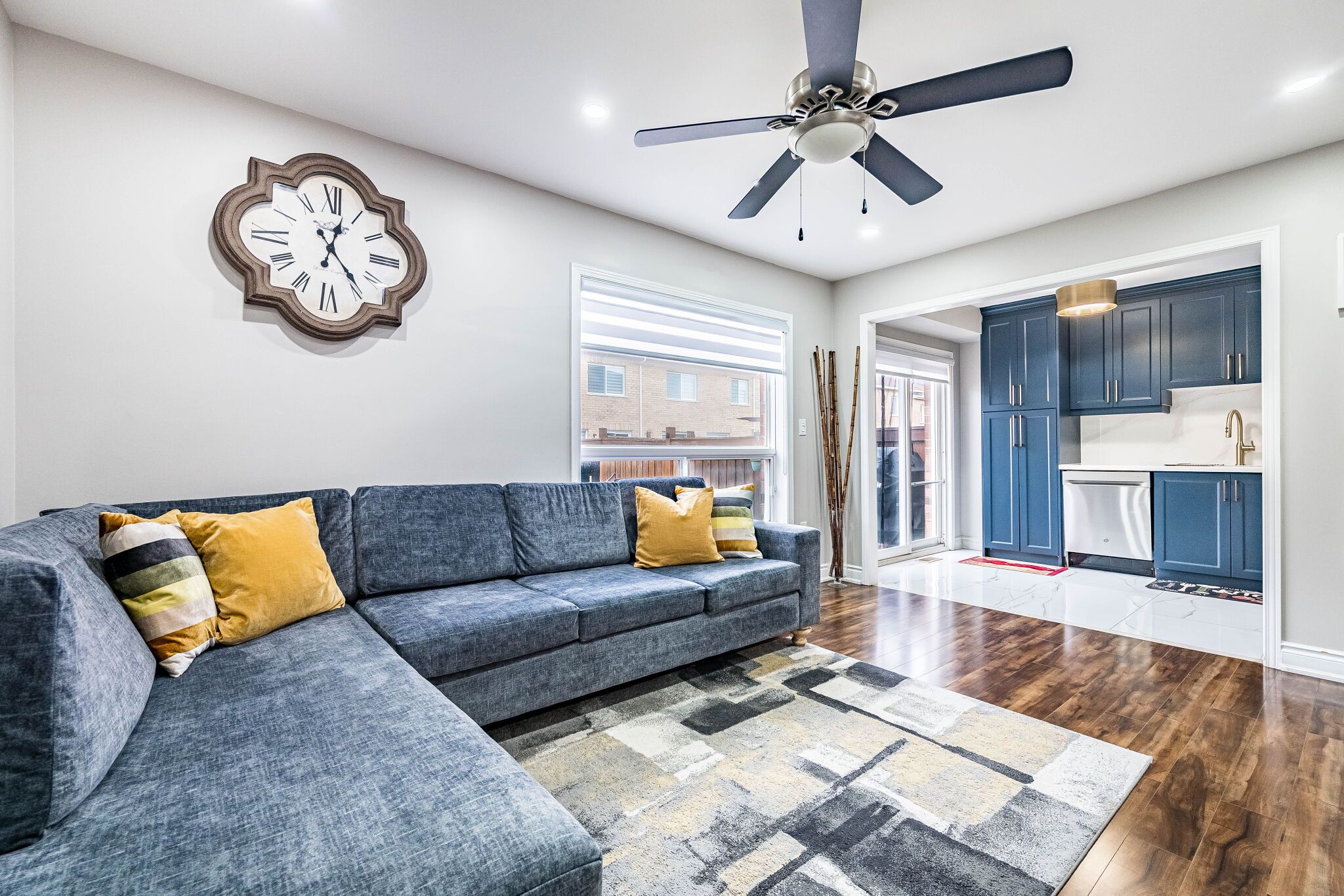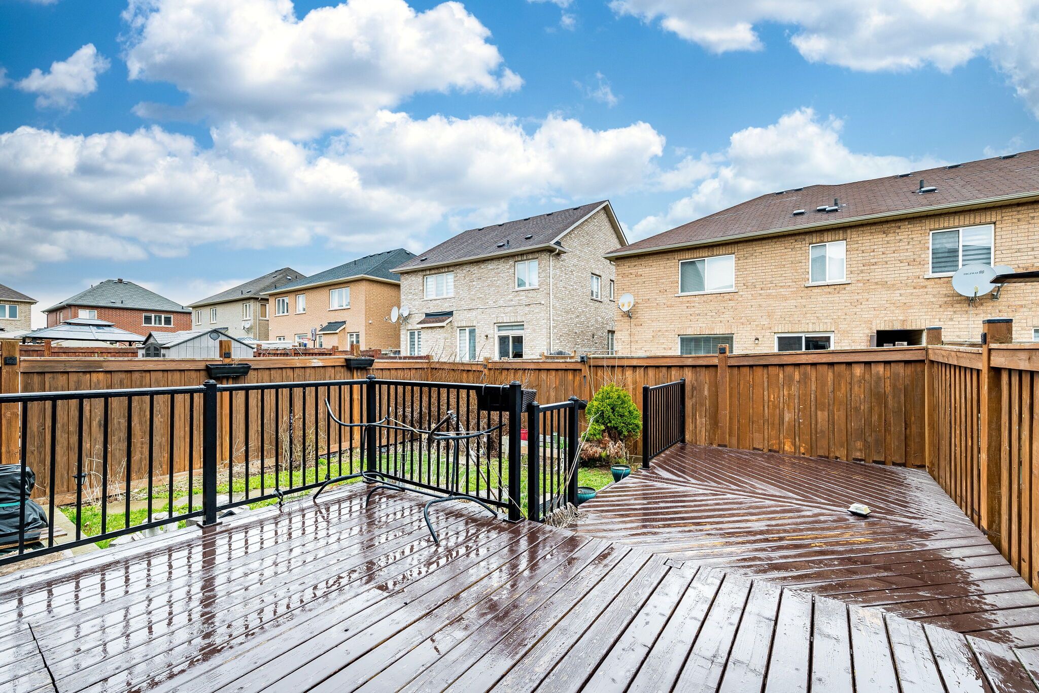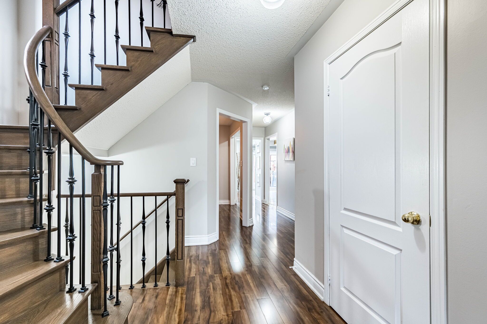 Welcome to 27 wall street in north brampton, a beautifully renovated luxury end-unit townhome offering style, comfort, and exceptional value in a desirable family-friendly location. Fully updated from top to bottom above grade, this home is truly move-in ready and designed to impress from the moment you walk in. The bright and spacious layout features separate principal rooms, modern décor, clean finishes, and a warm, inviting atmosphere throughout. With no carpet, upgraded laminate and ceramic flooring, and a stunning wraparound oak staircase, every detail has been carefully selected for both elegance and everyday function. The renovated kitchen showcases custom cabinetry, quartz countertops, stainless steel appliances, a gas stove, built-in microwave, and tasteful finishes that make the space ideal for cooking, entertaining, and family living. The luxury continues into the bathrooms, where quartz countertops add a refined and consistent touch throughout the home. Step outside to enjoy a private walk-out to a large triple-level deck and fully fenced yard, perfect for summer gatherings, quiet evenings, children, pets, or additional outdoor living space. As an end-unit townhome, this property offers extra privacy, added natural light, and a more spacious feel compared to many traditional townhomes. Additional features include a separate entrance to the garage, partial basement space, stainless steel fridge, dishwasher, washer, dryer, and major mechanicals, including the water heater, furnace, and air conditioner - all paid for. Elegant, upgraded, and ready for its next owner, 27 wall street is an excellent opportunity for buyers looking for a renovated home in north brampton with modern finishes, functional living space, and strong long-term value.