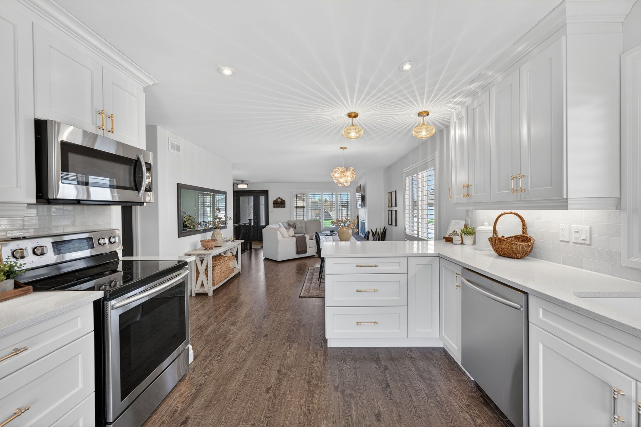 • Modern kitchen featuring sleek Quartz countertops and stainless steel appliances.