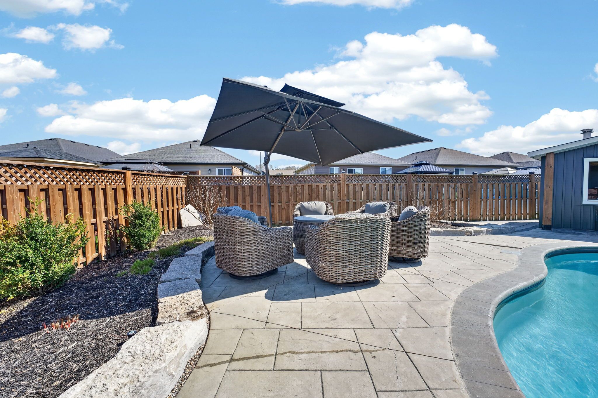 • Private backyard oasis with a heated saltwater pool and covered hot tub.