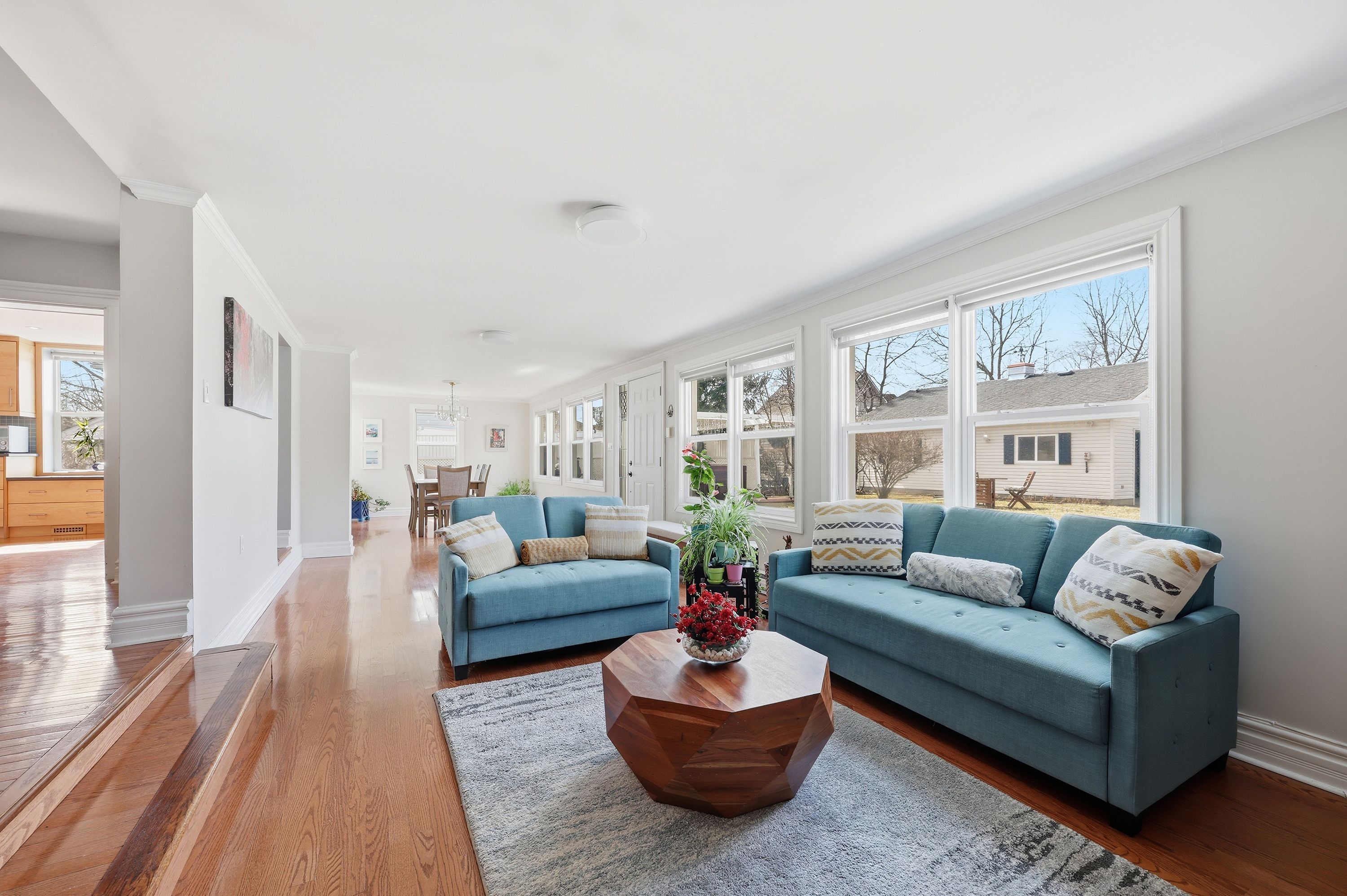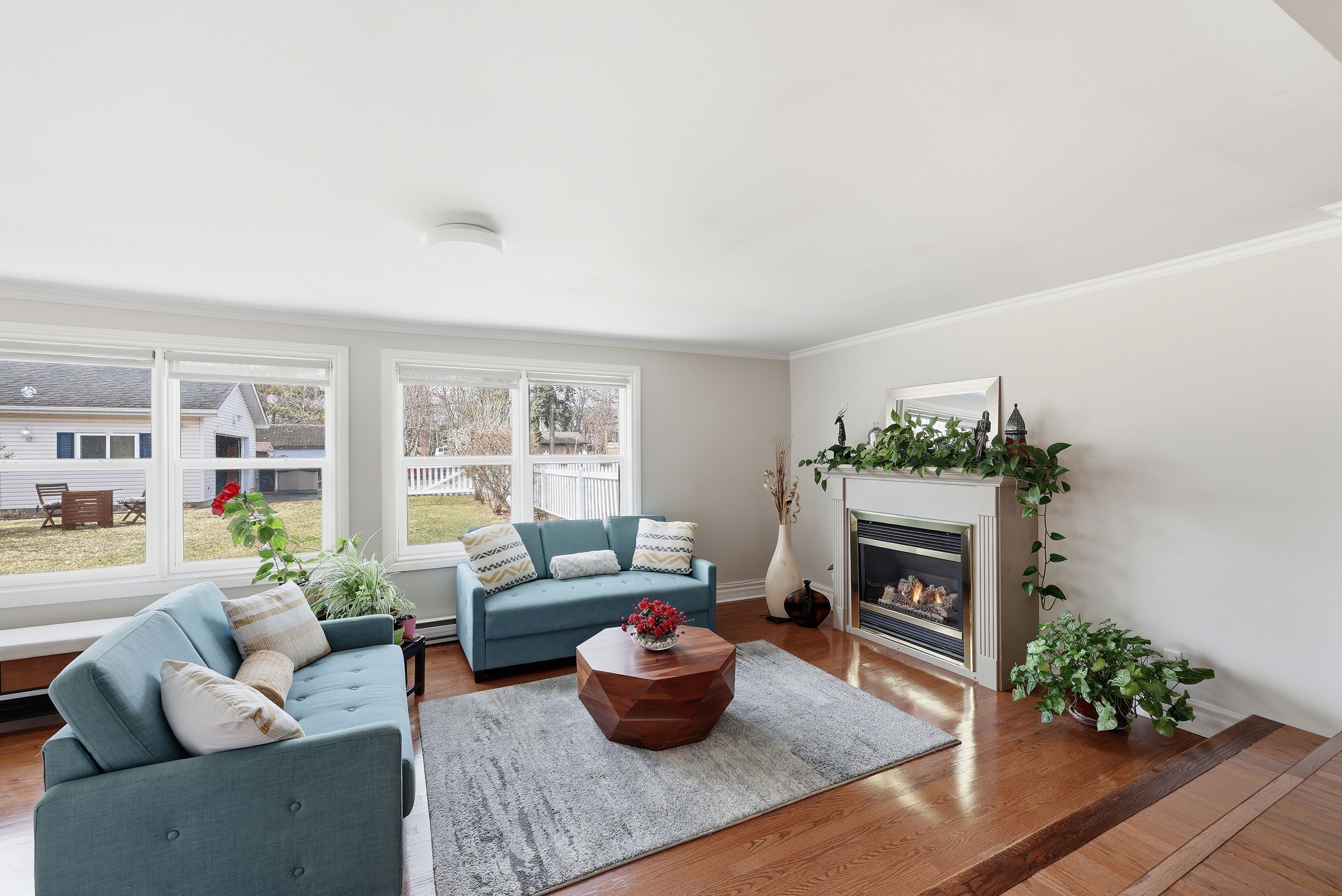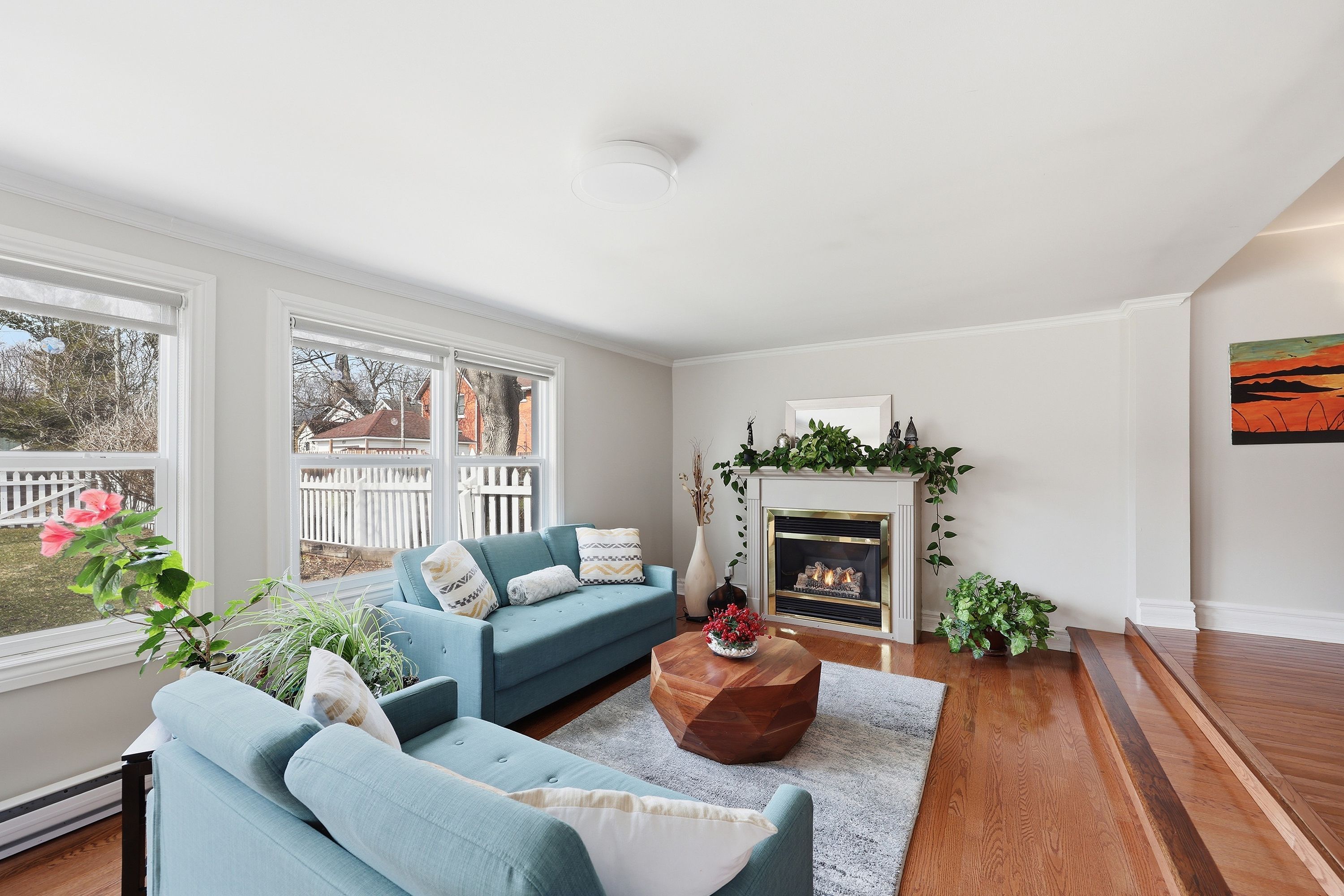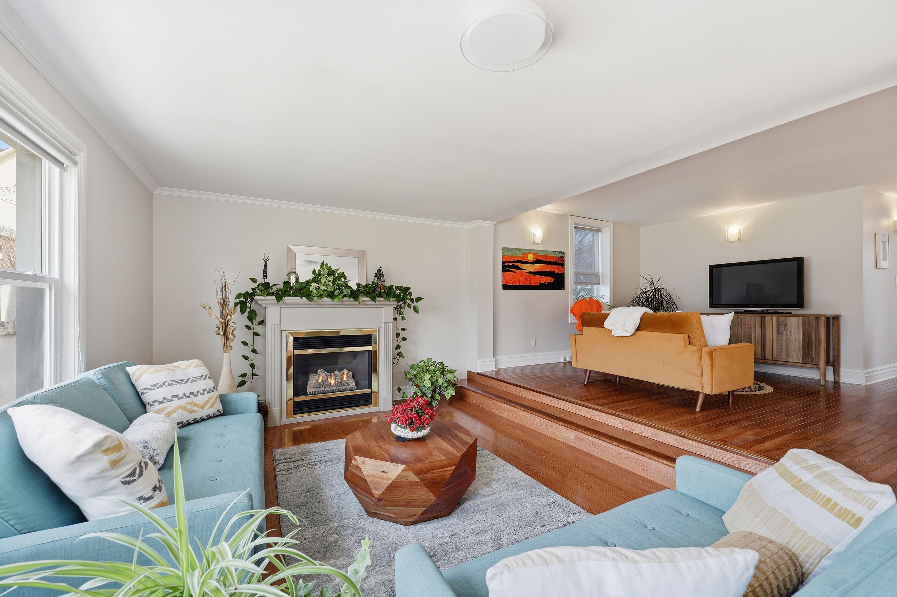• Sunken living and dining room with a cozy fireplace for comfort.