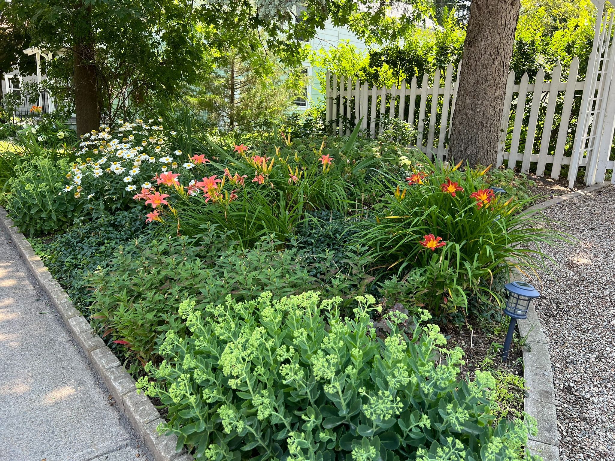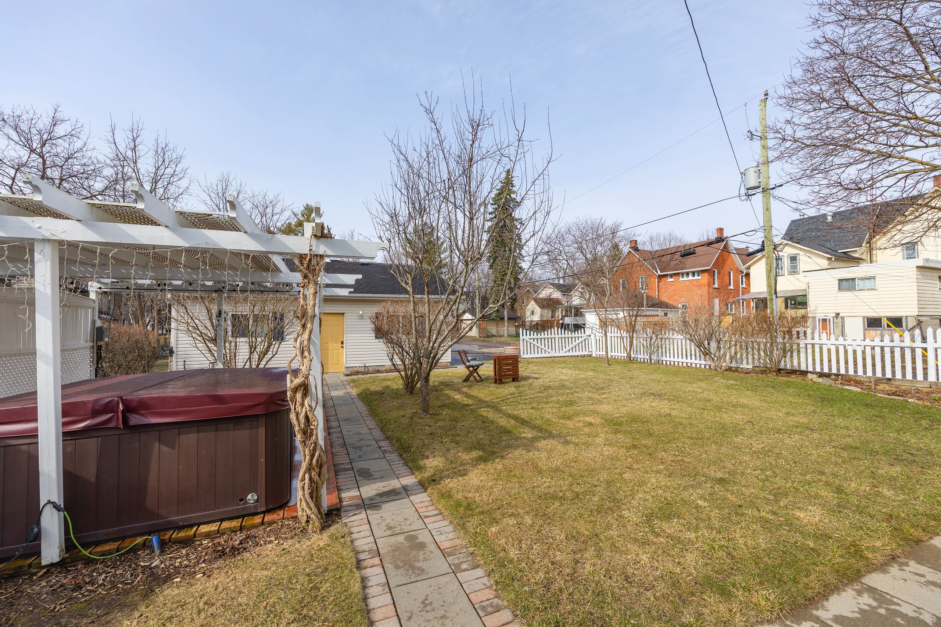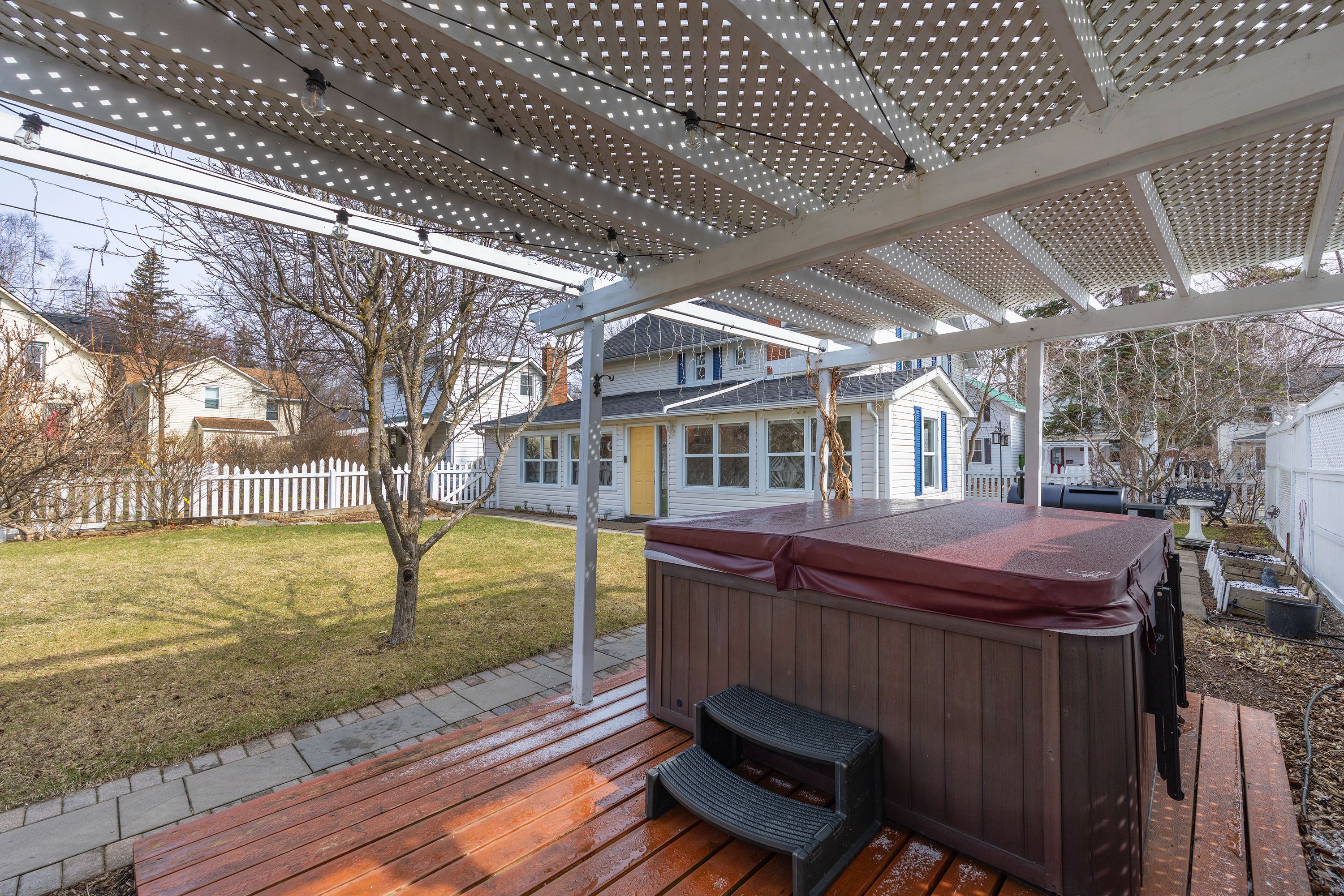 • Beautifully landscaped backyard with a garden, pergola, and hot tub.