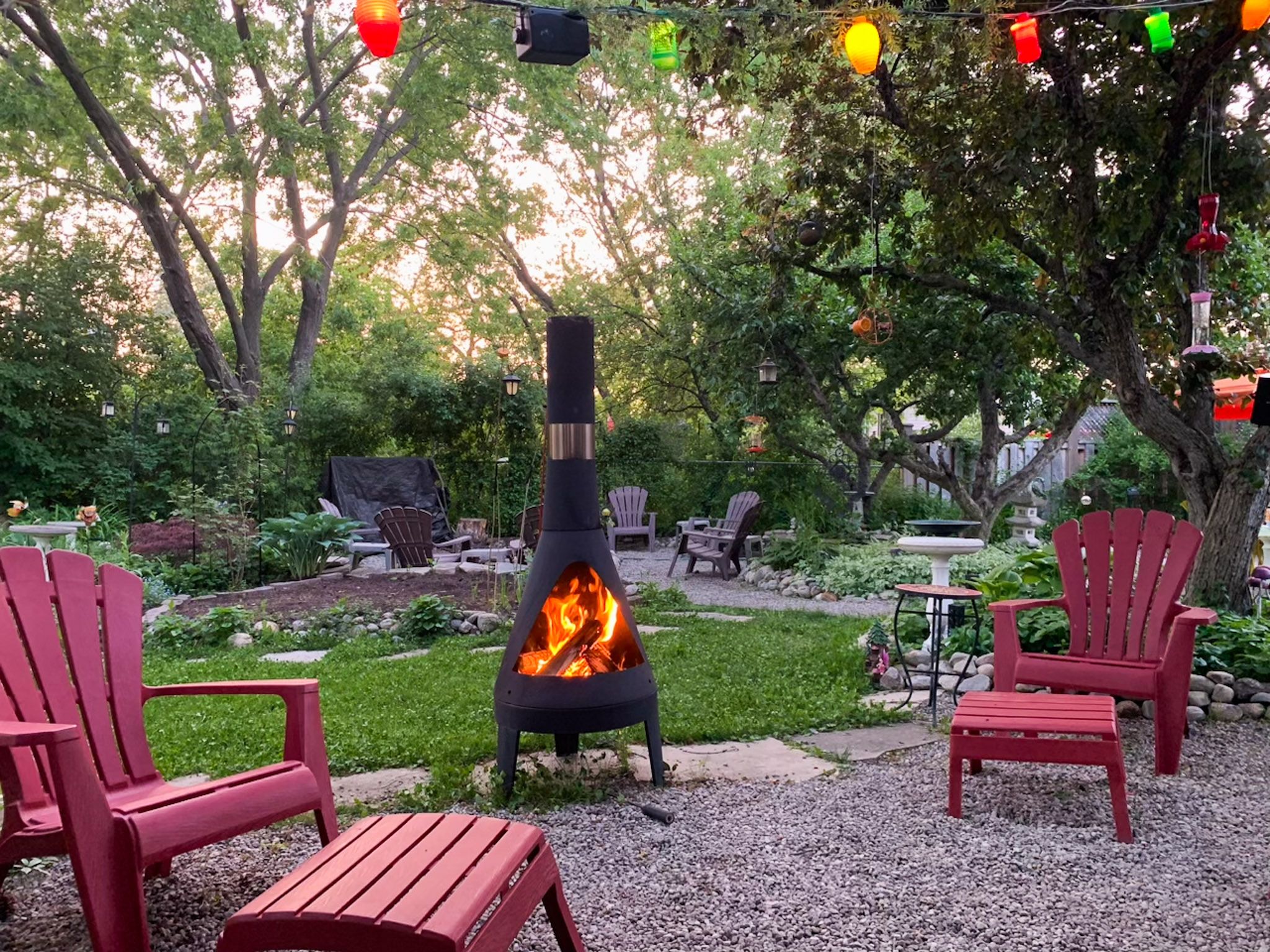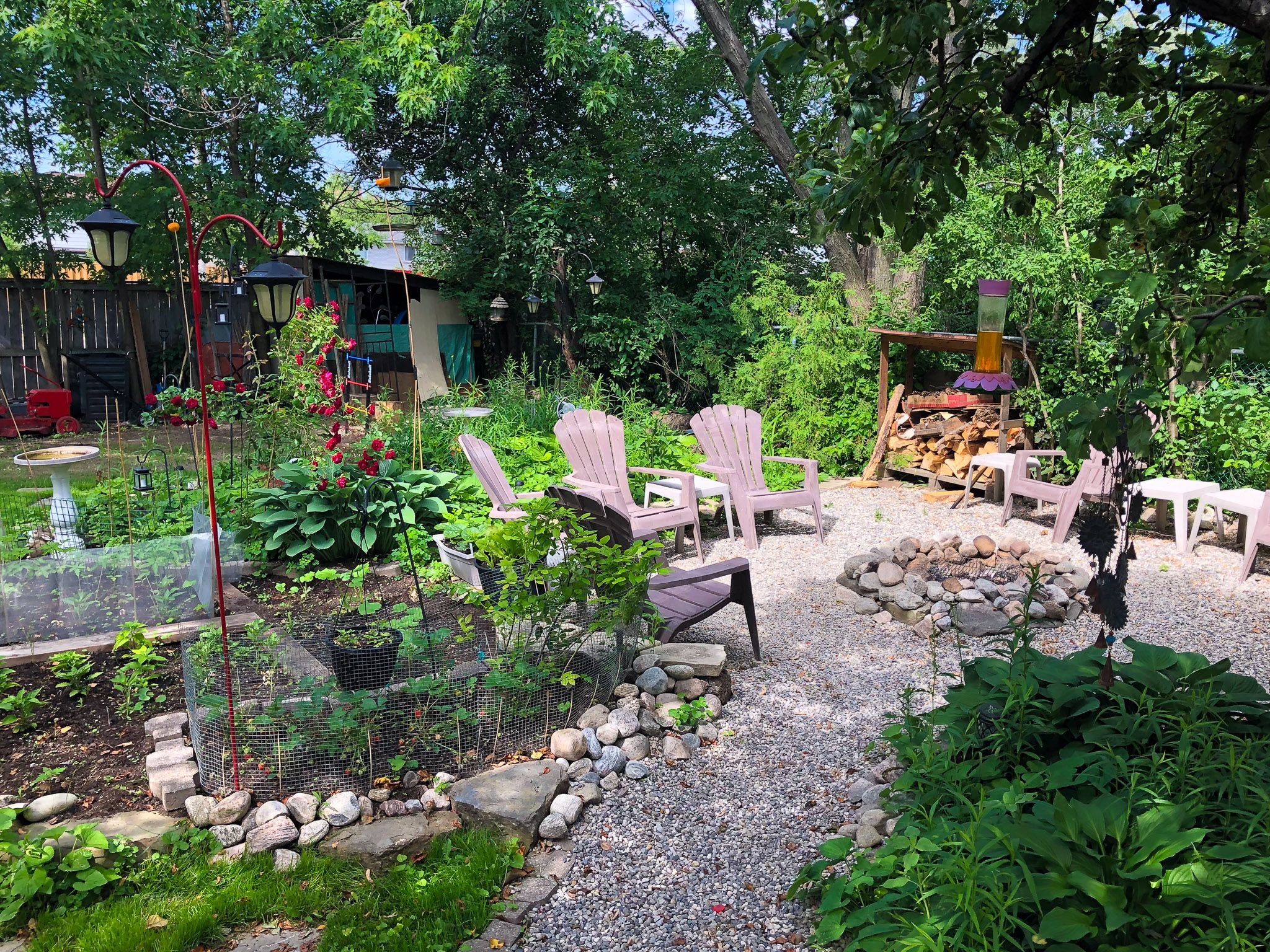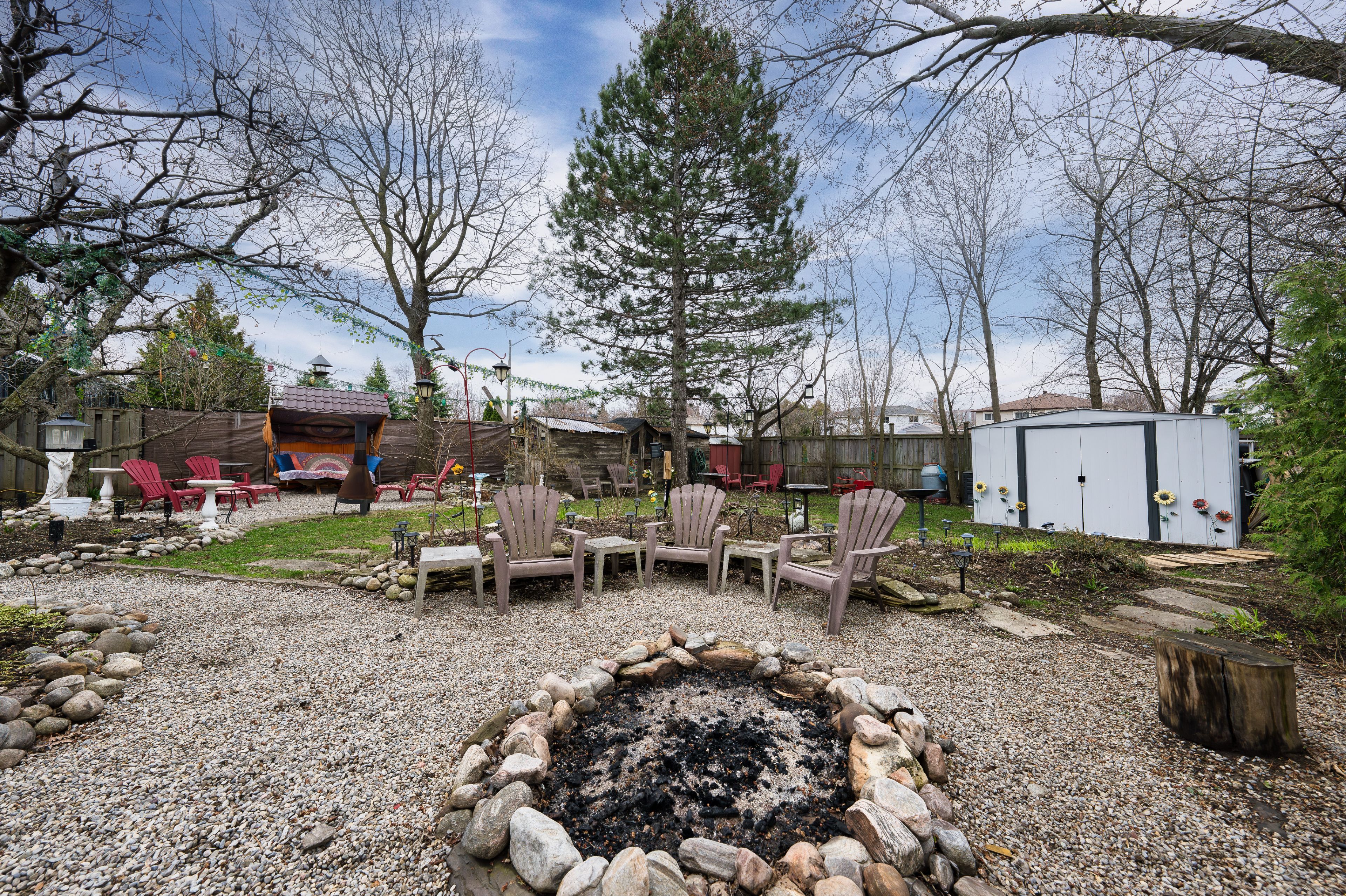 • Large backyard oasis with multiple seating areas, fire pit, and greenspace.