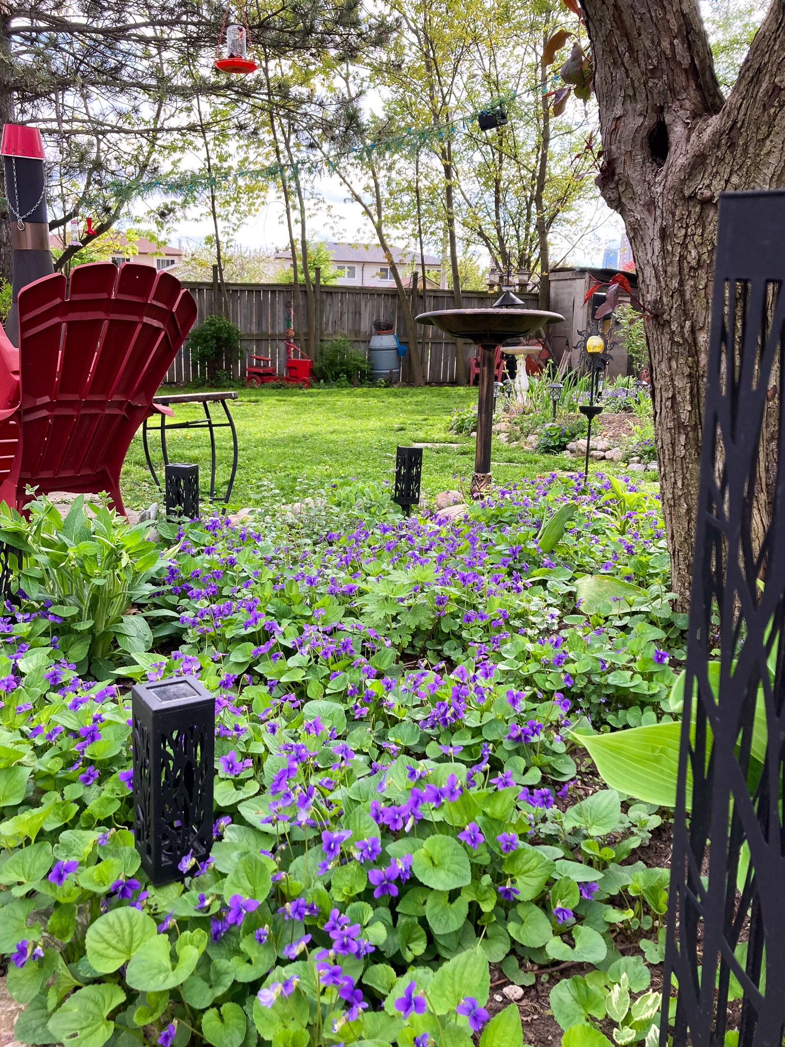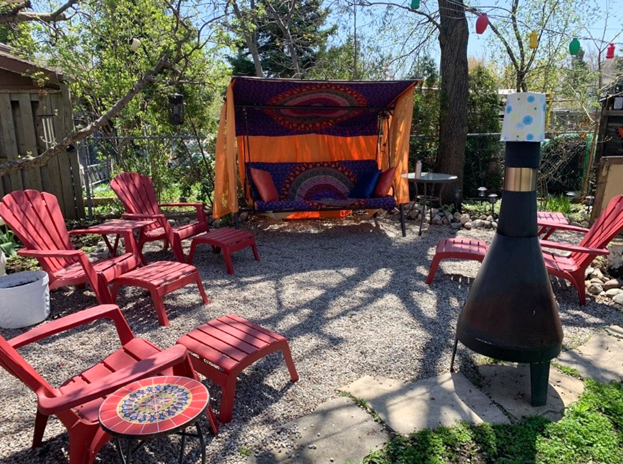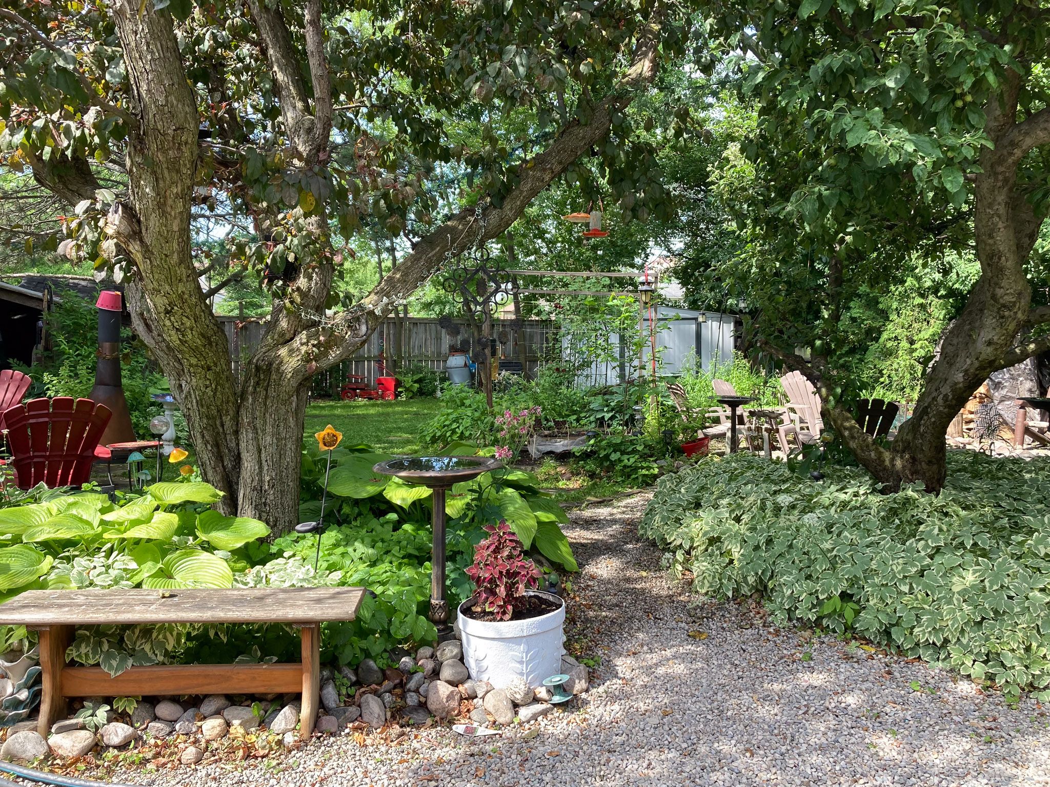 • Large backyard oasis with multiple seating areas, fire pit, and greenspace.