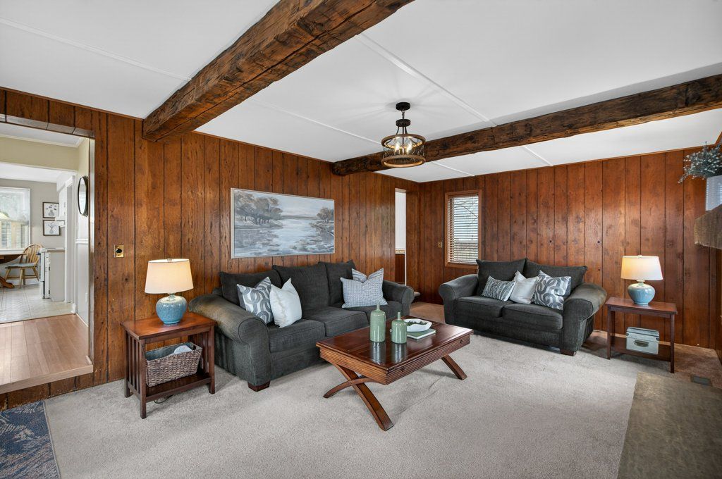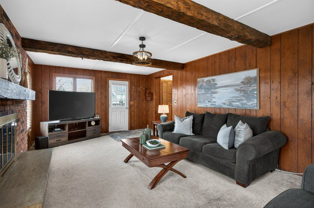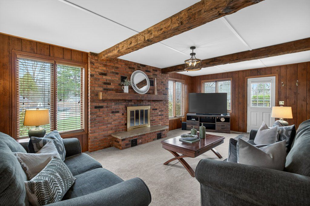 • Bright living spaces with gas fireplace and beamed ceiling.