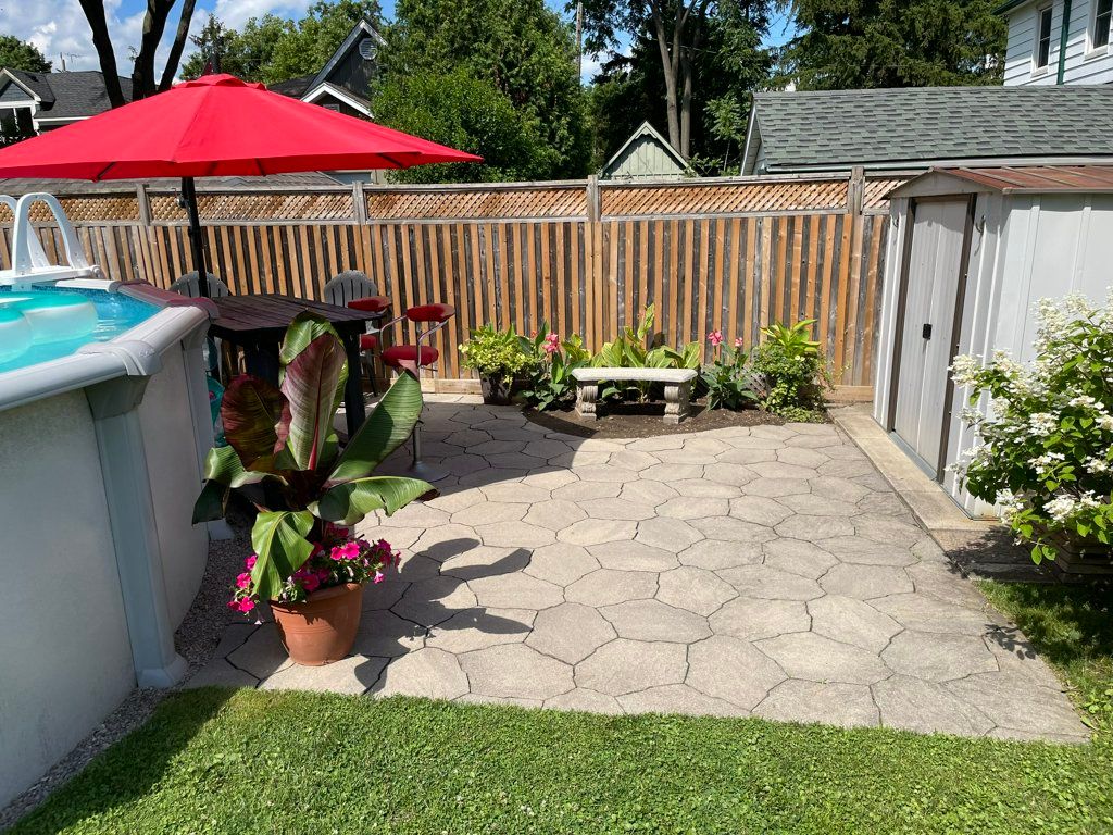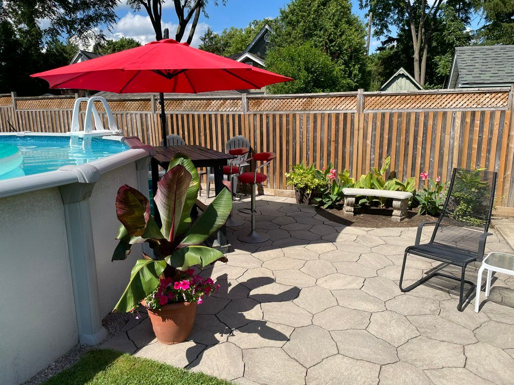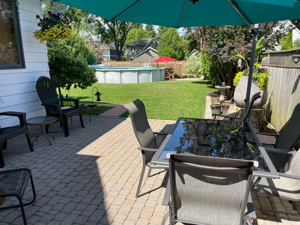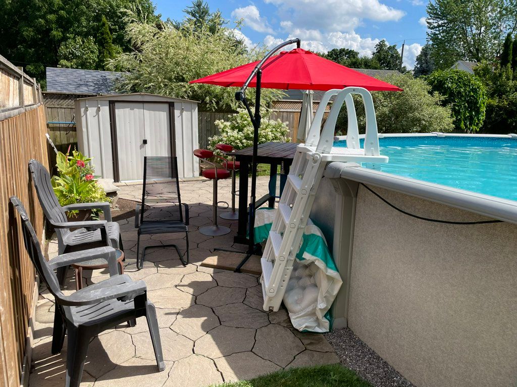 • Enclosed backyard with above ground pool and two patio areas.