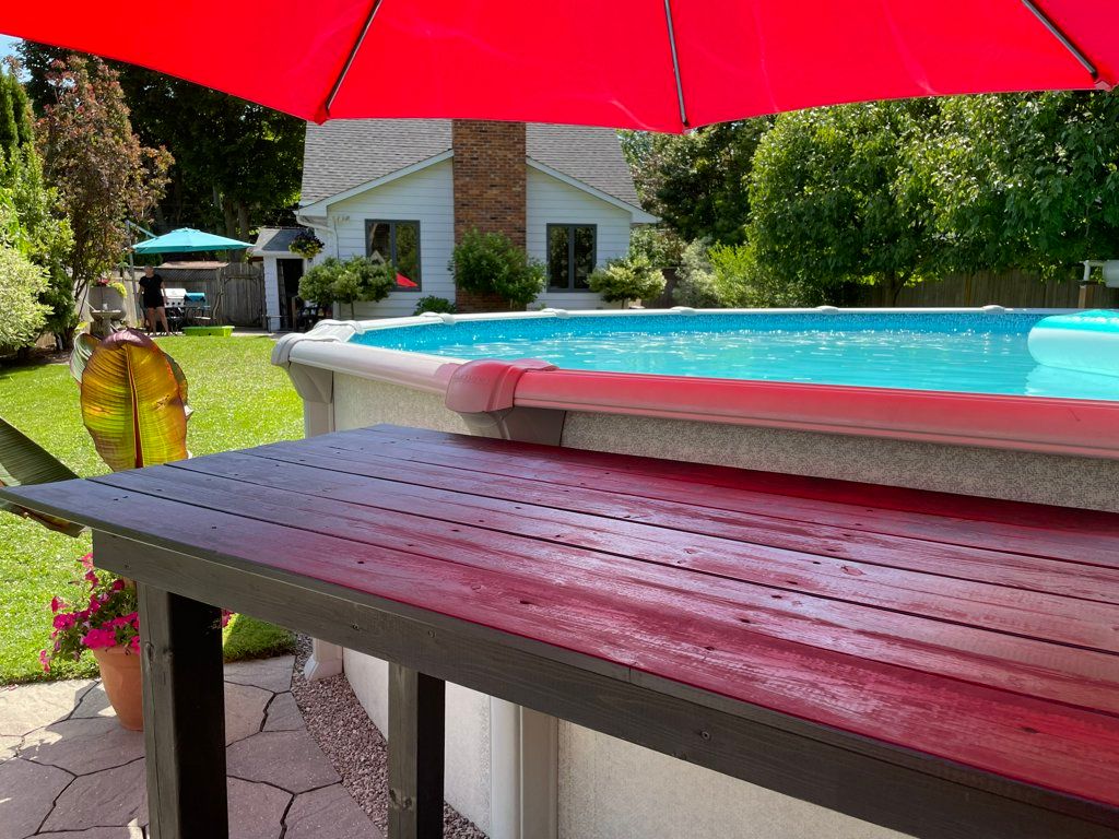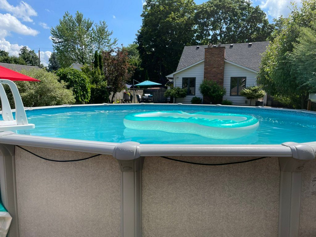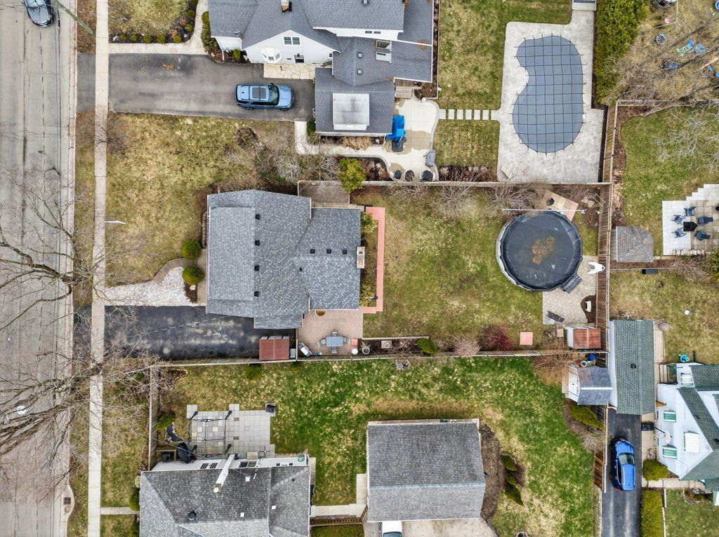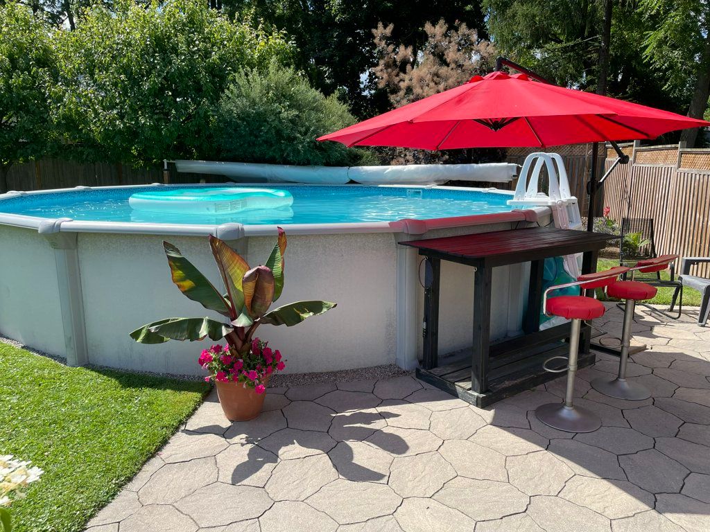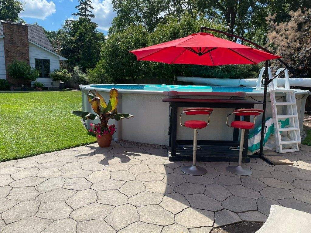 • Enclosed backyard with above ground pool and two patio areas.
