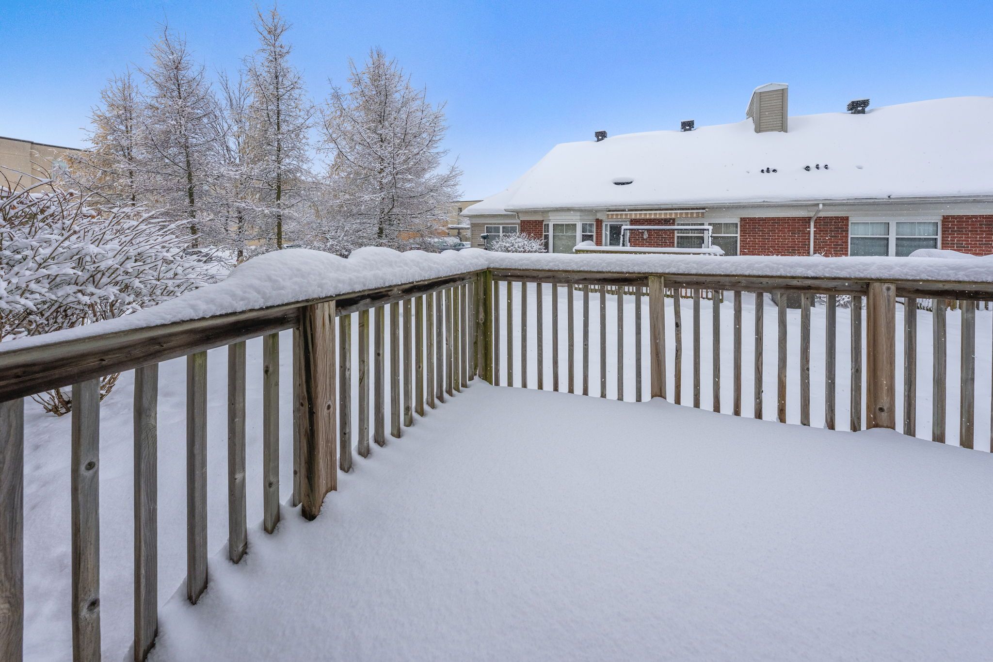 • Open-concept living area with natural light and private deck.