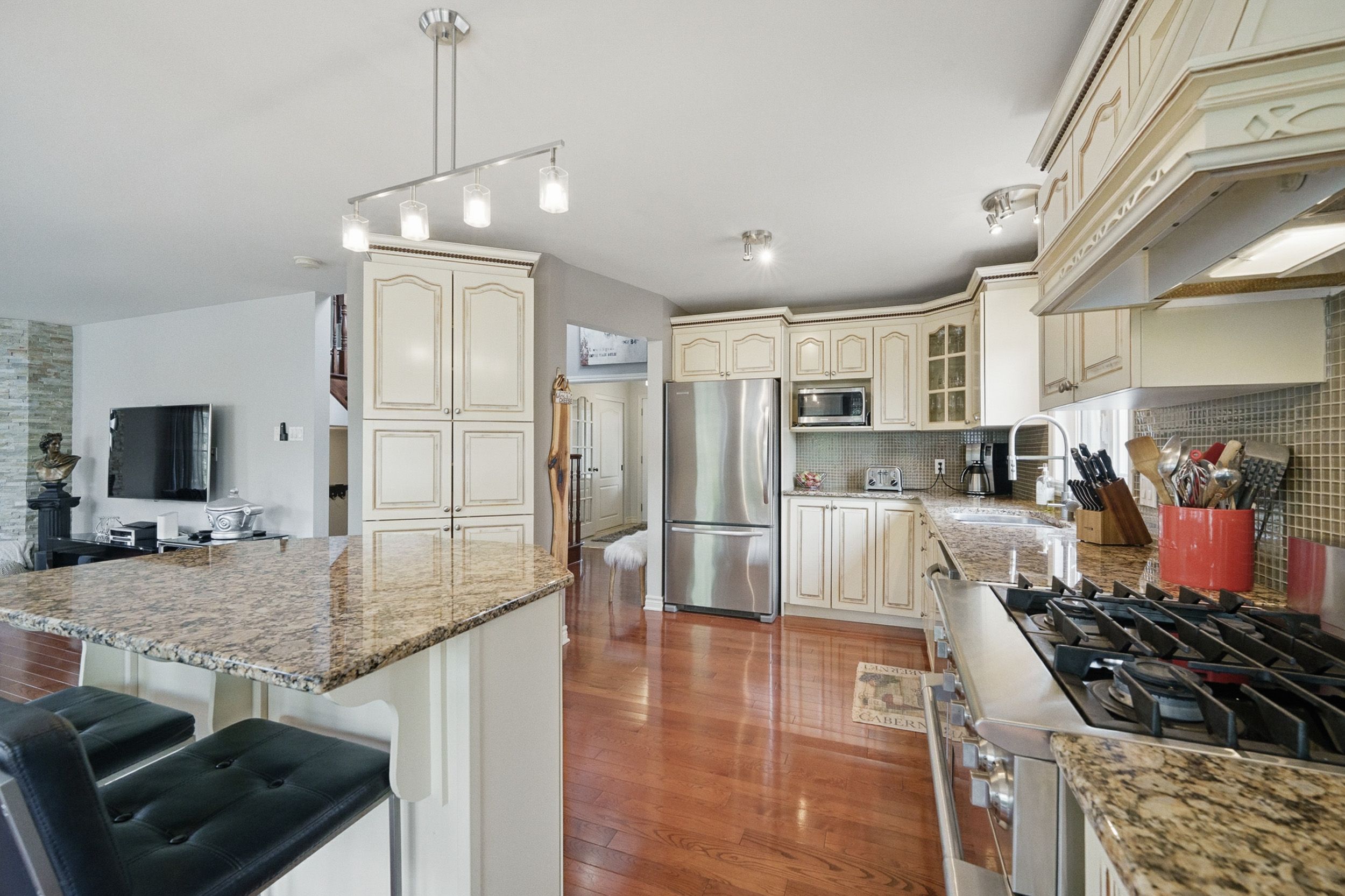 • Generous kitchen featuring gas stove, granite countertops, and central island.