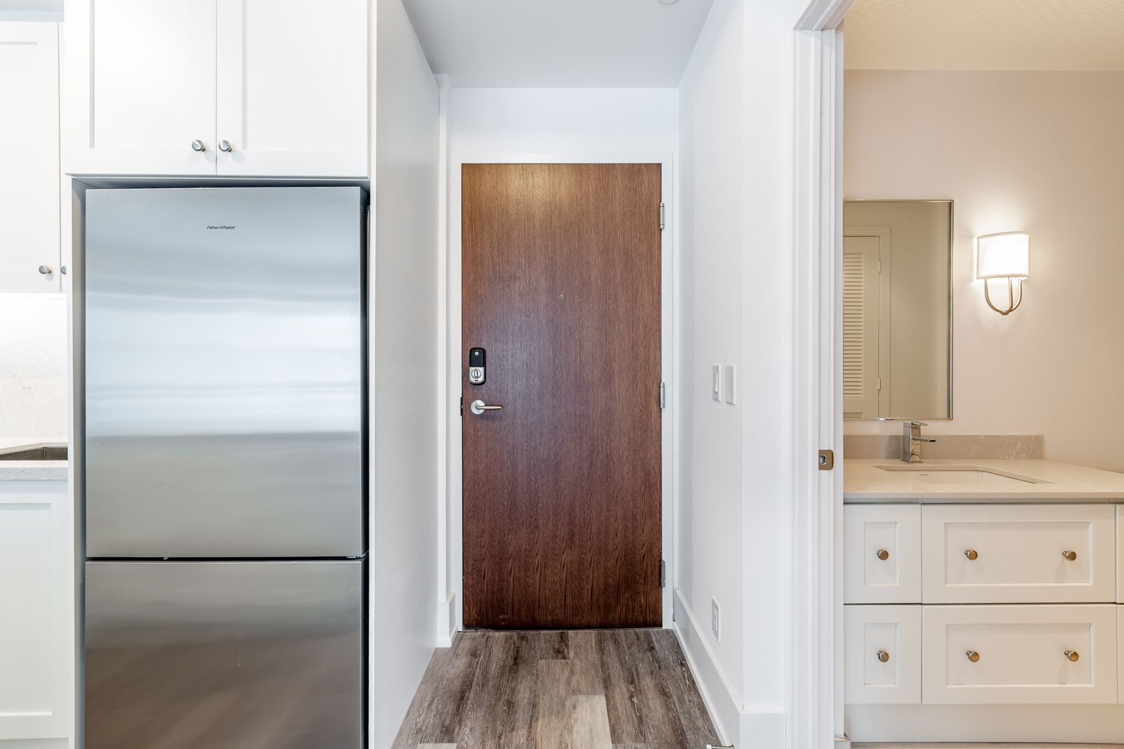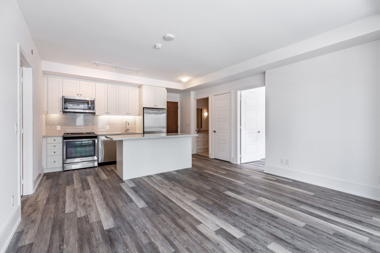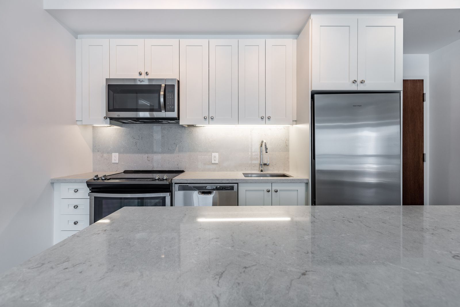 • Stylish kitchen with white cabinetry and stainless steel appliances.