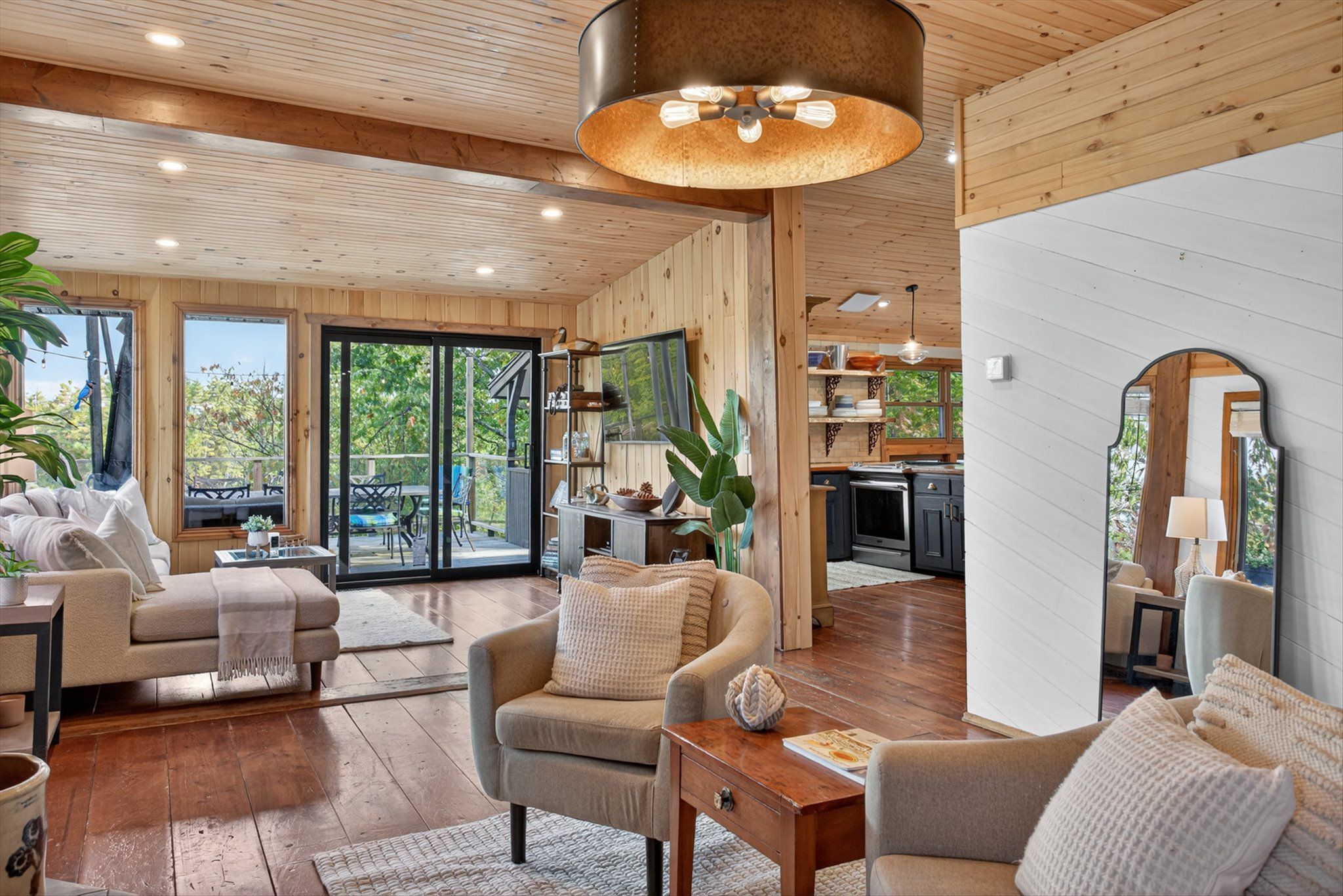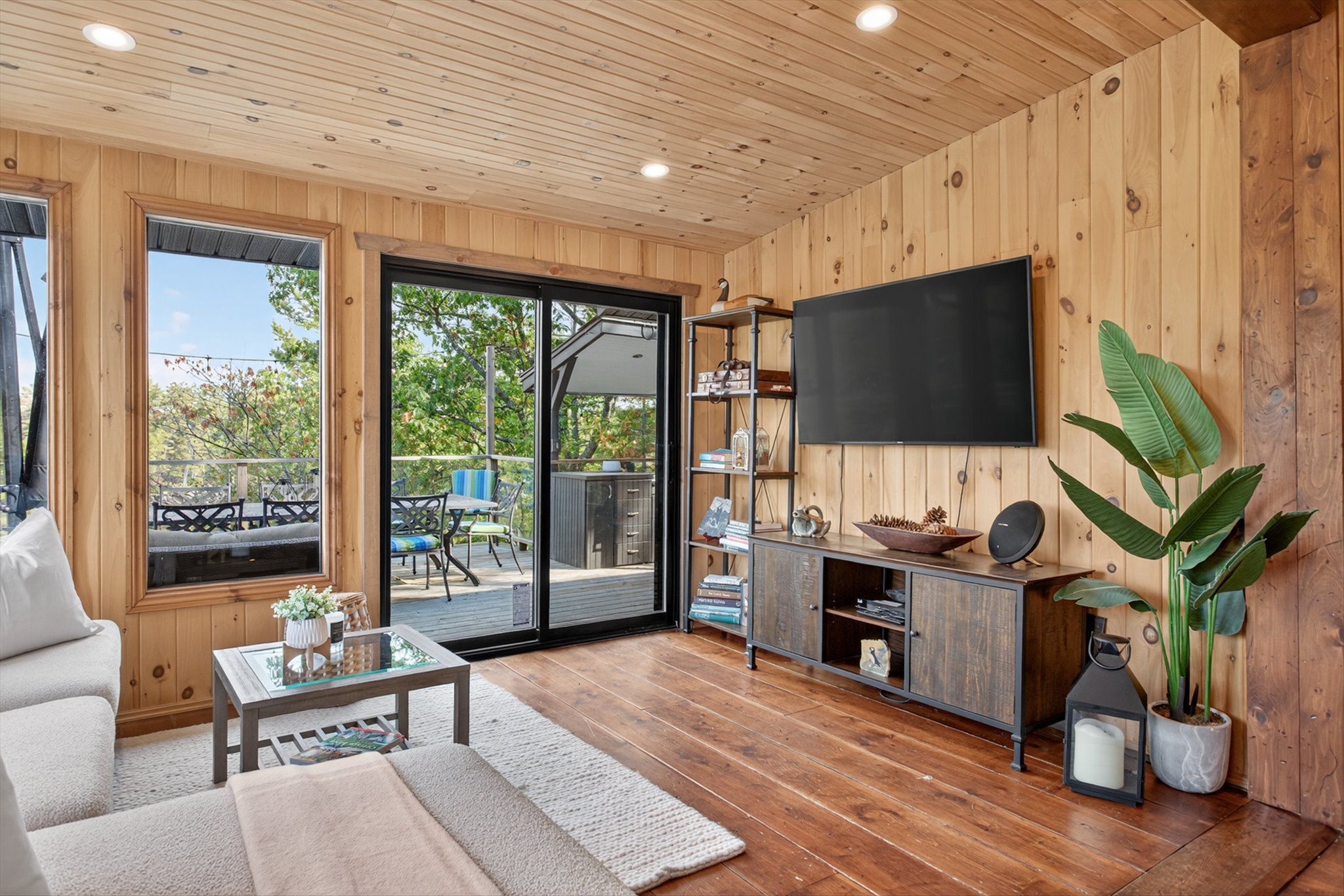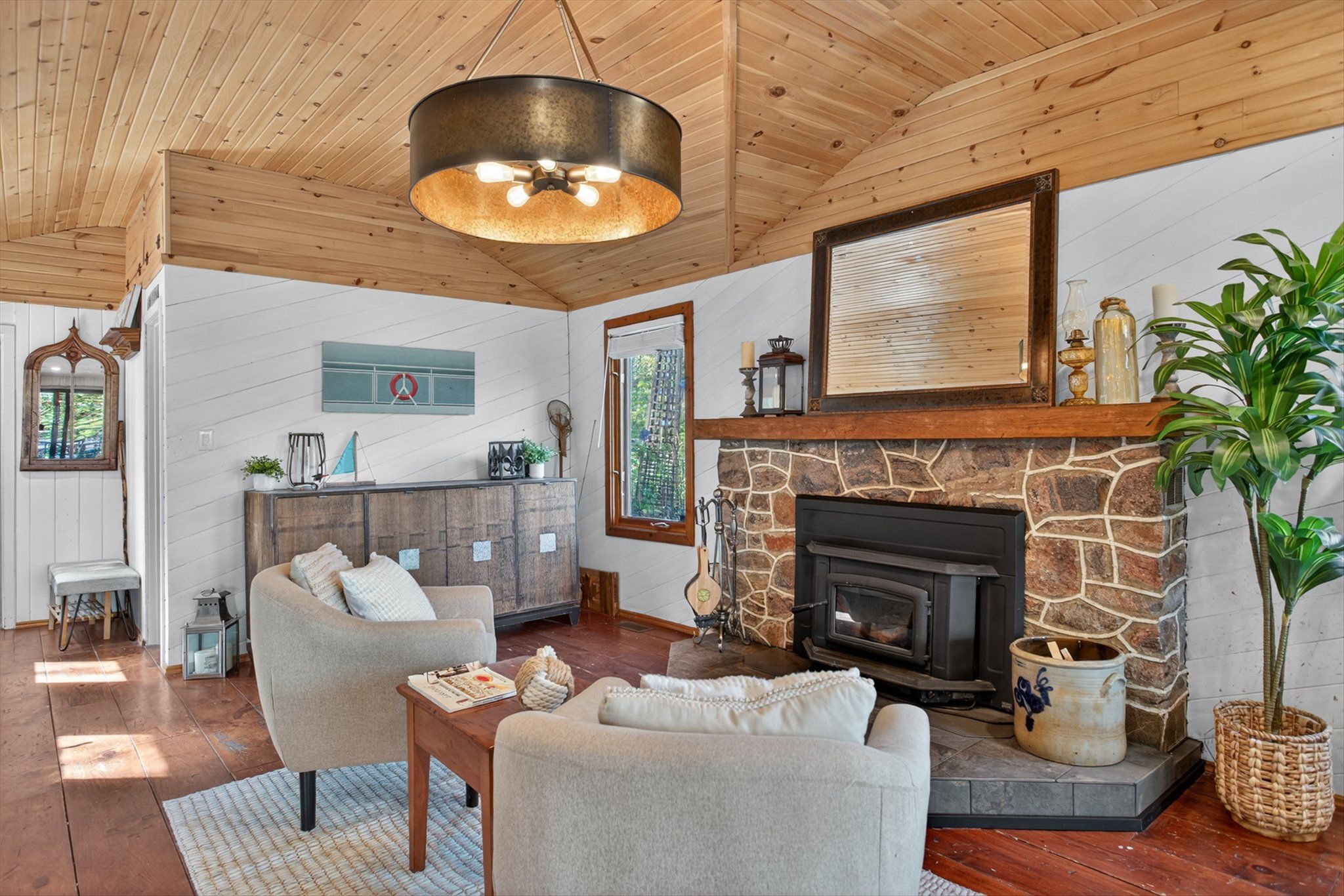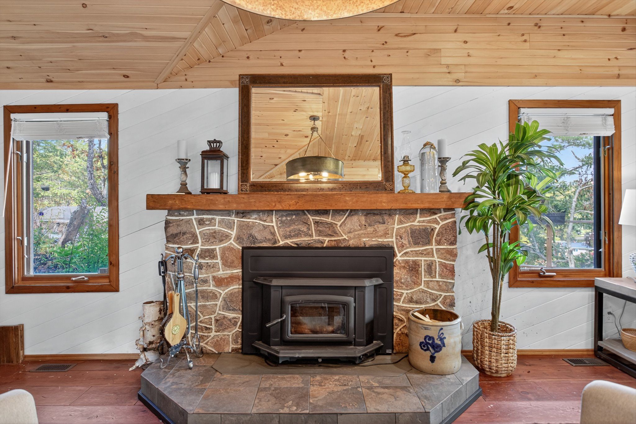 • Rustic interior features cozy wood floors, vaulted ceilings, and a fireplace.