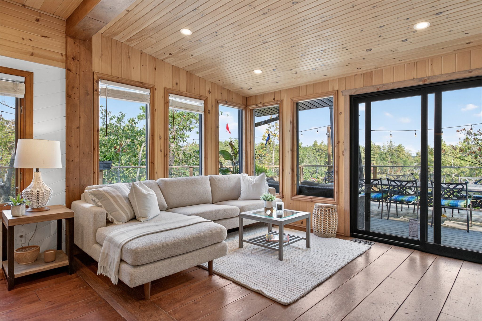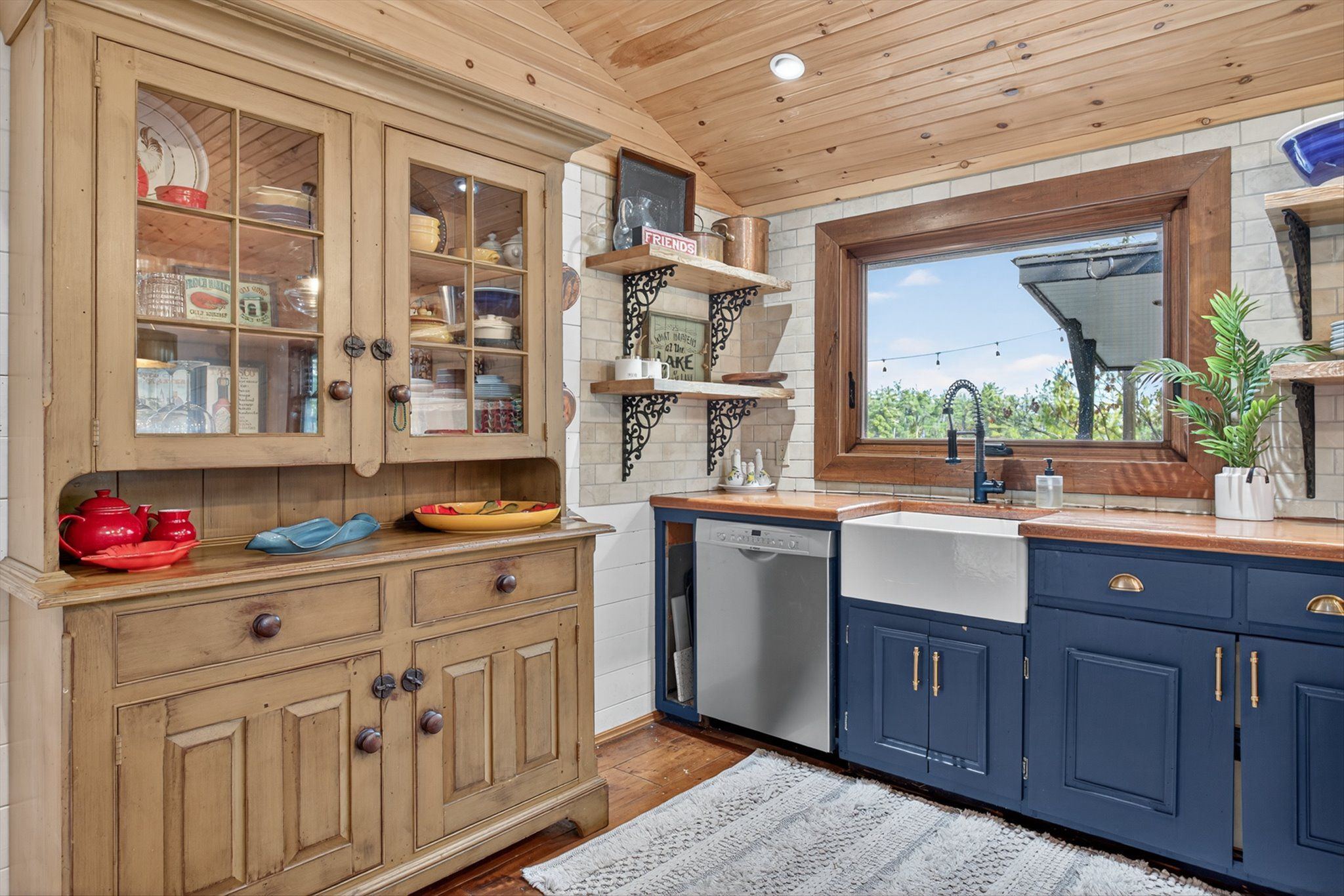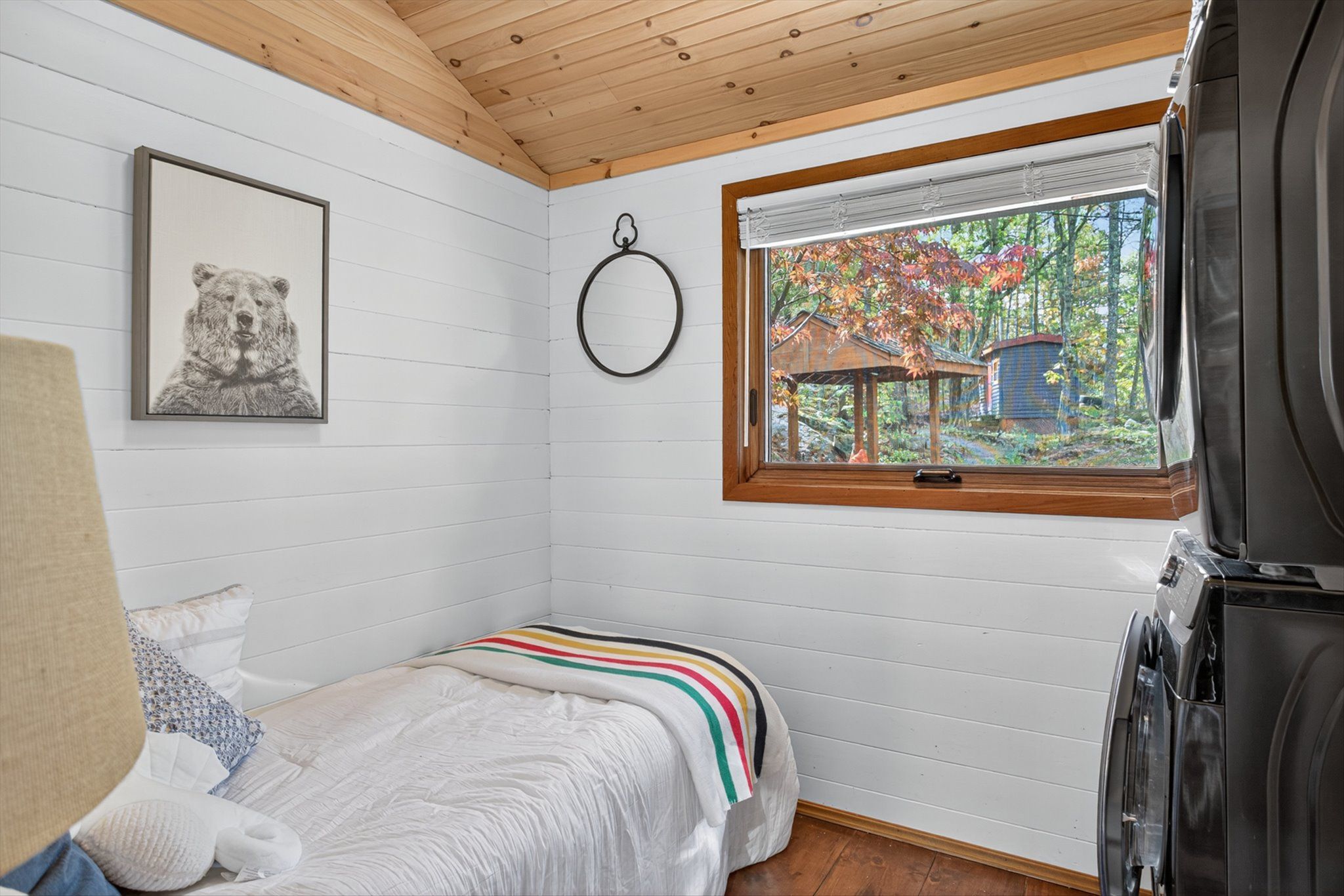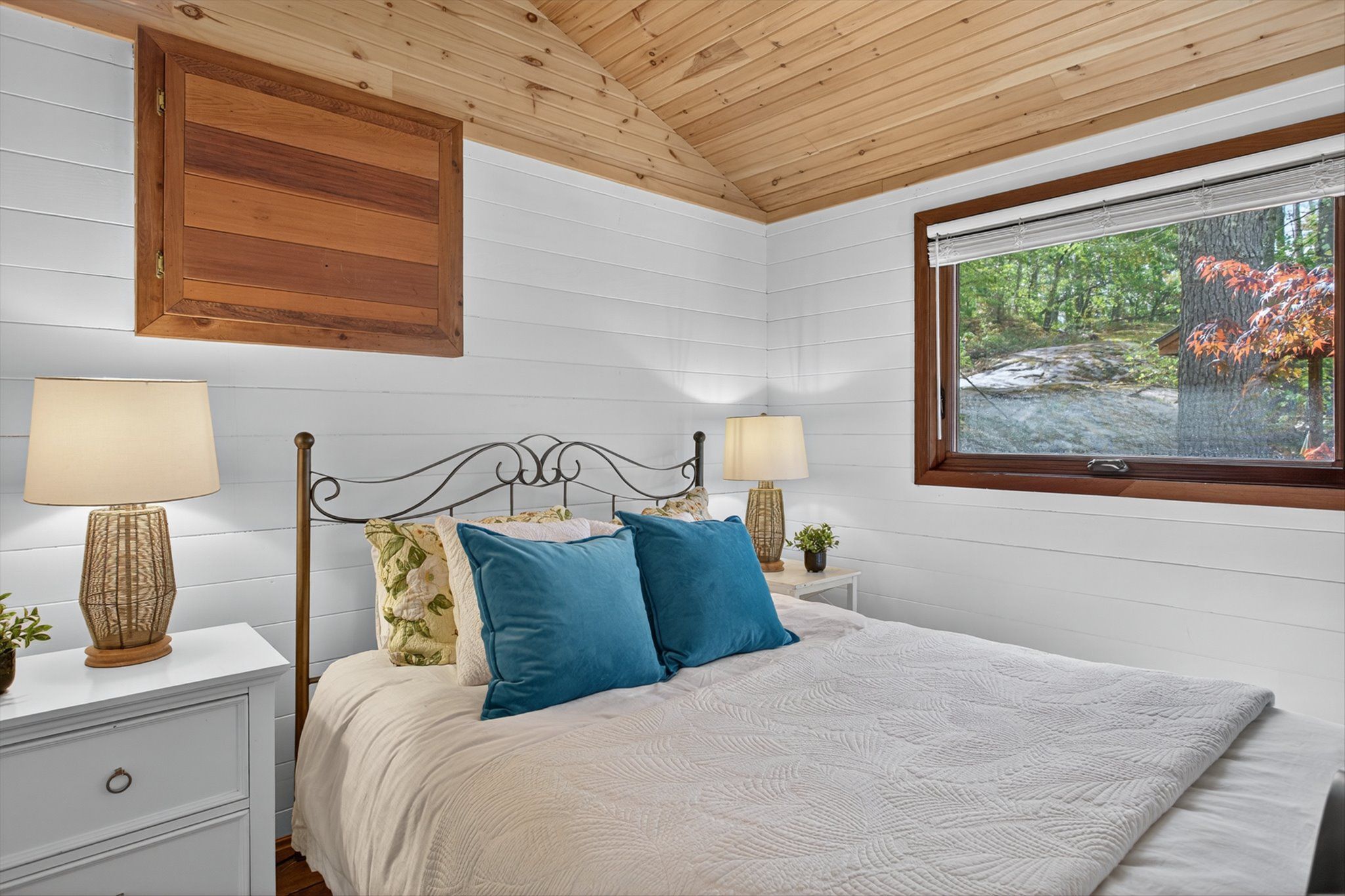 • Rustic interior features cozy wood floors, vaulted ceilings, and a fireplace.
