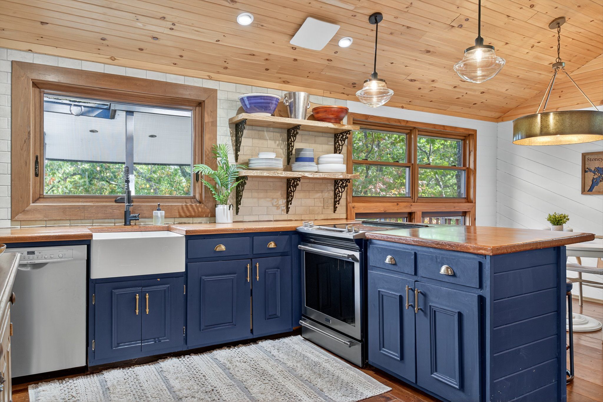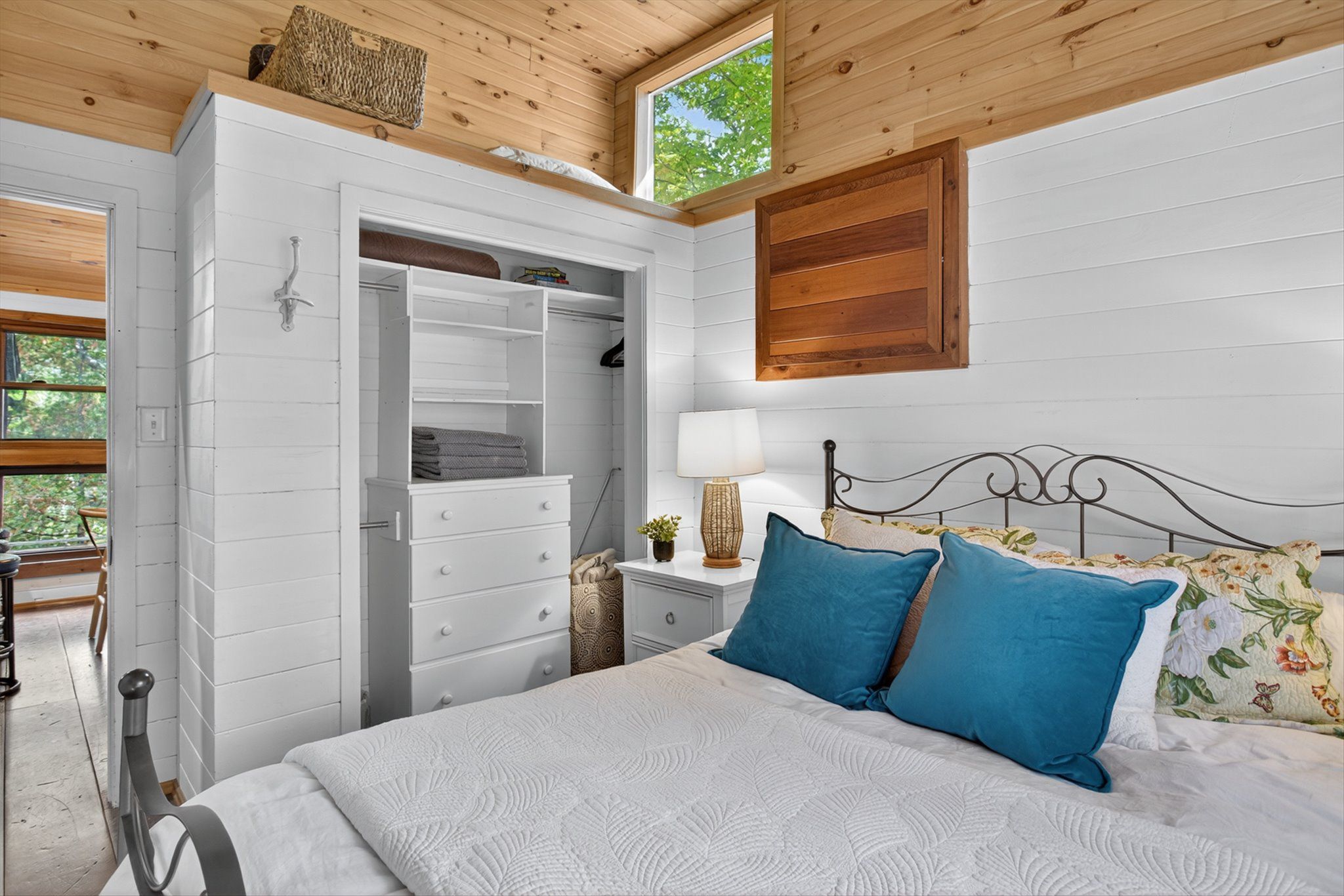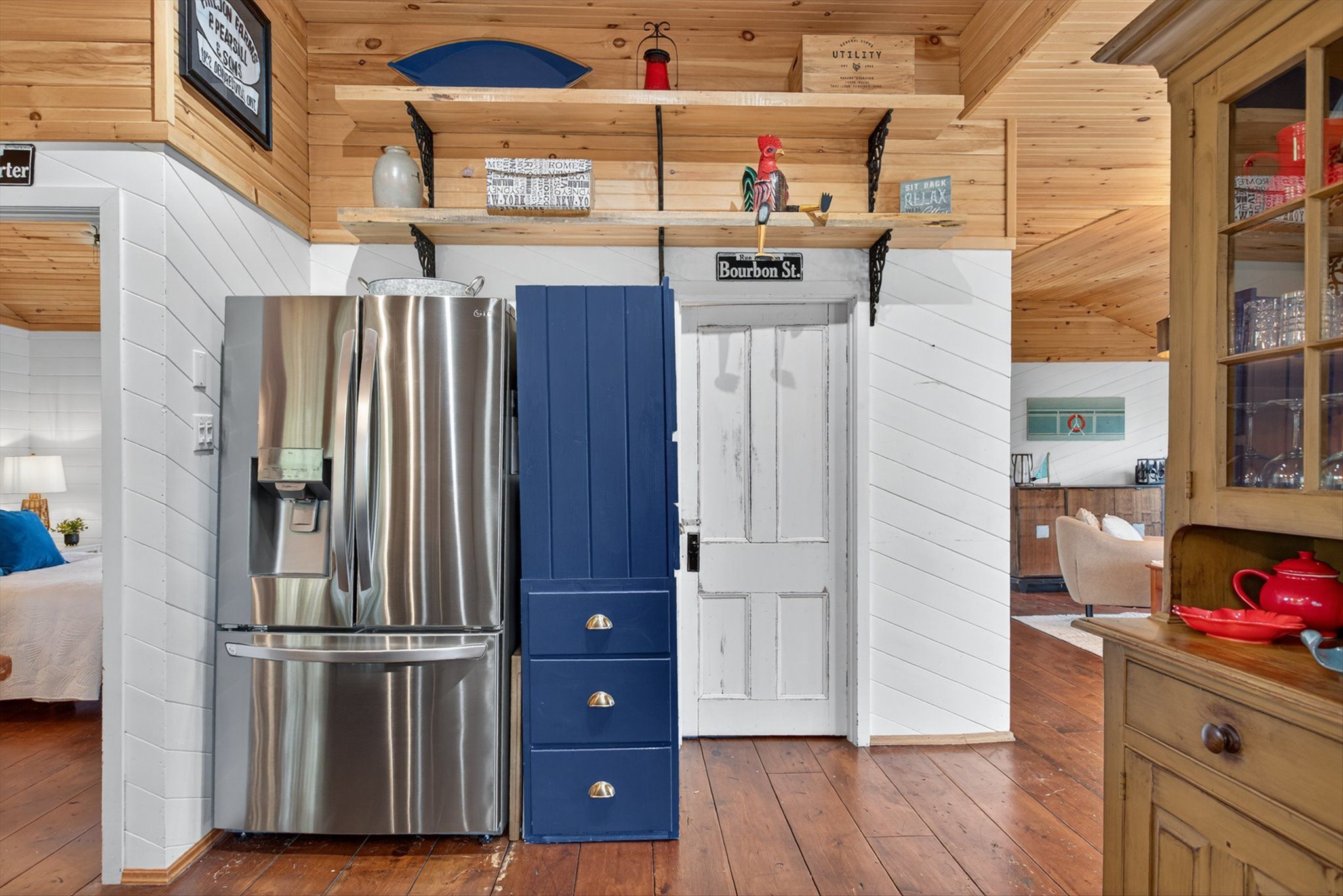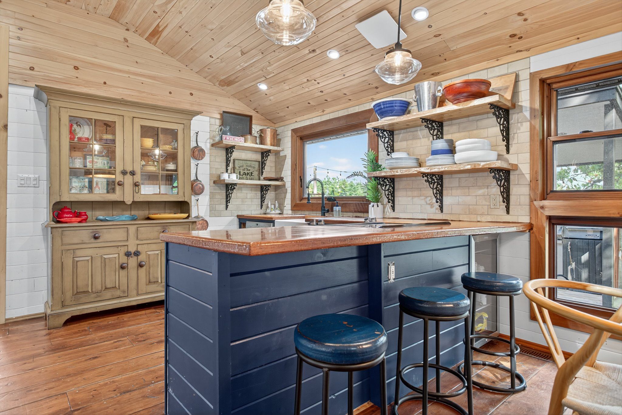 • Rustic interior features cozy wood floors, vaulted ceilings, and a fireplace.