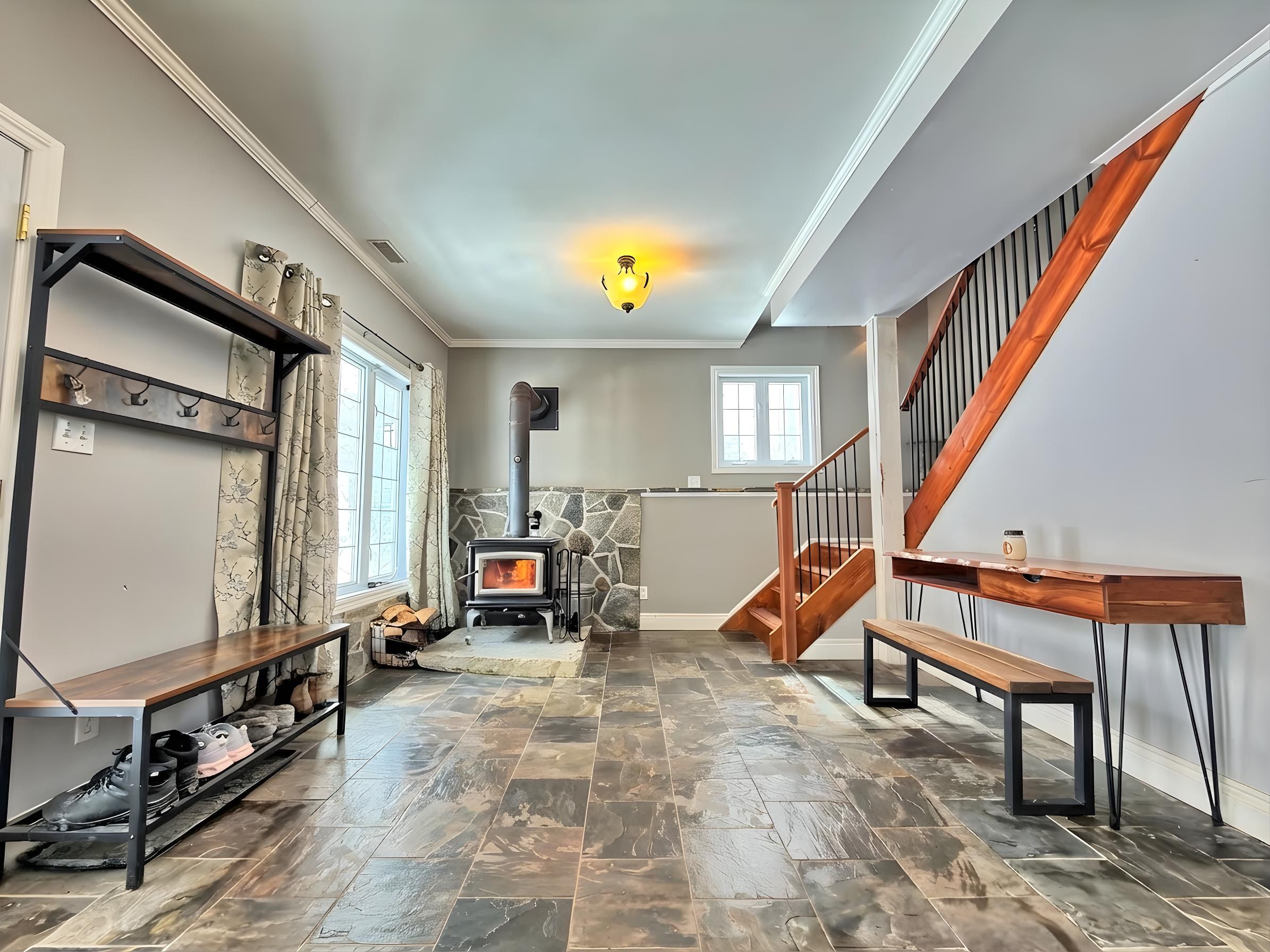 • Ground level basement with walk-out, cozy woodstove, and large family room.
