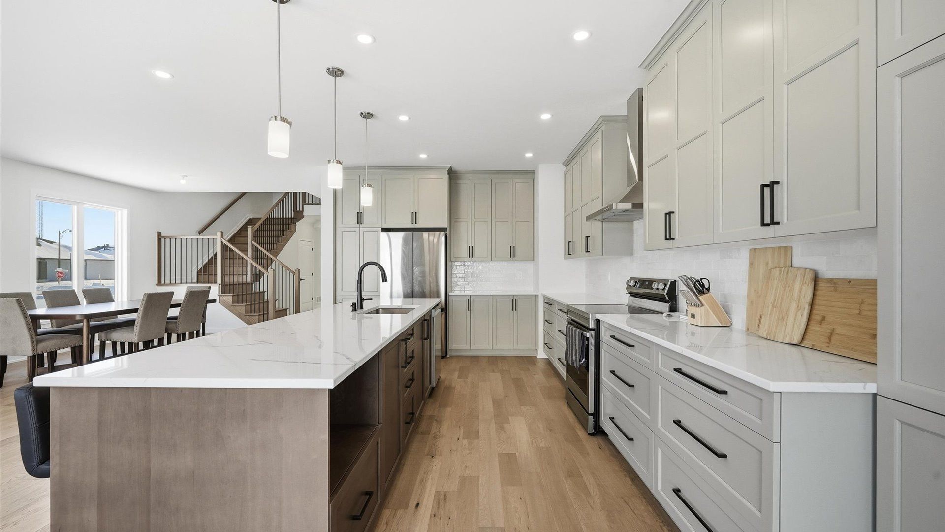 • Chef-inspired kitchen with a large island and quartz countertops.