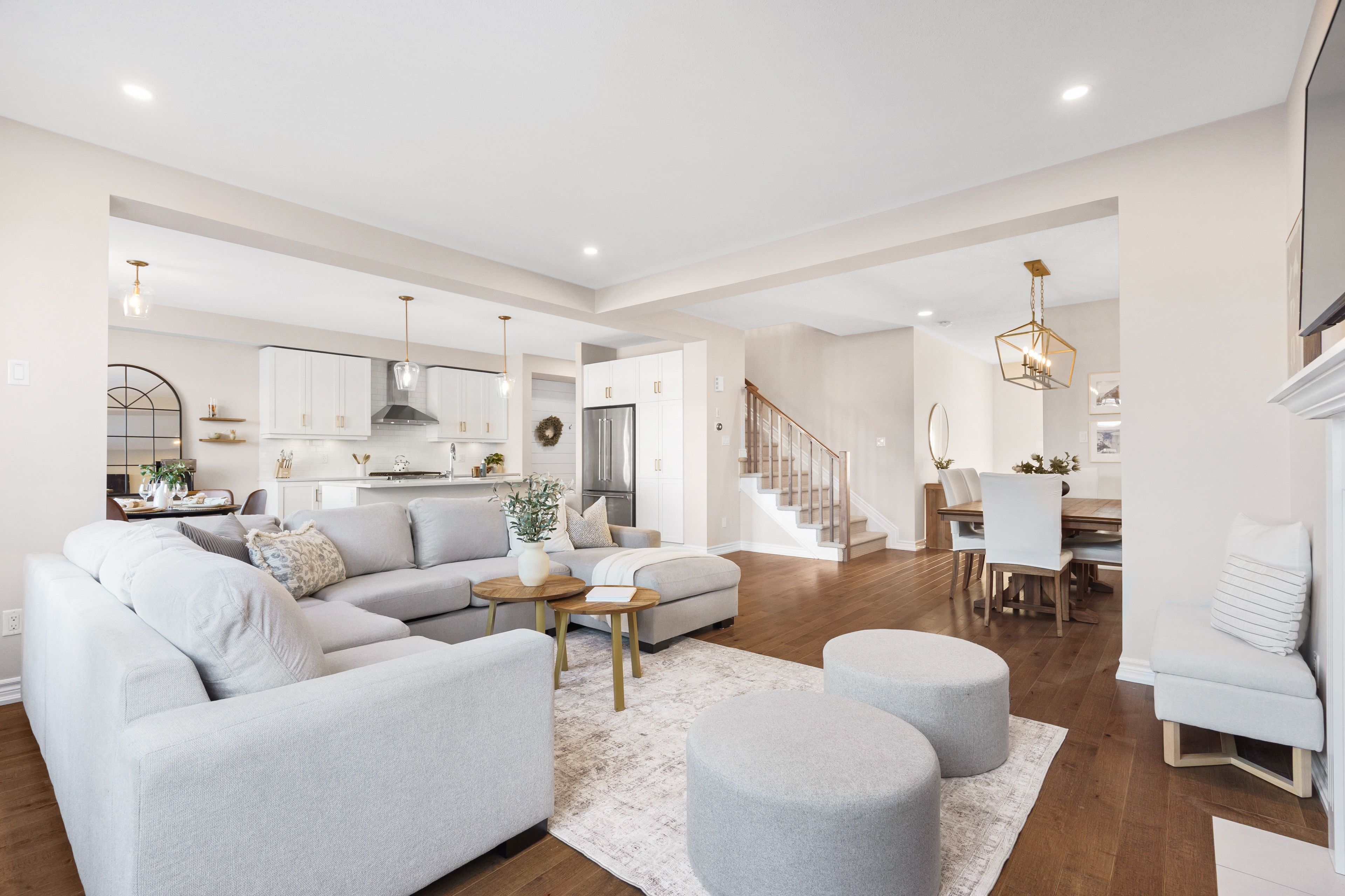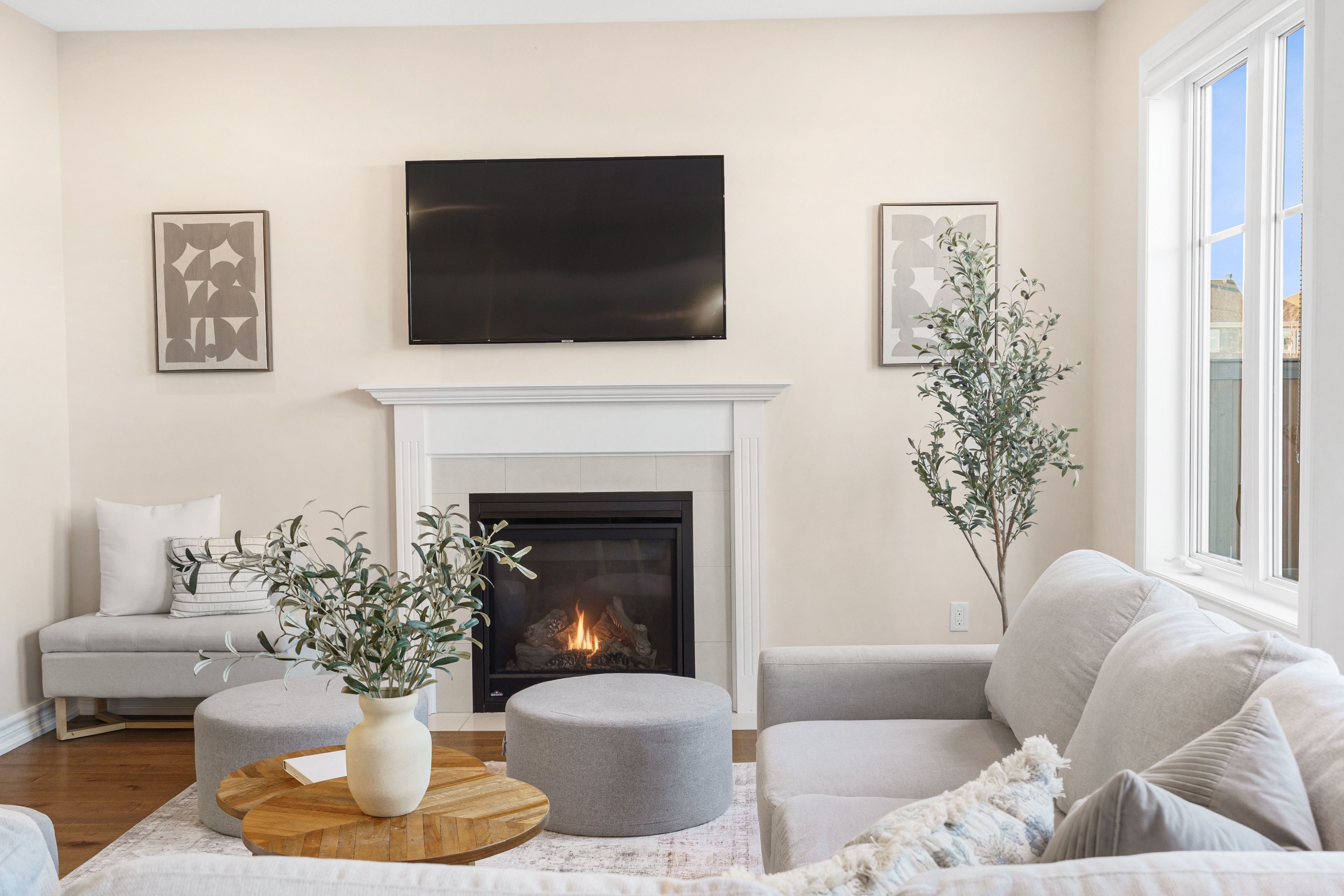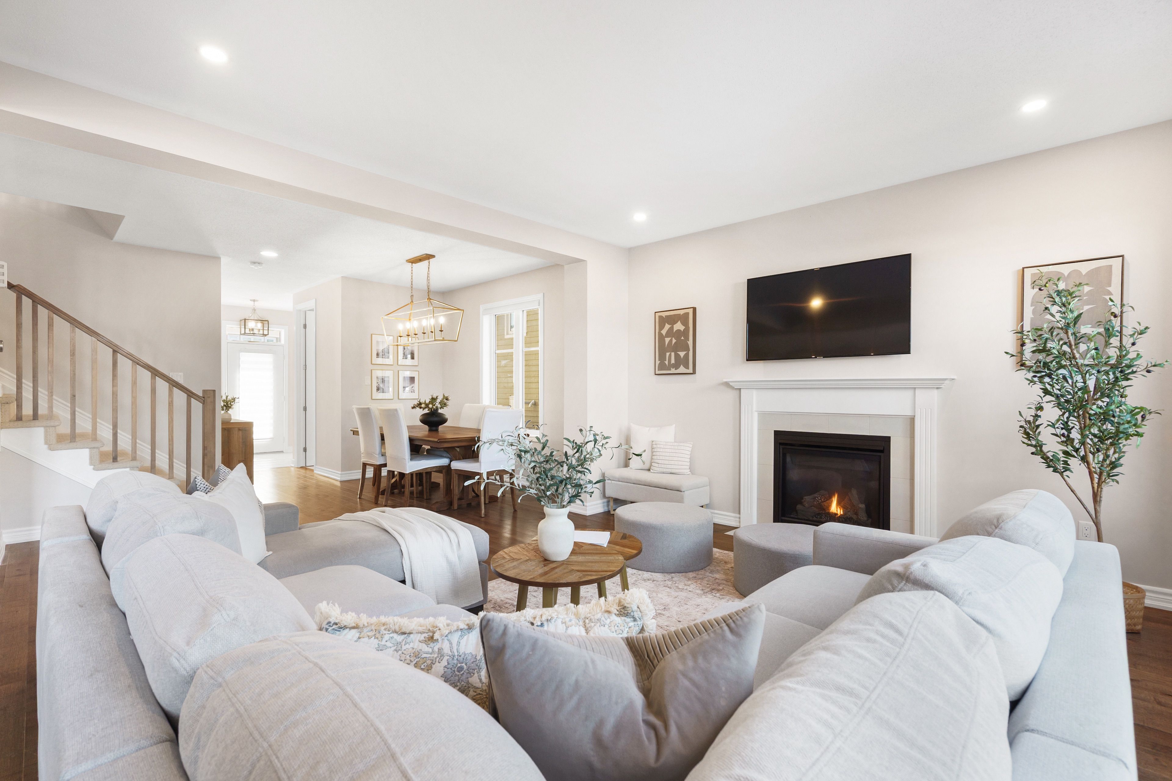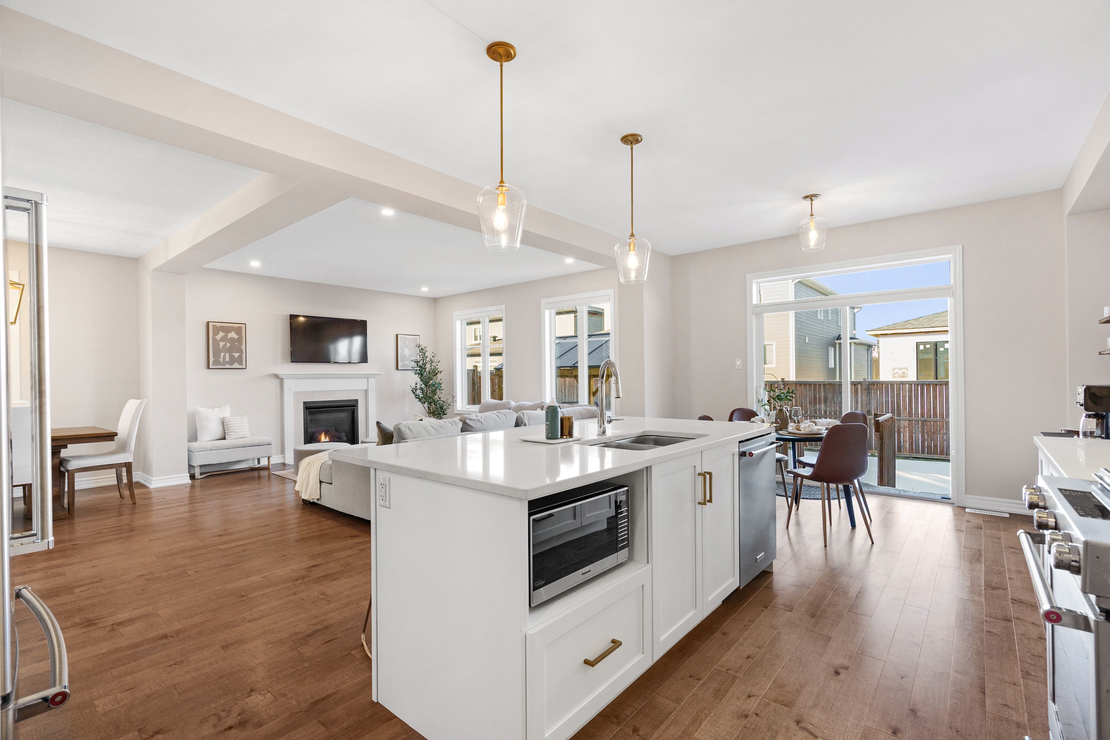 • Open-concept main floor with hardwood flooring and gas fireplace.