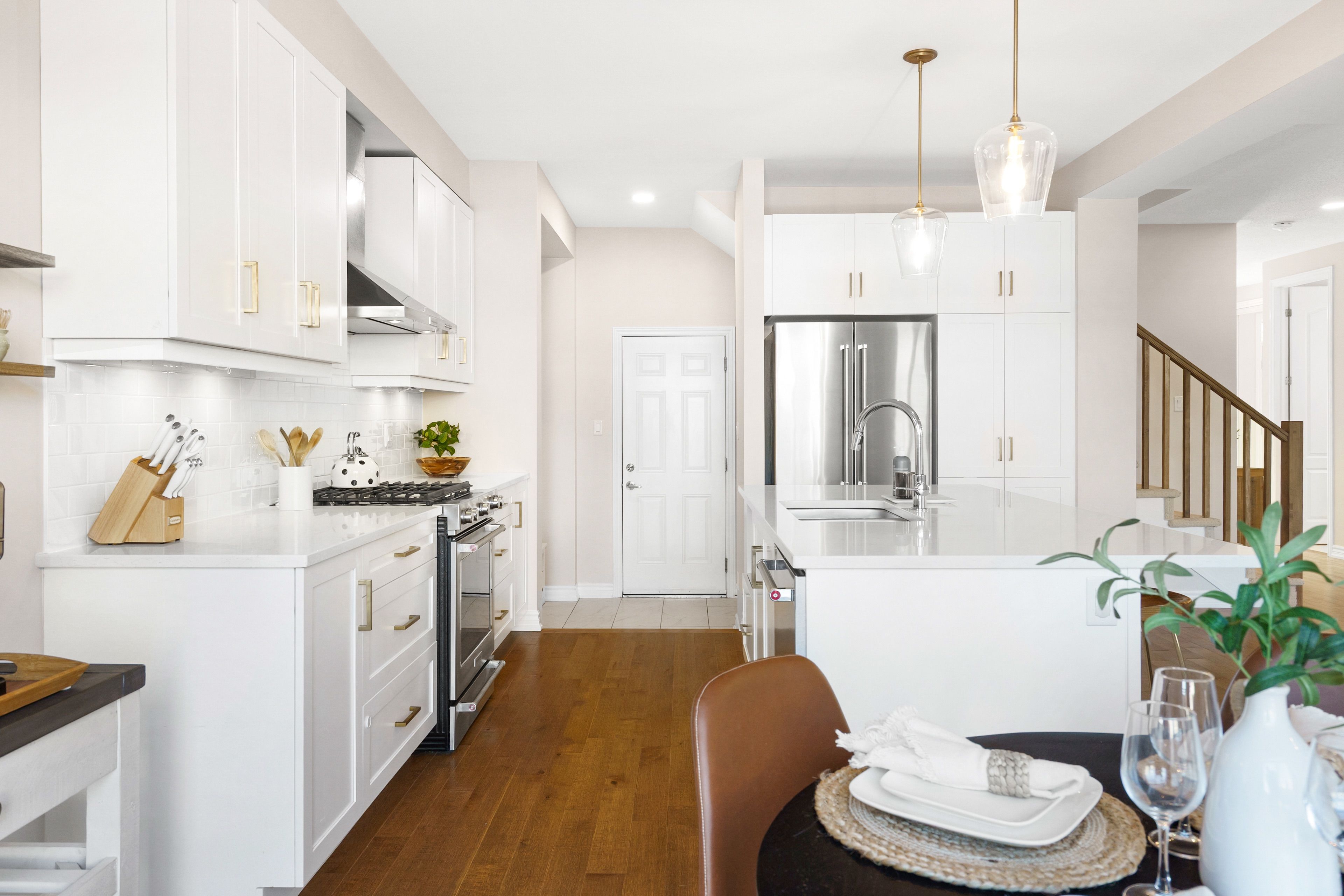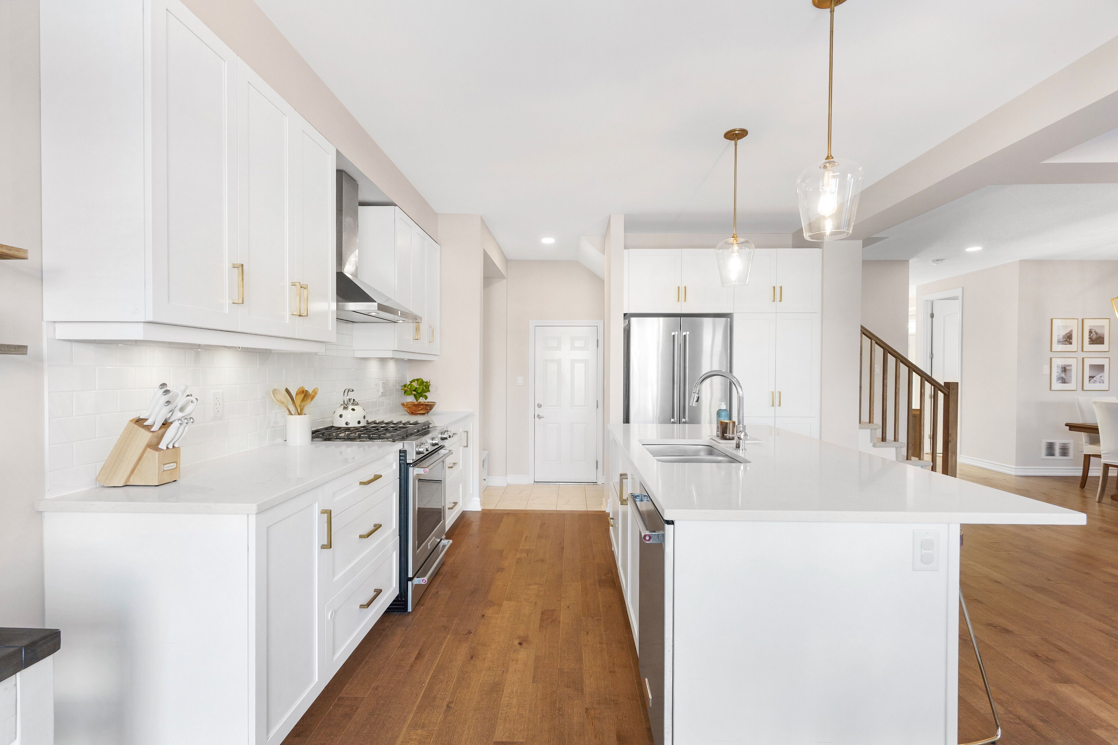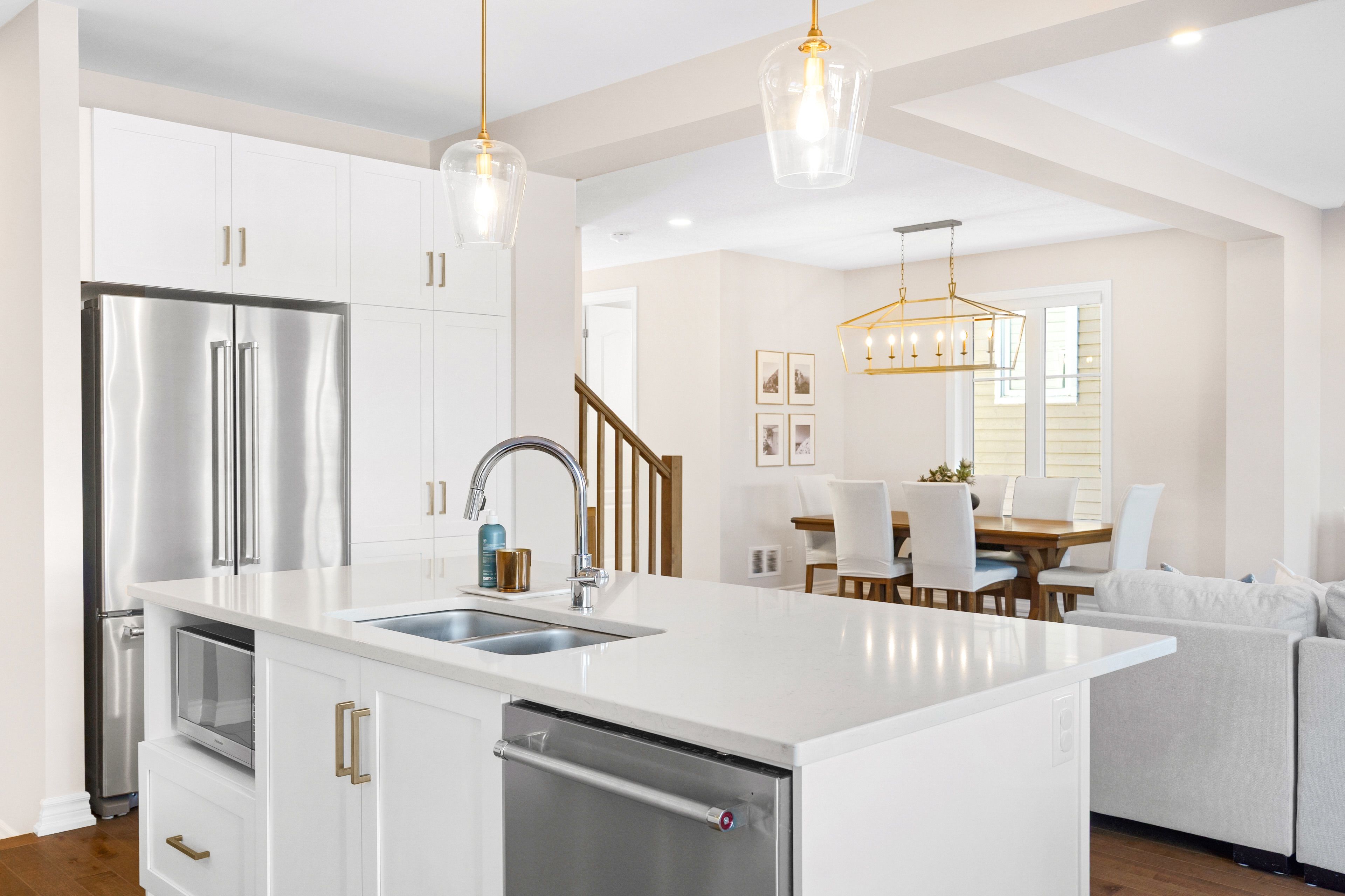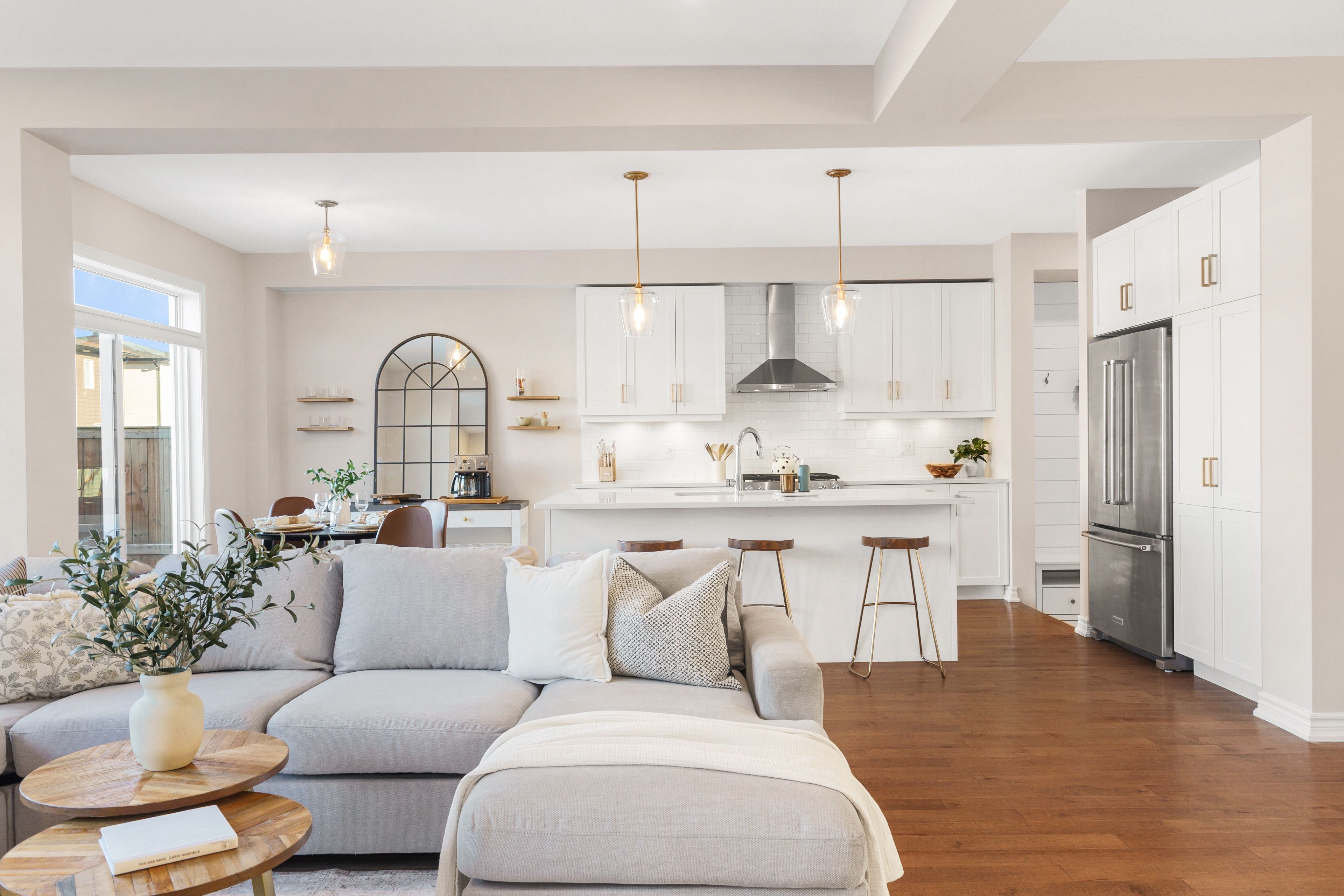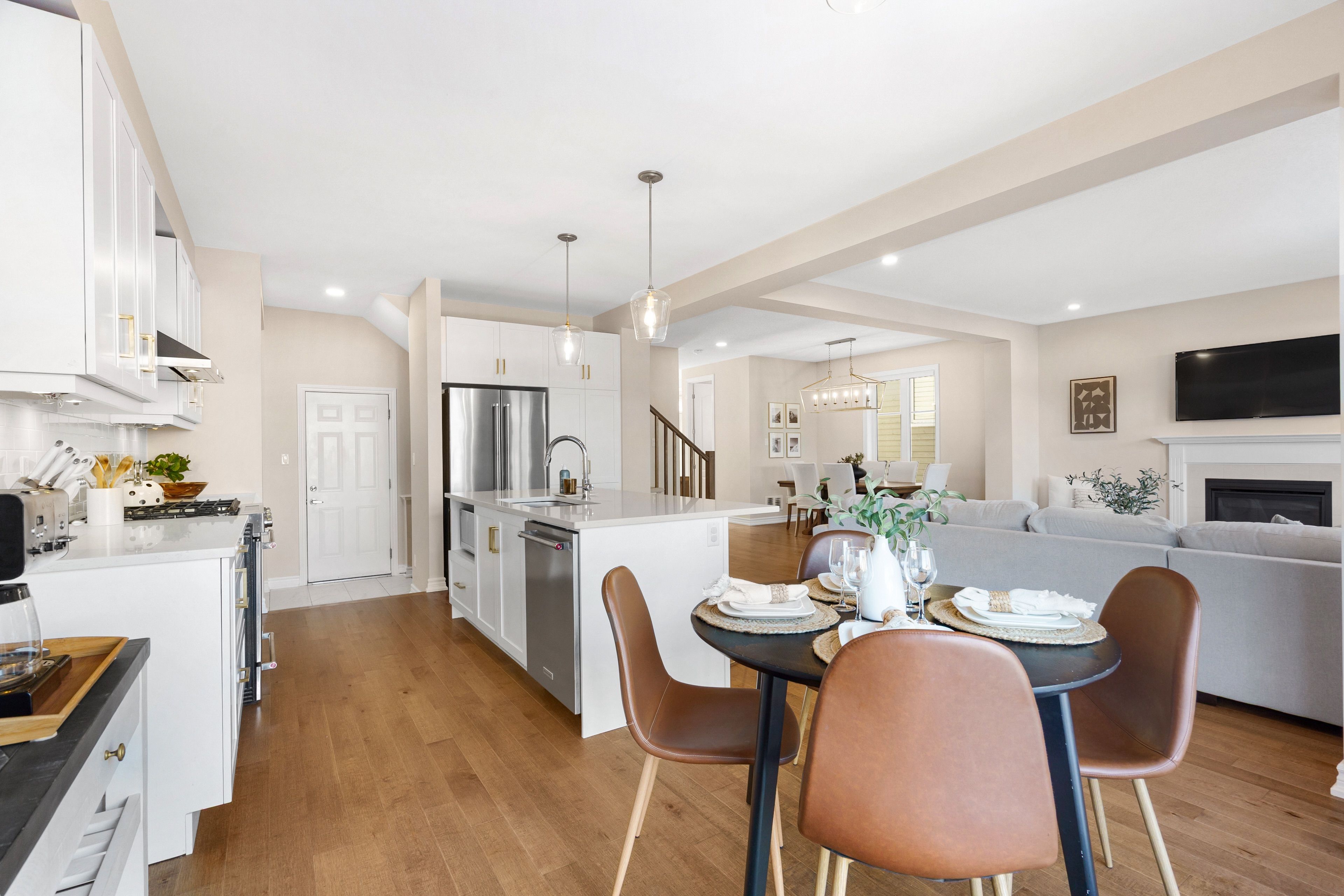 • Open-concept main floor with hardwood flooring and gas fireplace.