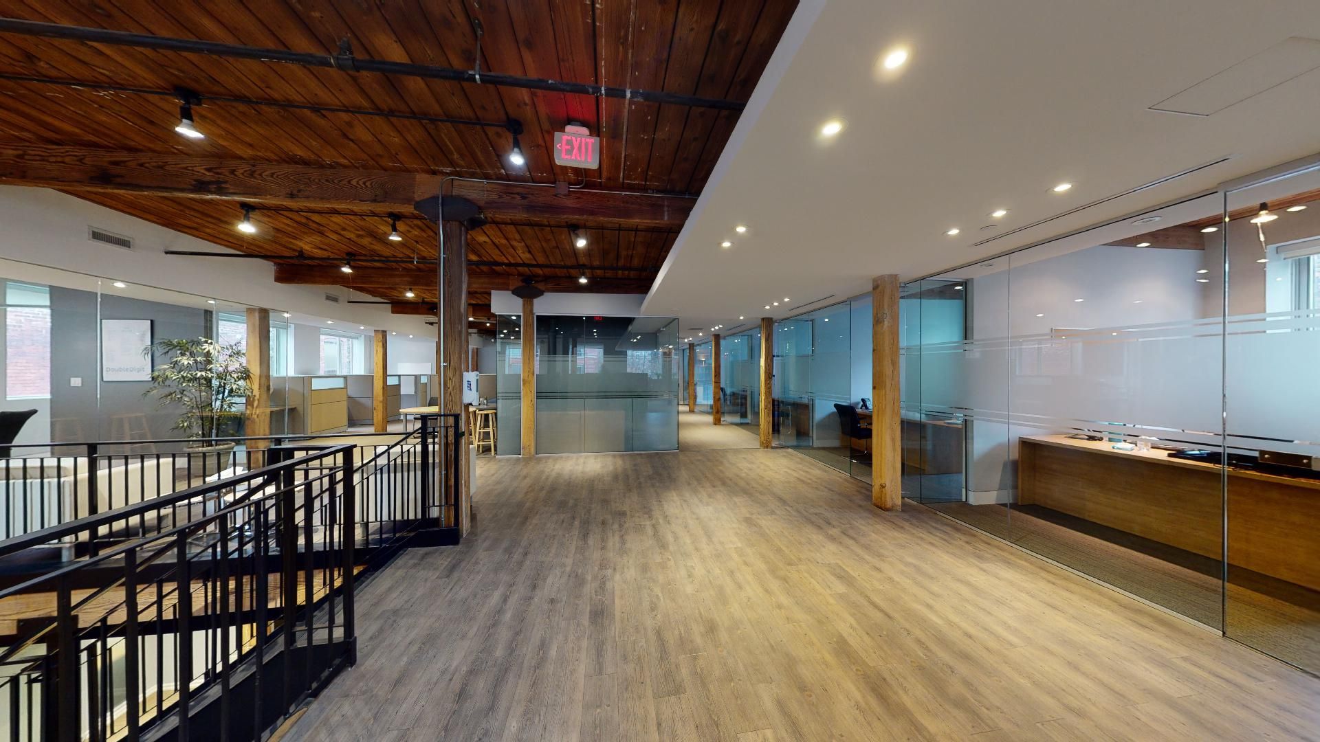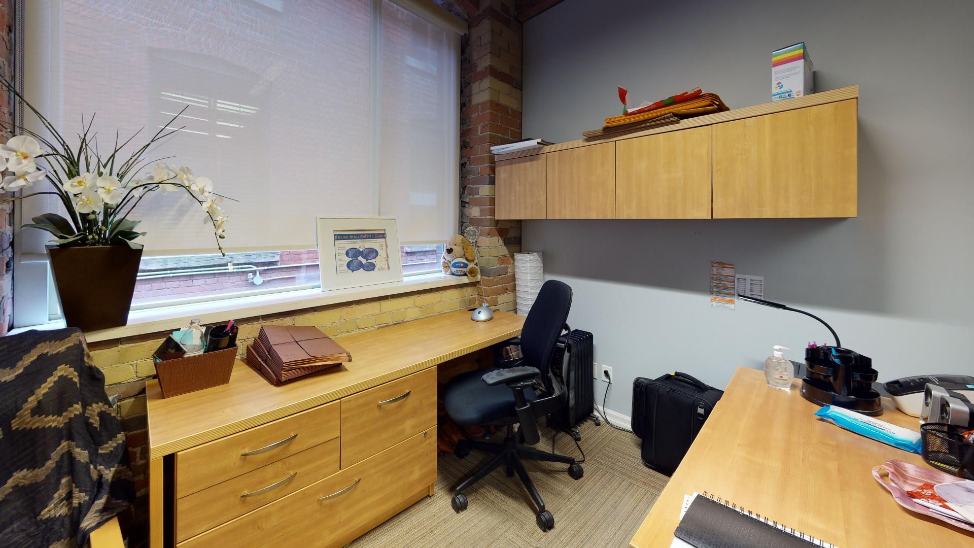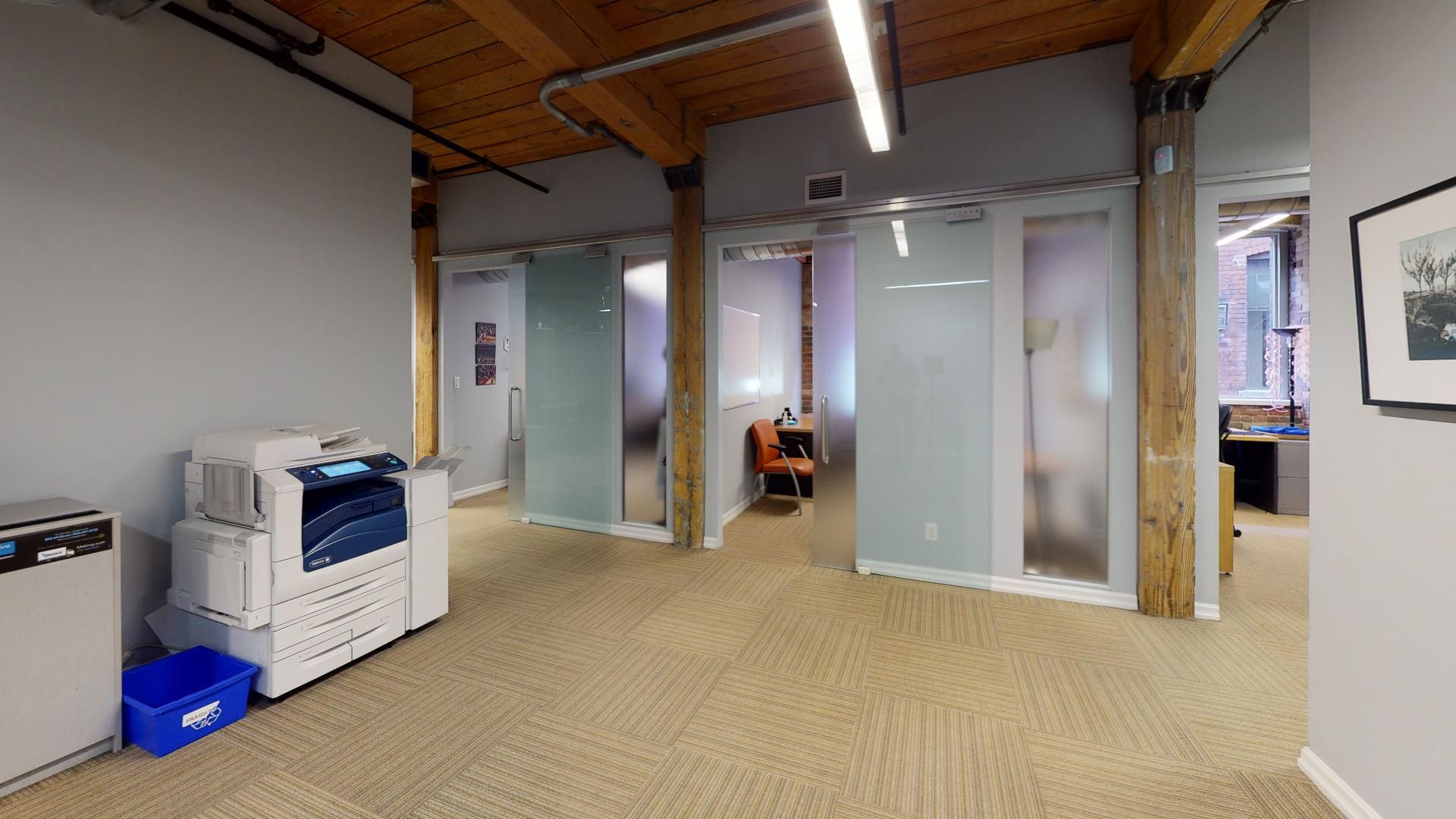 Stunning turnkey modern brick and beam office space over 3 levels, currently two reception areas off main floor foyer, numerous private offices and open concept work spaces. Some with glass and brick walls, wood beams, large open concept workstation areas with multiple cubicles, high profile main presentation rooms, 3 large boardroom/ creative think tank rooms, generous eat in kitchen with appliances, extensive track lighting and blinds throughout, 6 washrooms total over all levels including two showers (one wheelchair accessible). Upper floors not wheelchair accessible, freight elevator is not operational. Main level was physio clinic, parking available up to 5 spaces, hydro and insuite janitorial extra. Landlord is open to hostel/shelter use.