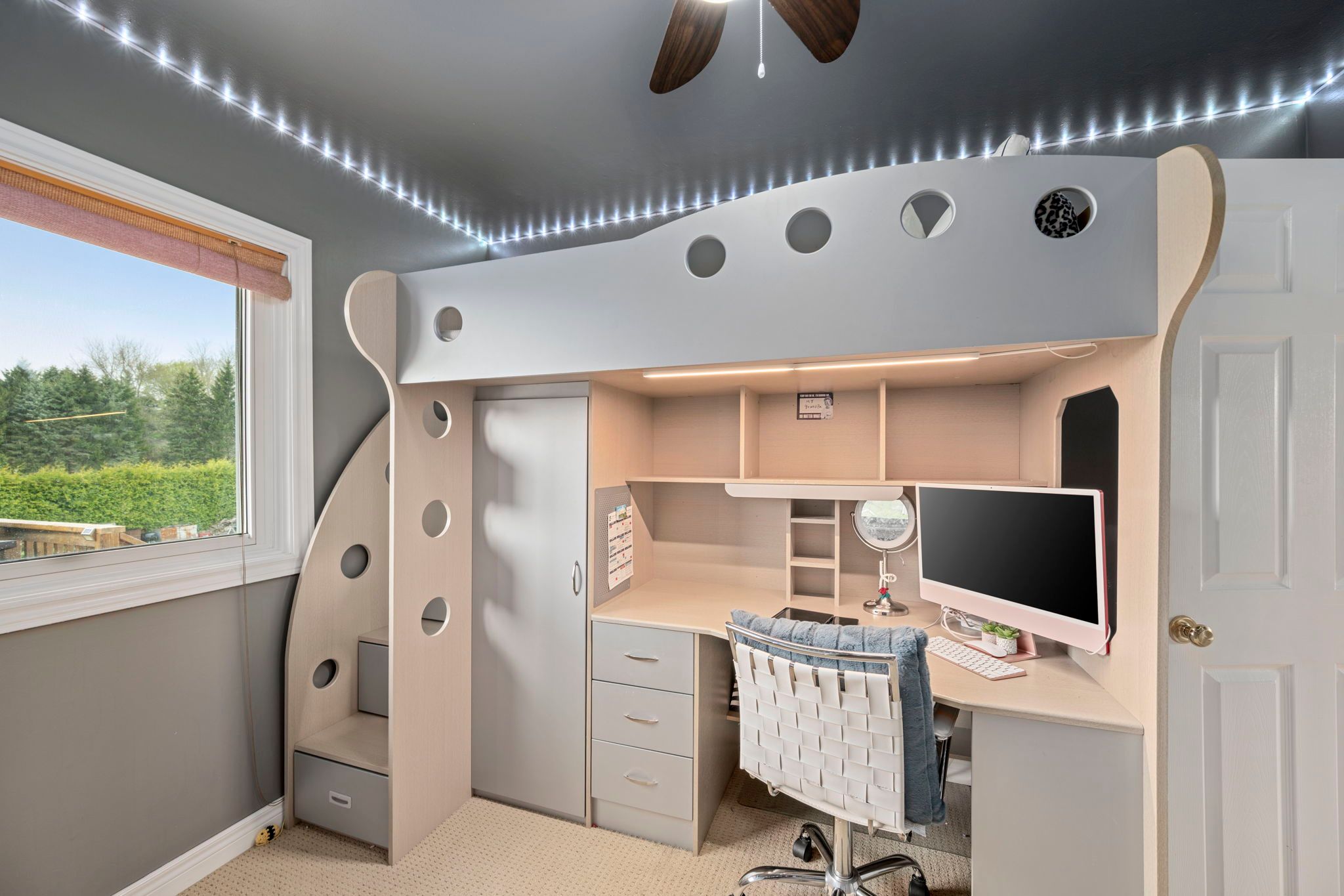 • Main floor features 3 bedrooms, open kitchen, and a dining area with patio doors.