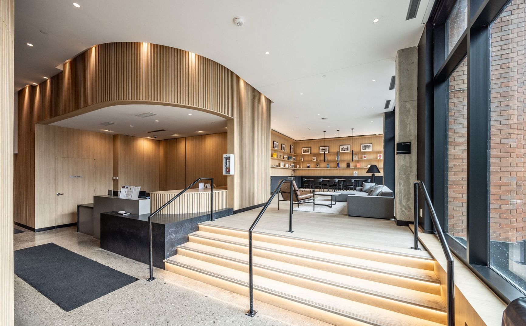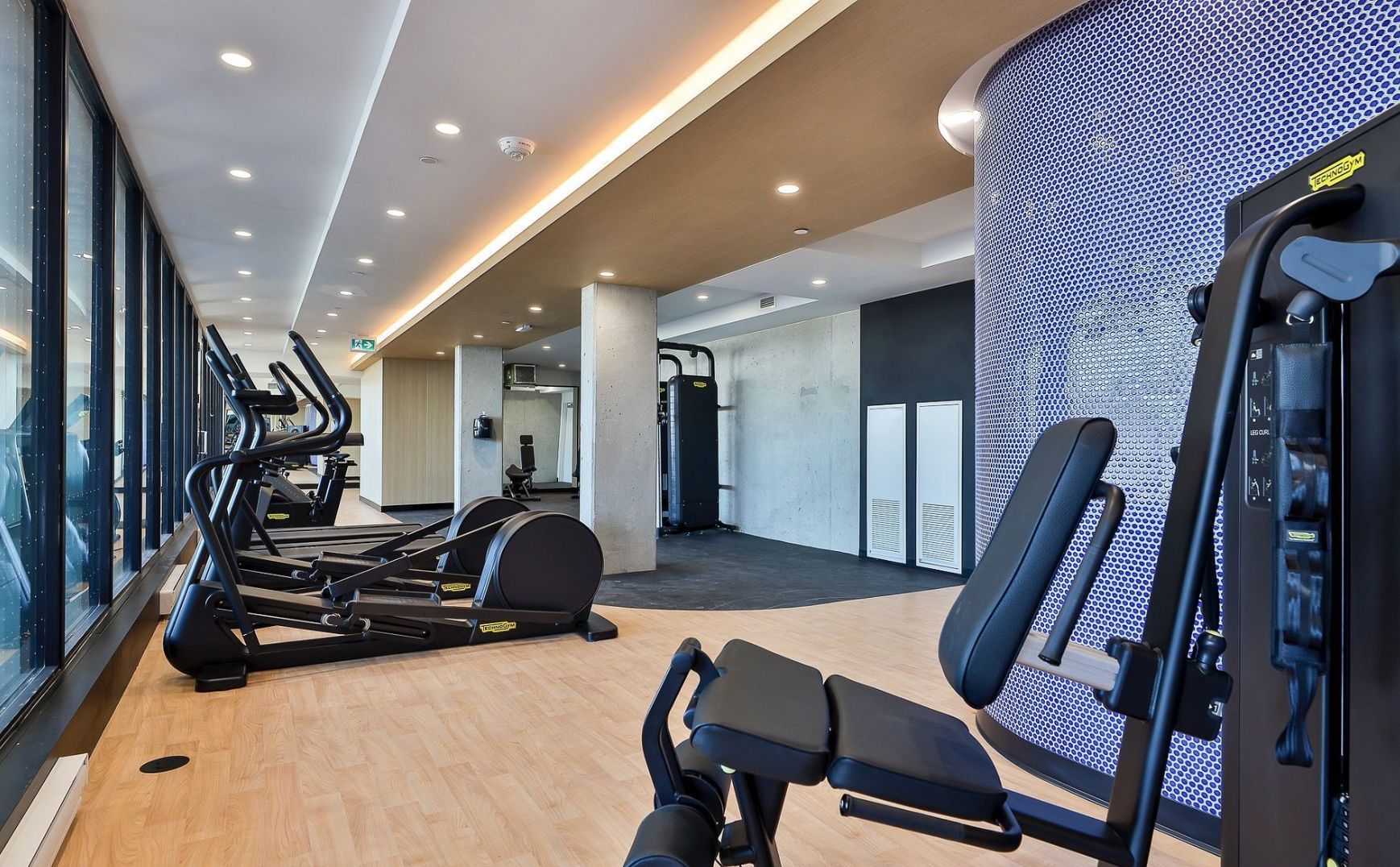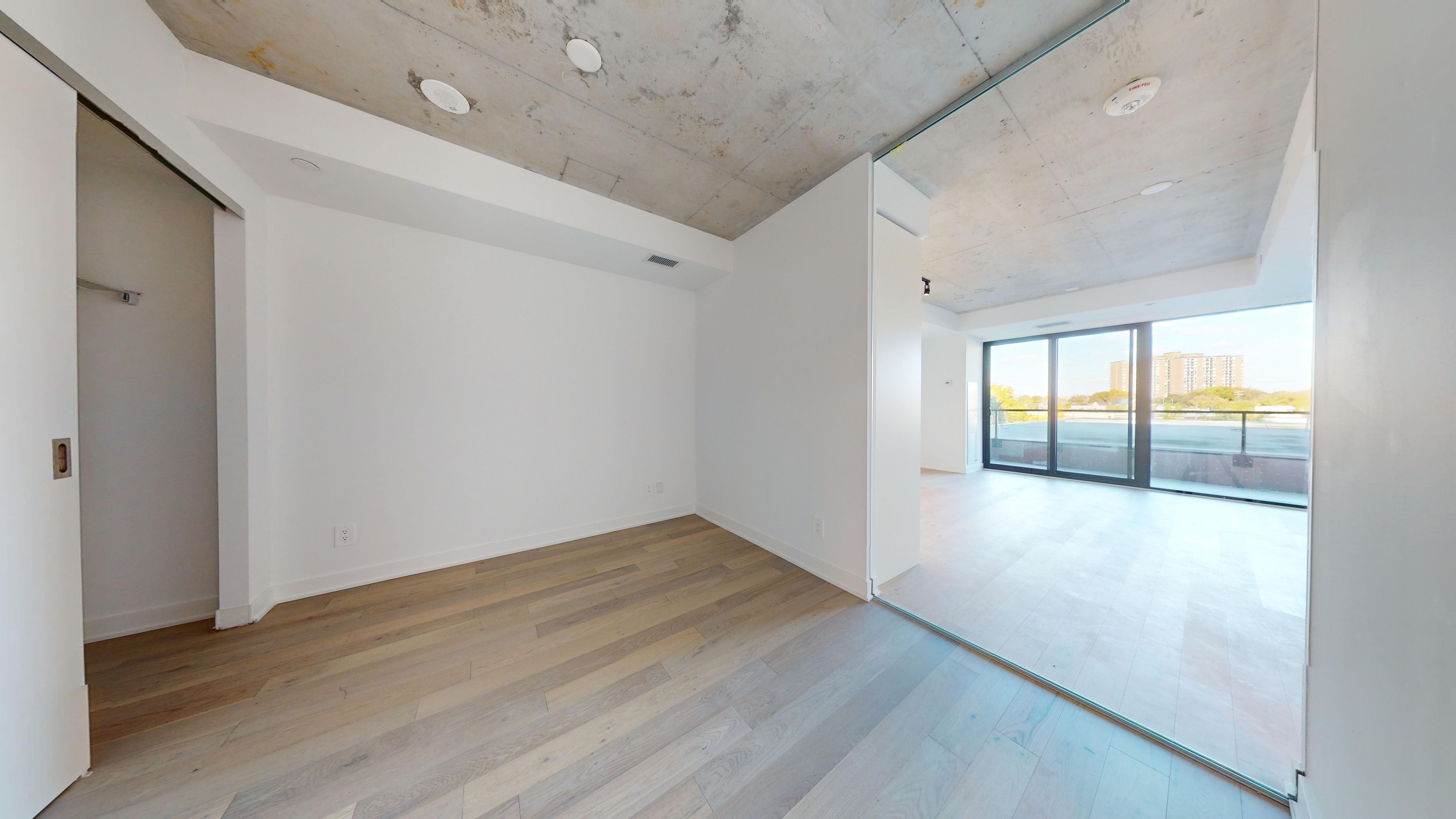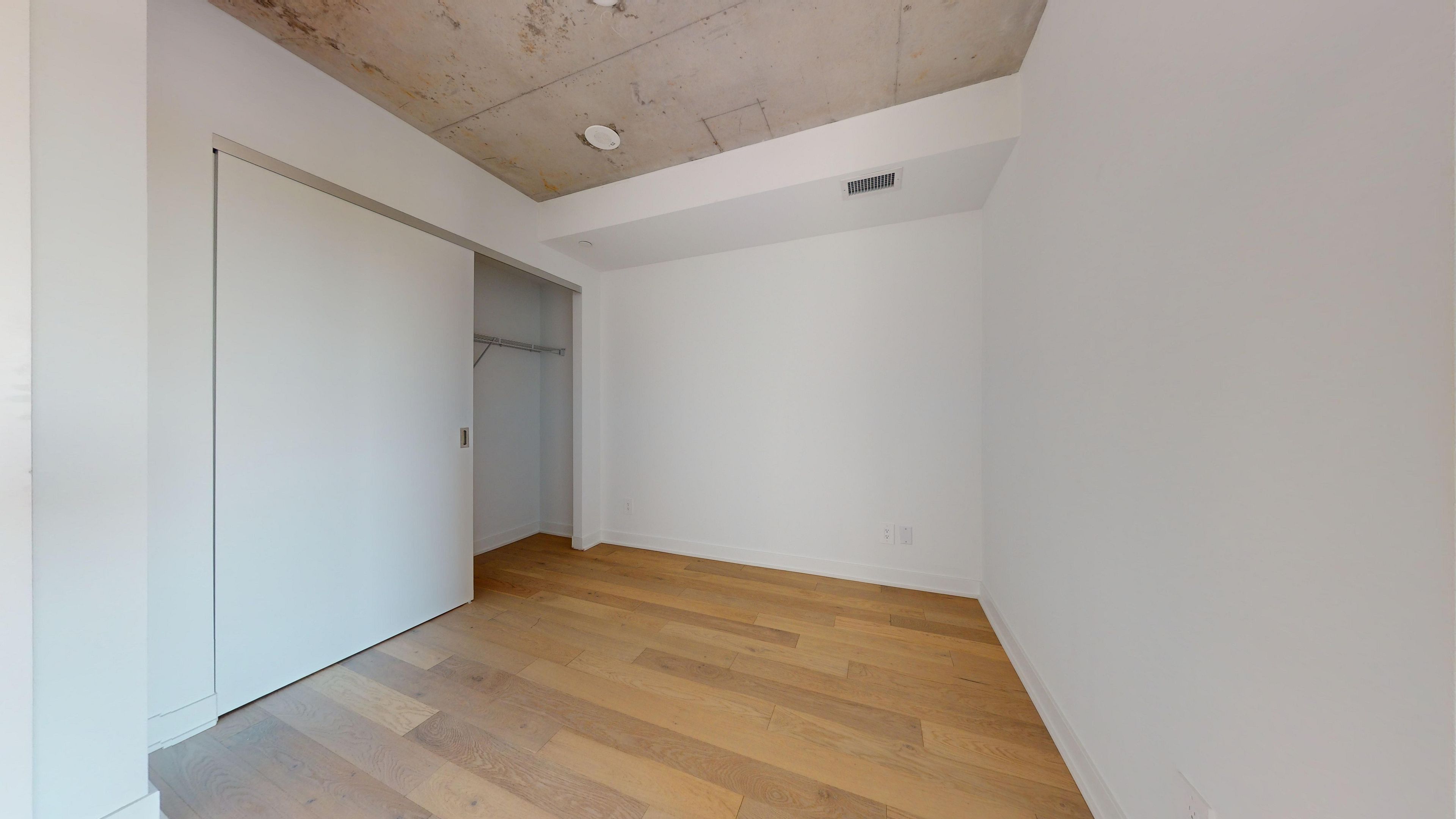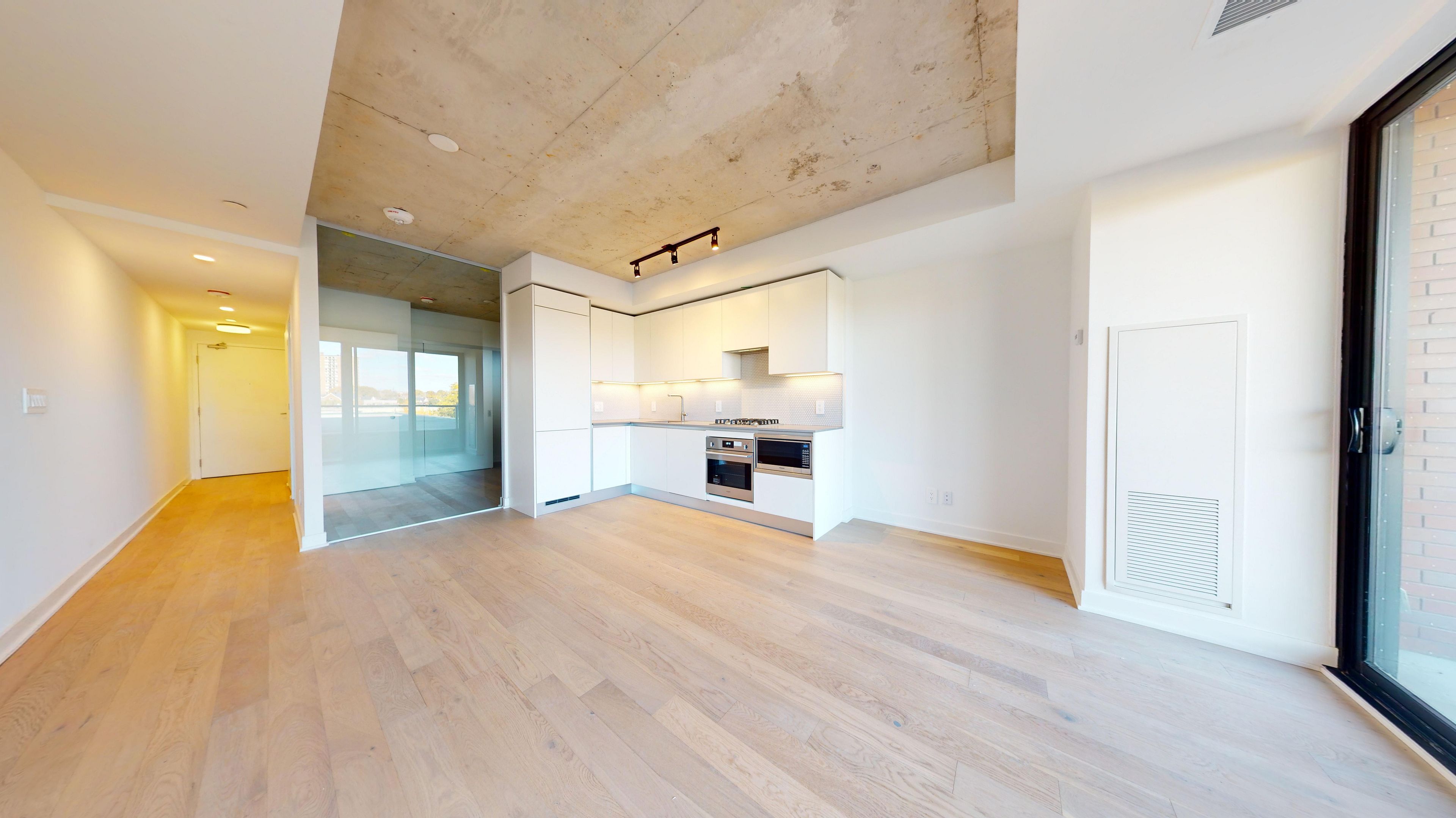 • Concrete ceilings and hardwood floors for a modern loft feel.
