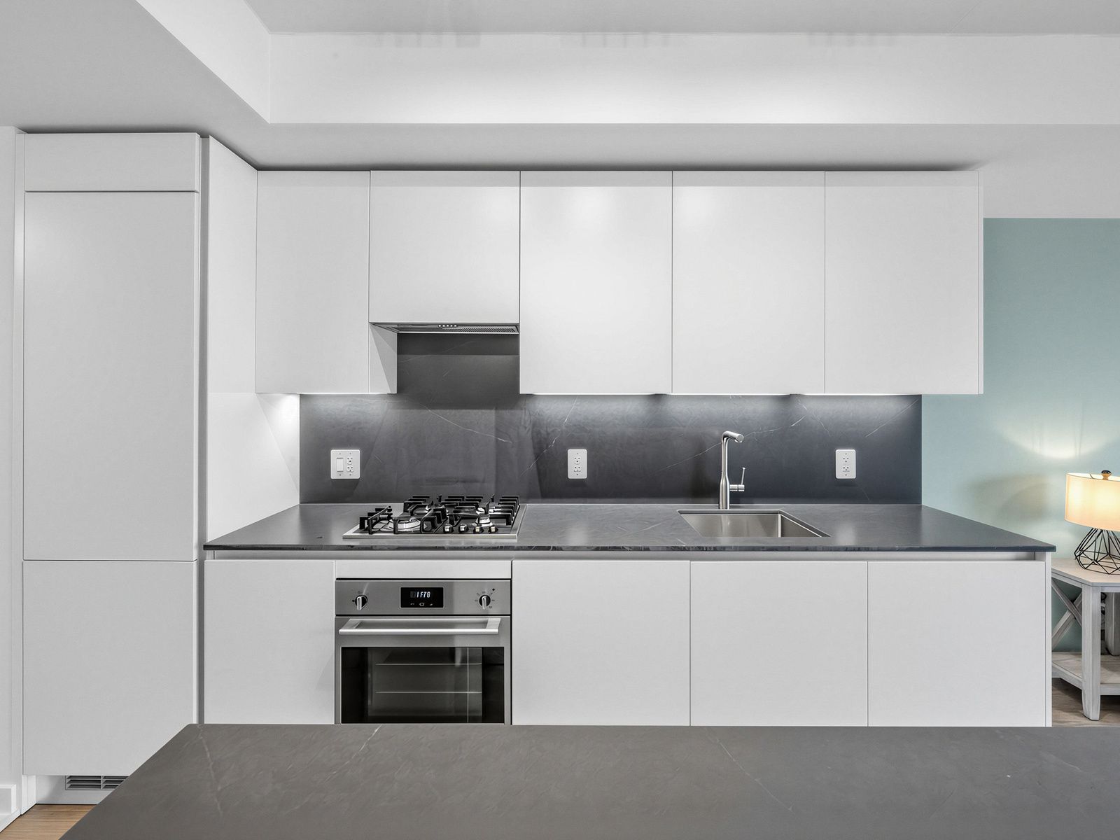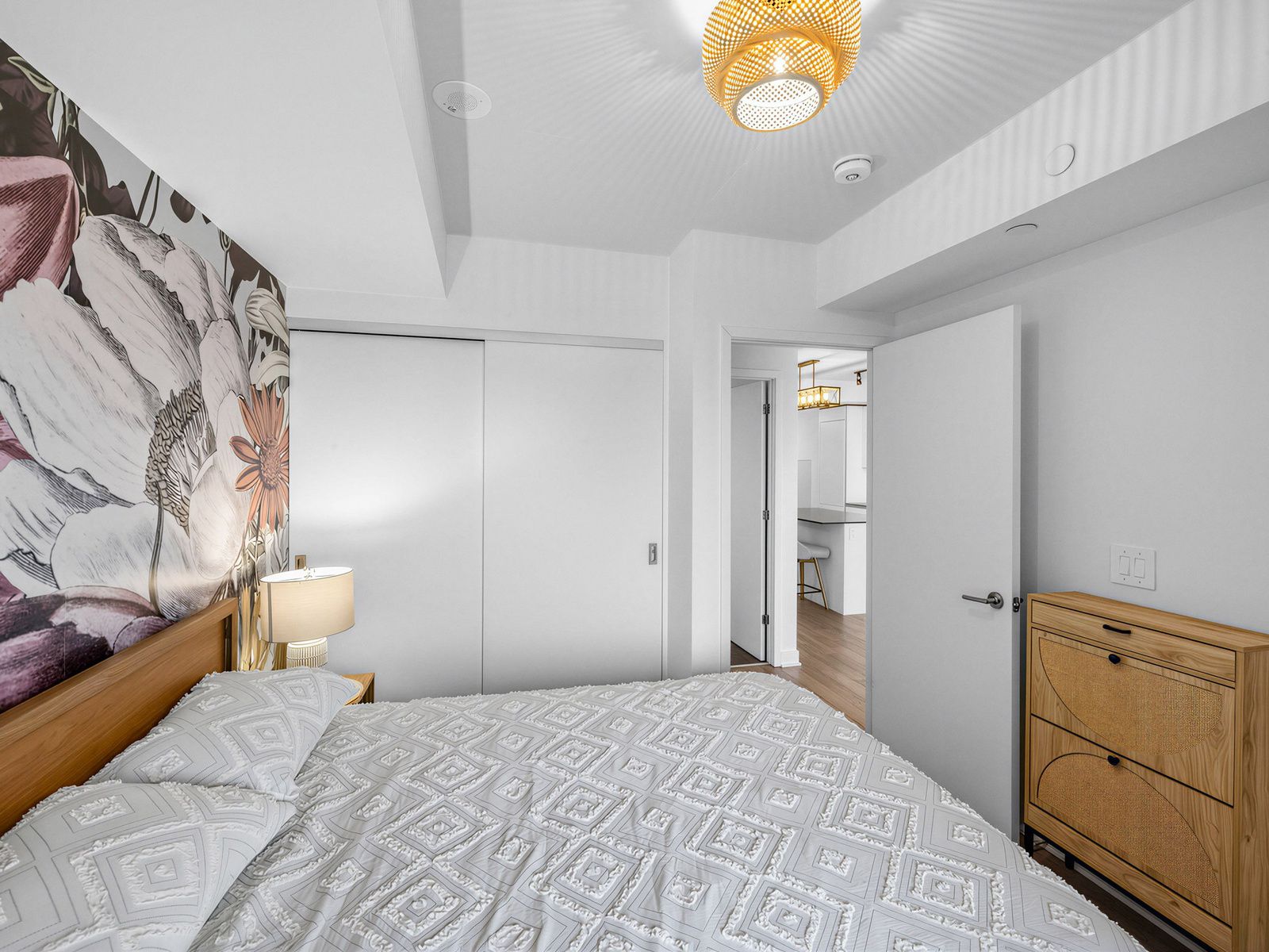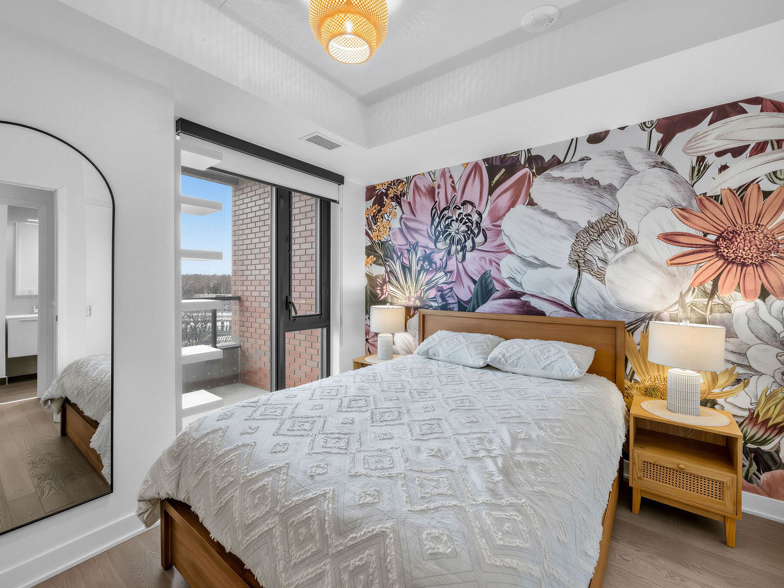 Bright & spacious 1 bed + den & 1 bath in the junction! Beautifully designed with stunning artistic touches throughout. Premium & modern finishes. A stunning kitchen featuring a large stone-top centre island, backsplash, gas cooktop & stainless steel appliances. The den features laminate flooring, built-in shelving & gorgeous wallpaper. Combined living & dining spaces illuminate the unit with an abundance of natural light with large window & walk-out to balcony. In the primary bedroom, you can find a large closet with organizers, a tall window & beautiful wallpaper. The modern bathroom features a stand up glass-enclosed shower, tile flooring, floating vanity & built-in storage with shelves. 1 stacked parking space. Can be rented furnished or non-furnished.