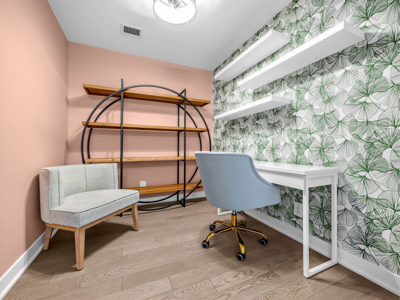 • Den includes built-in shelving and stylish wallpaper for added charm.