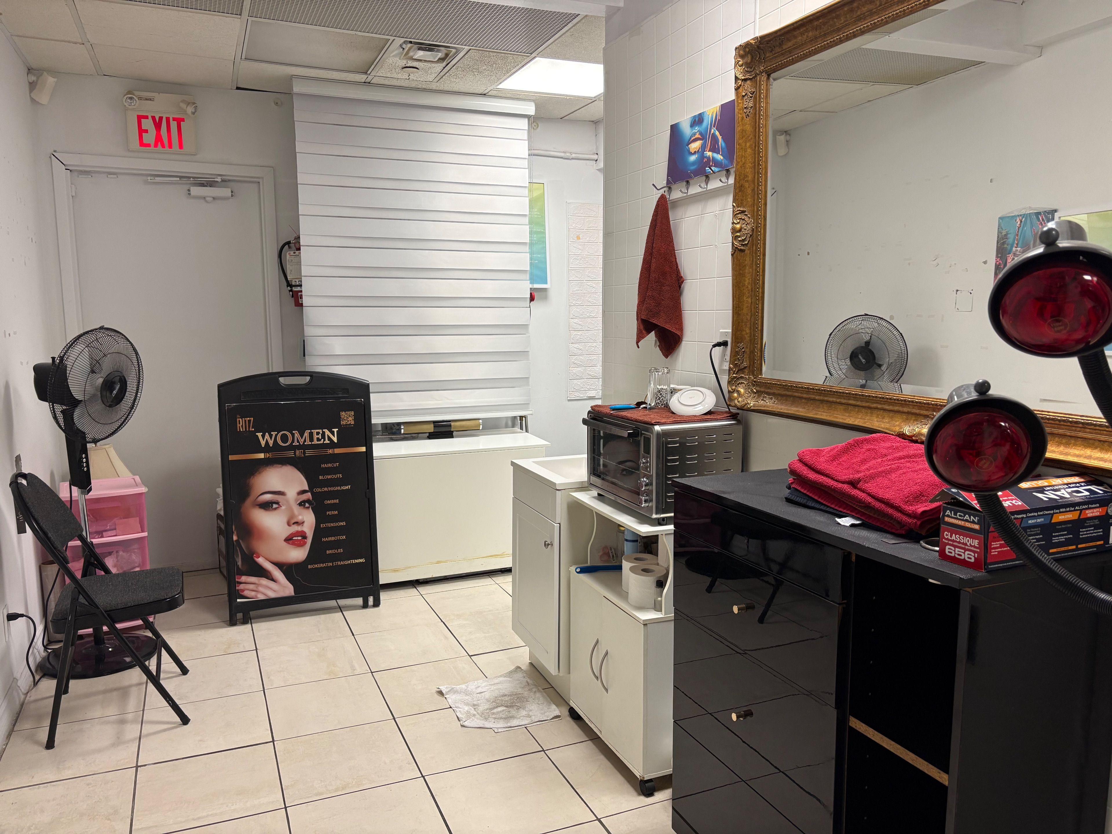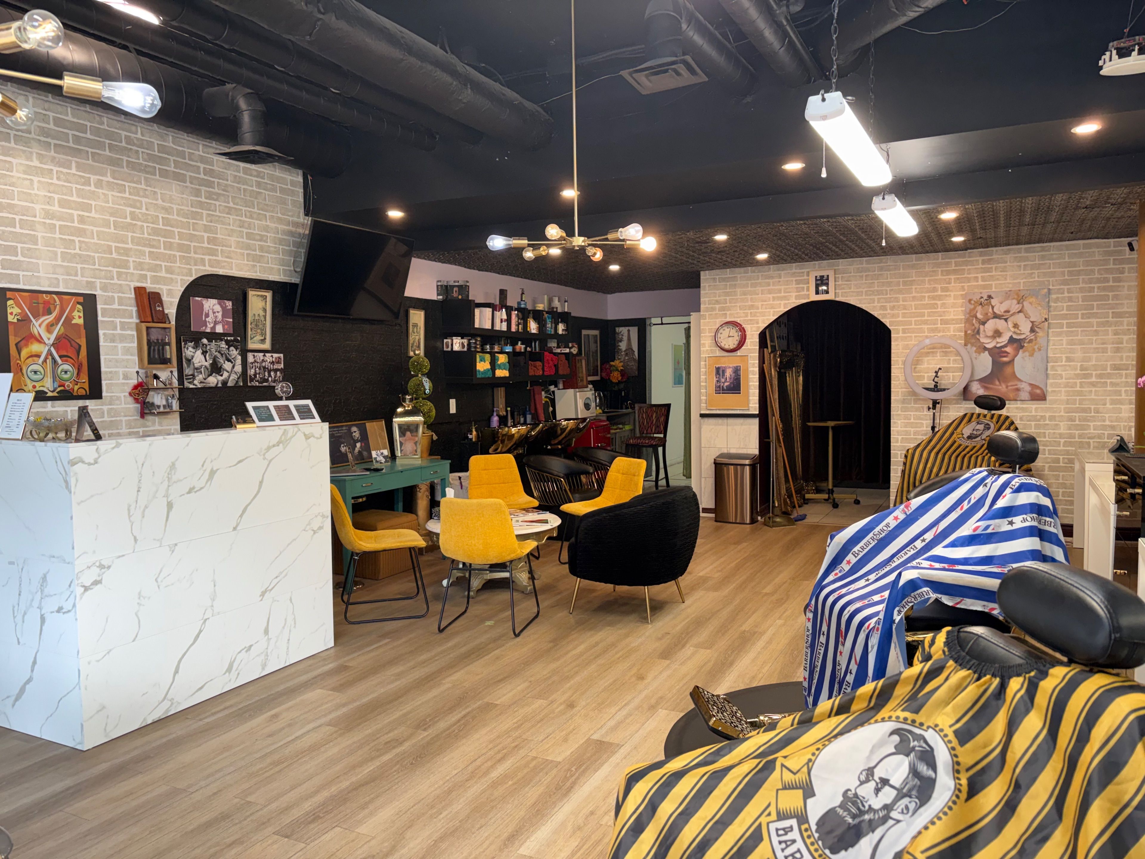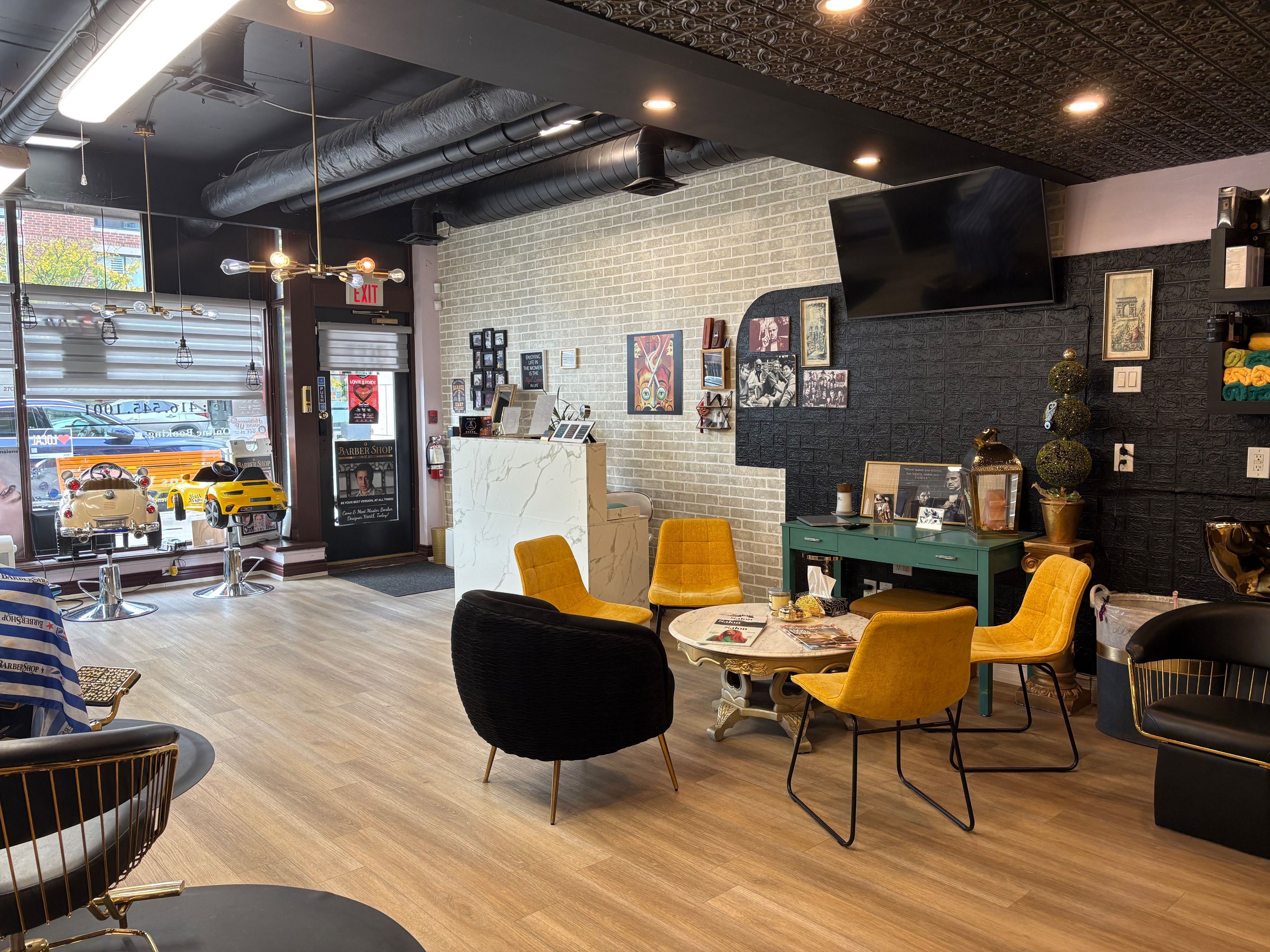 • Modern layout with fully equipped barber and styling stations.