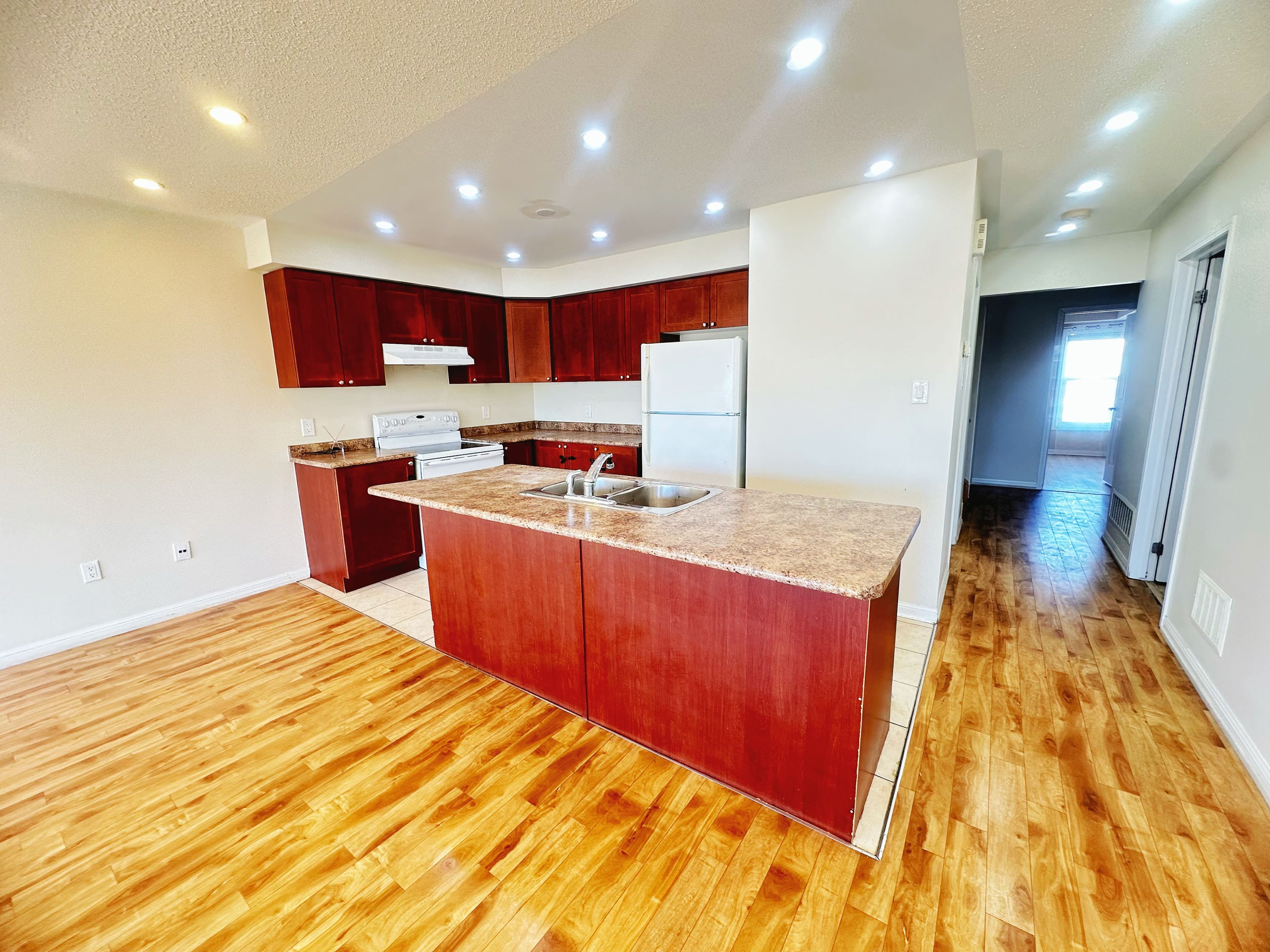 • Open concept kitchen overlooking a spacious family area.