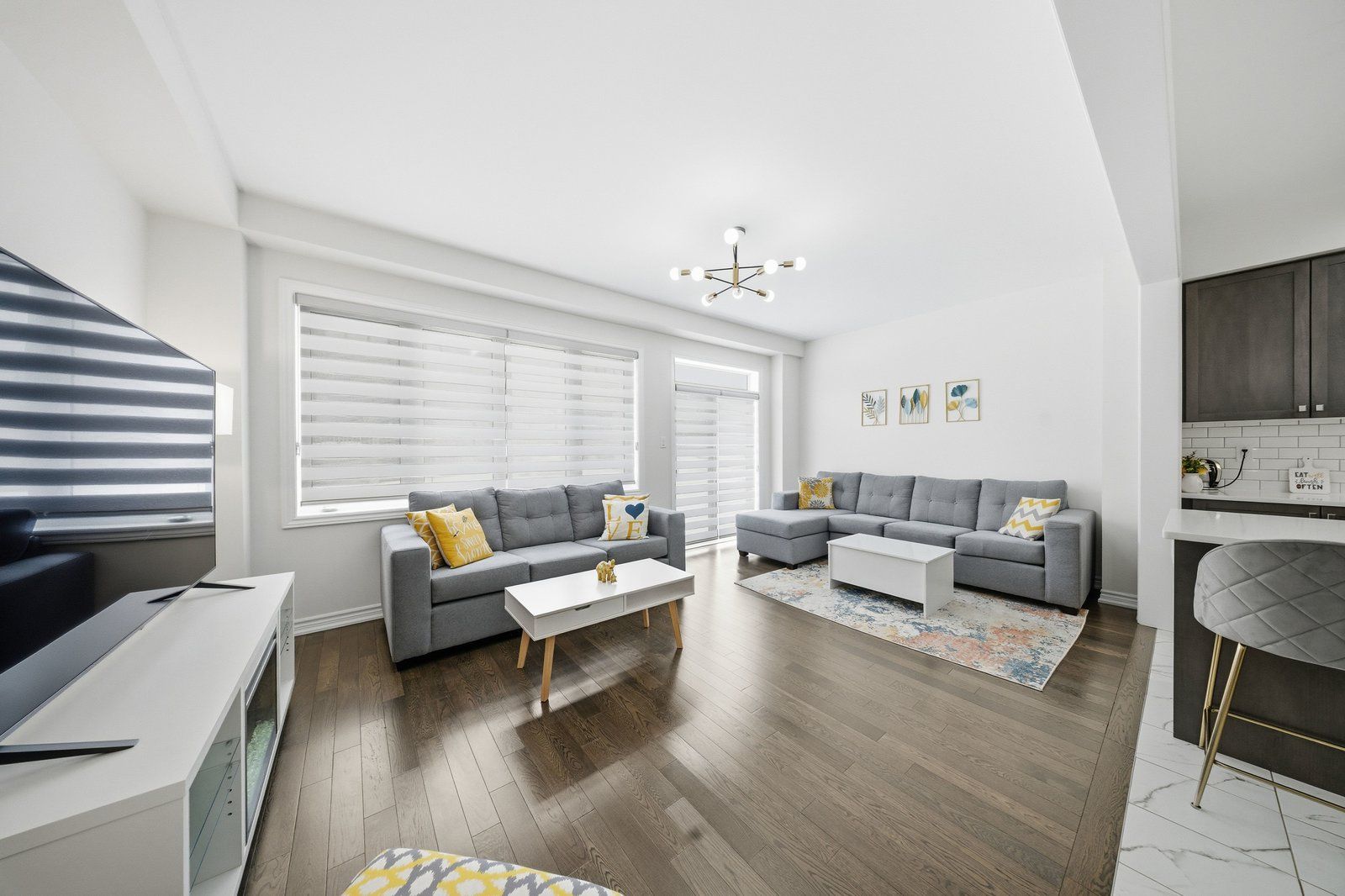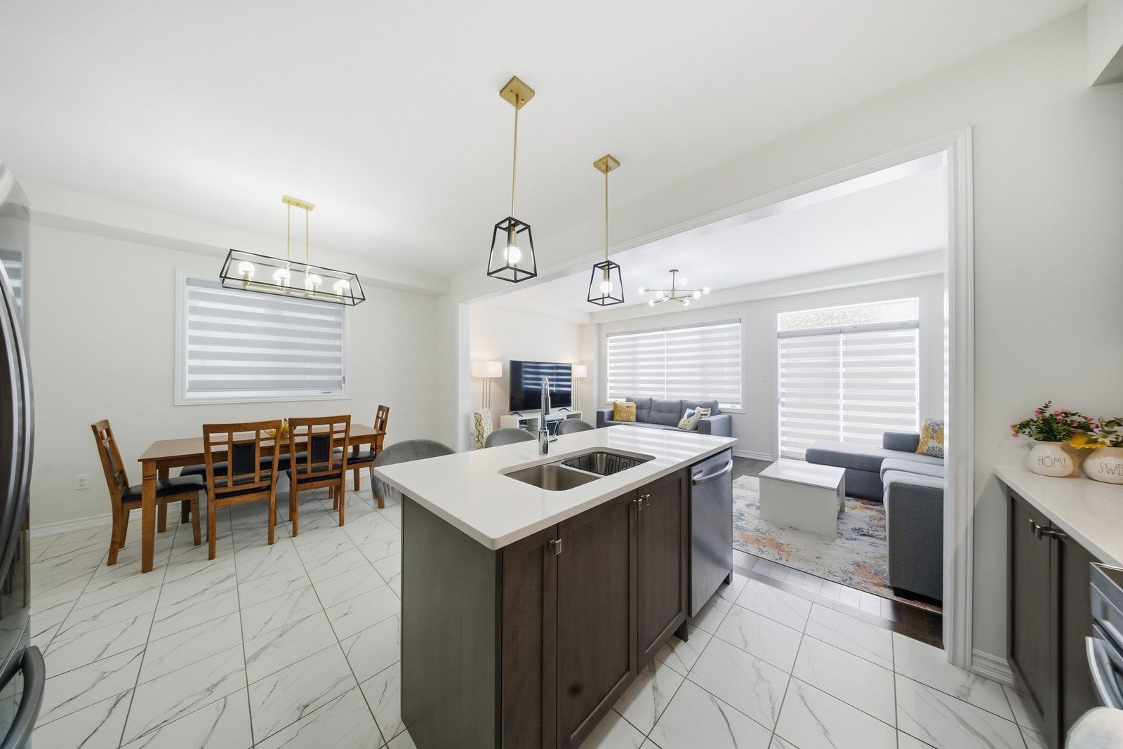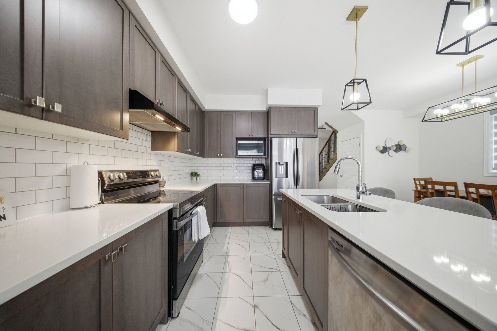 • Bright kitchen with quartz countertops and a large breakfast area.