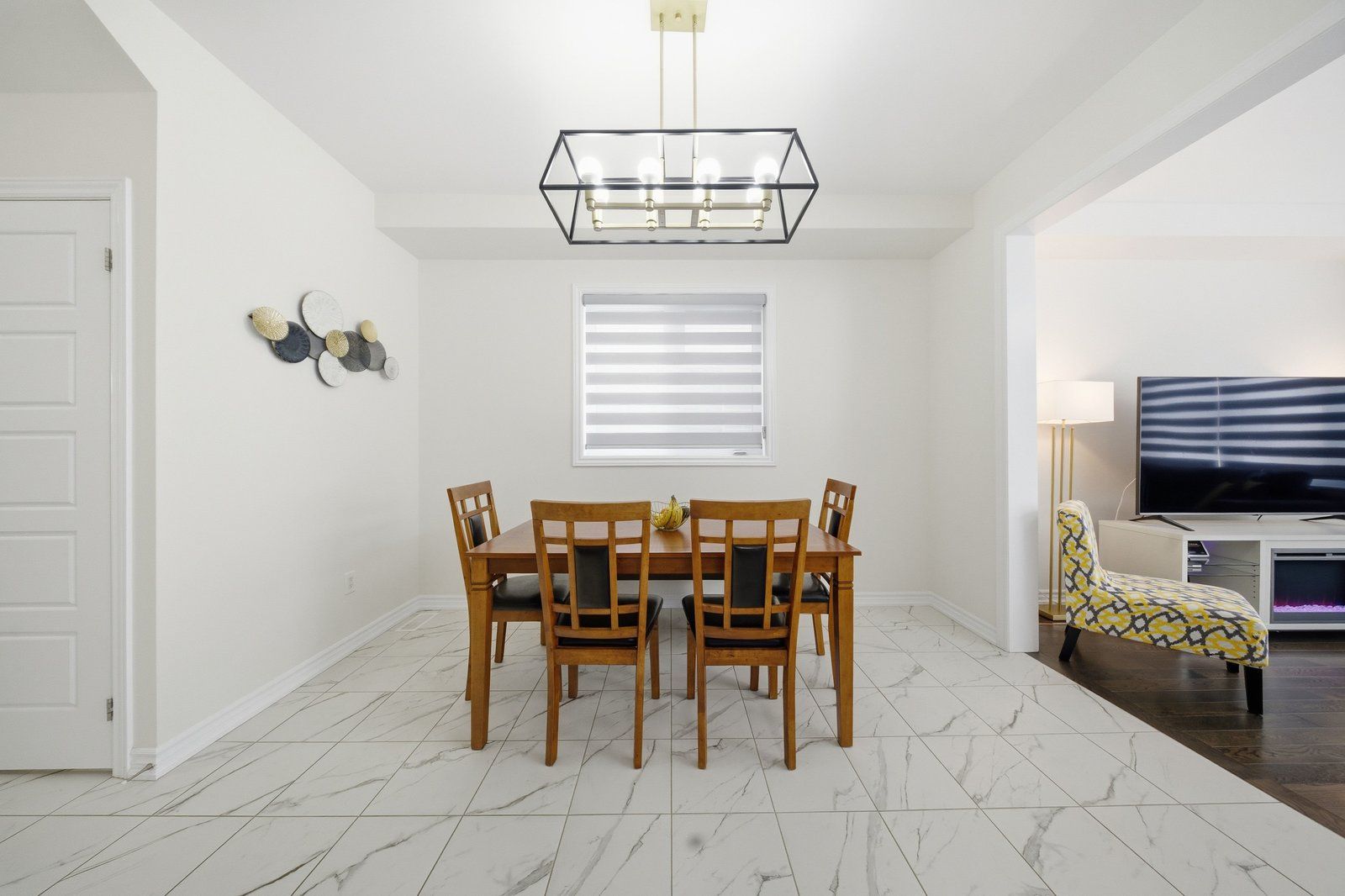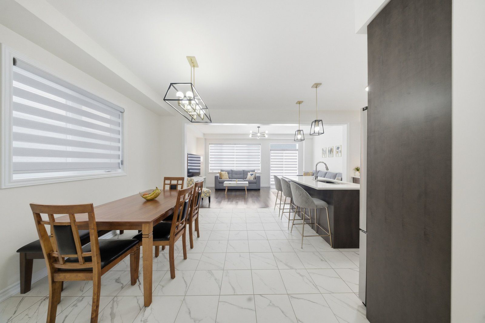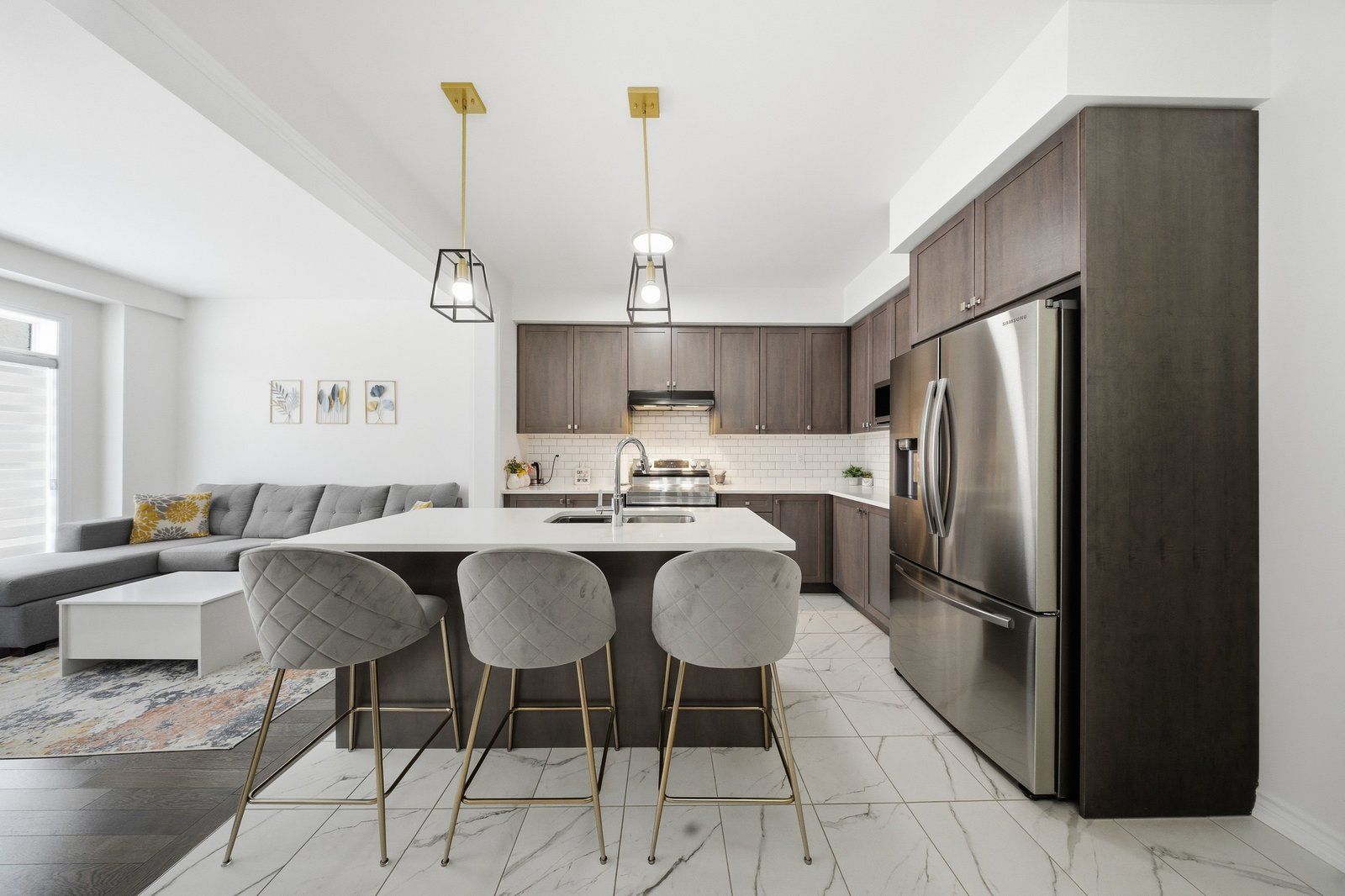• Bright kitchen with quartz countertops and a large breakfast area.