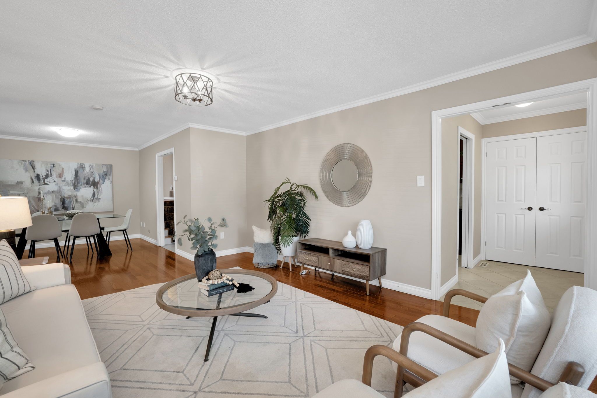 • Bright, open-concept living and dining areas with natural light from bay window.