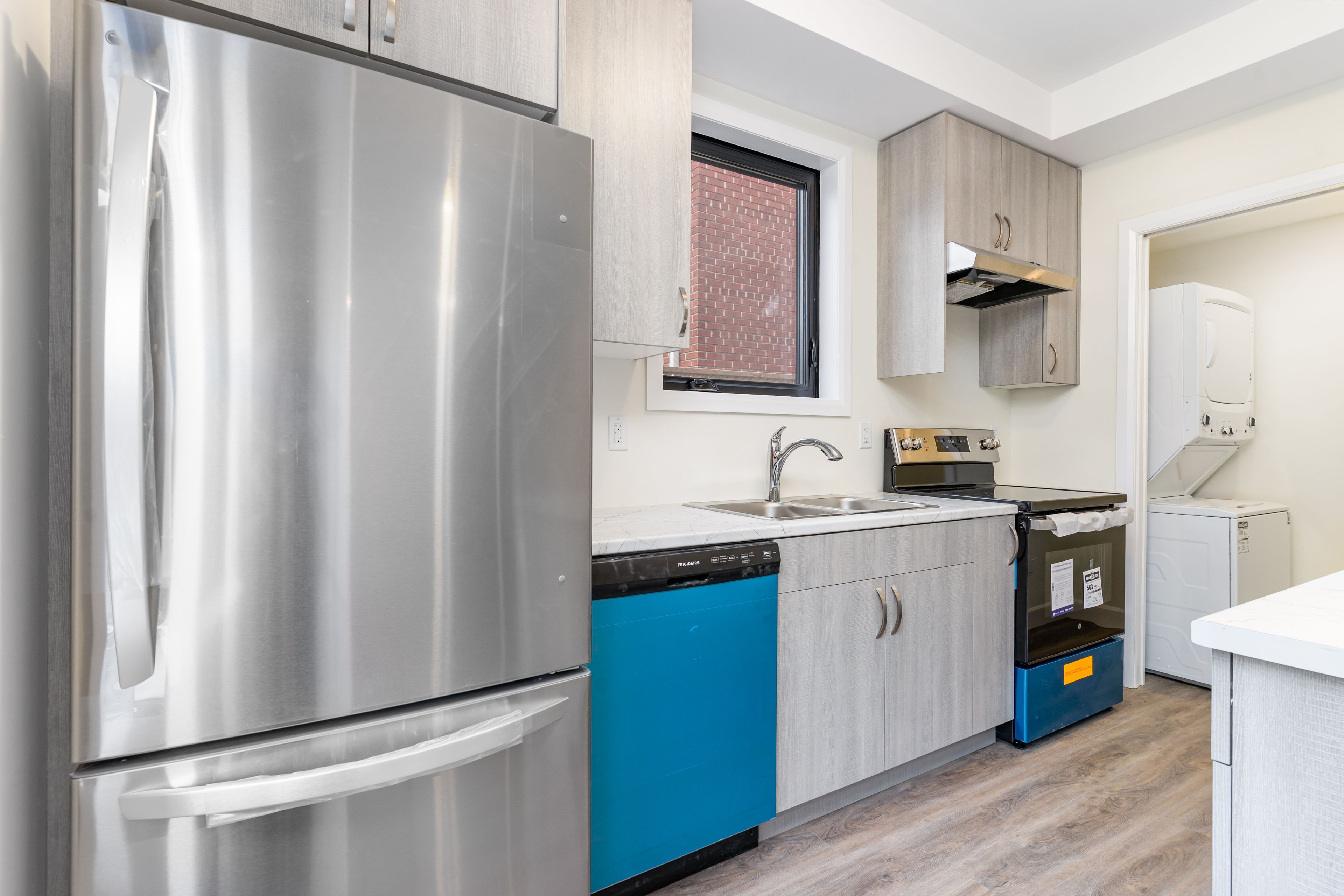 • Gourmet kitchen featuring sleek stainless steel appliances.