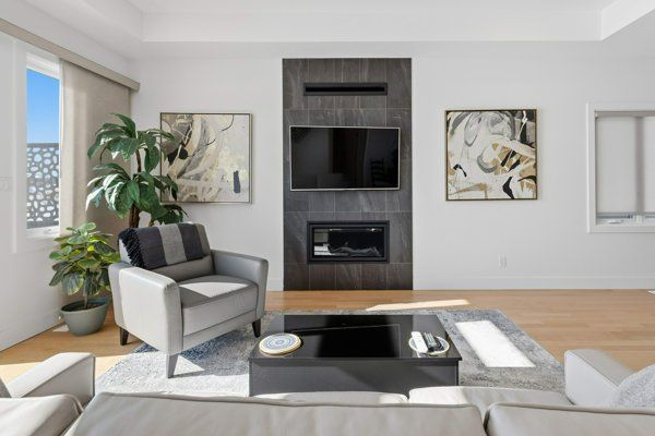 • Cozy living room with gas fireplace and natural light.