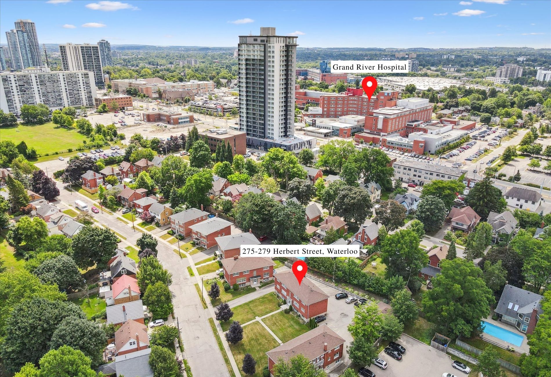 Welcome to 275, 277, and 279 herbert street in waterloo - an outstanding turnkey purpose-built three building apartment complex nestled in one of waterloos sought-after neighbourhoods. This investment opportunity features two 6-plex buildings and one 5-plex building, offering a total of 17 fully leased units with a solid rental history and strong income potential. Located within walking distance to grand river hospital (now known as waterloo regional health network at midtown), multiple lrt stops, a variety of shops, cafes, and popular restaurants, this well-maintained property blends urban convenience with long-term investment stability. Residents enjoy easy access to public transit, parks, schools, and waterloos vibrant core - making this an attractive address for tenants of all ages. The unit mix features one bachelor unit, six one-bedroom units, nine two-bedroom units, and one three-bedroom unit. Each building has been well maintained, and each is equipped with on-site laundry facilities for tenant convenience, and the property includes a detached garage with four rentable parking spaces, providing additional monthly income. This is a turn-key investment with low vacancy rates, reliable tenants, and a steady cash flow with great potential for future value appreciation, all located in a thriving and growing city known for its flourishing tech industry and universities. Whether you're a seasoned investor, new to multi-residential ownership, or looking for a possible future redevelopment opportunity, this property offers the perfect blend of location, stability, and upside. Don't miss your chance to own a strategic income-generating asset in the ever-expanding waterloo market.
