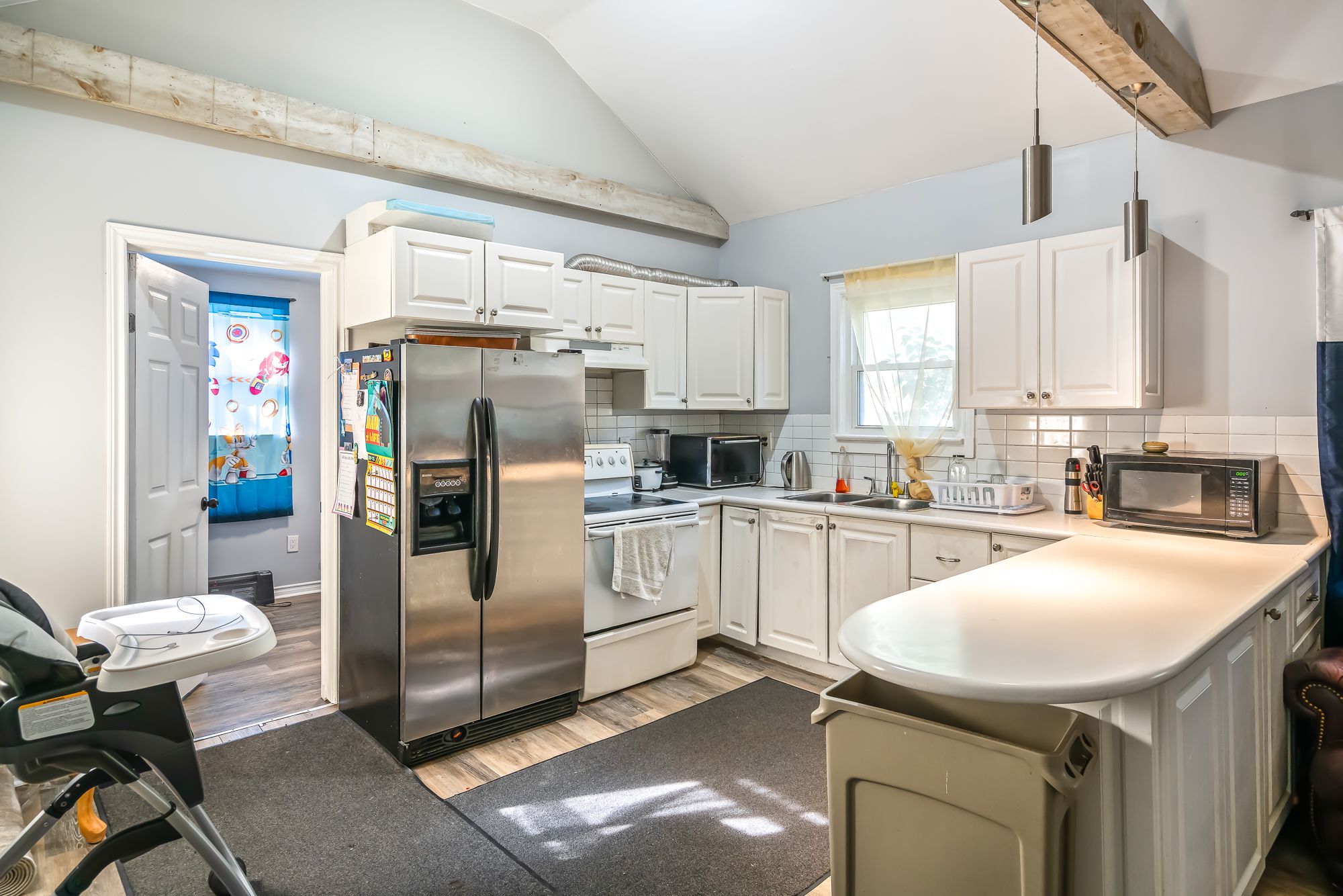 This centrally located duplex sits on a double lot with a large detached garage and has two main-level entrances. Inside, both units showcase bright, modern updates. The upper unit offers 2 bedrooms, while the lower unit provides 4 bedrooms, each with its own kitchen and 4-piece bathroom. A fenced backyard adds outdoor peace of mind for children and pets. Conveniently close to parks, local amenities, and just 6 minutes from the peace bridge border crossing.