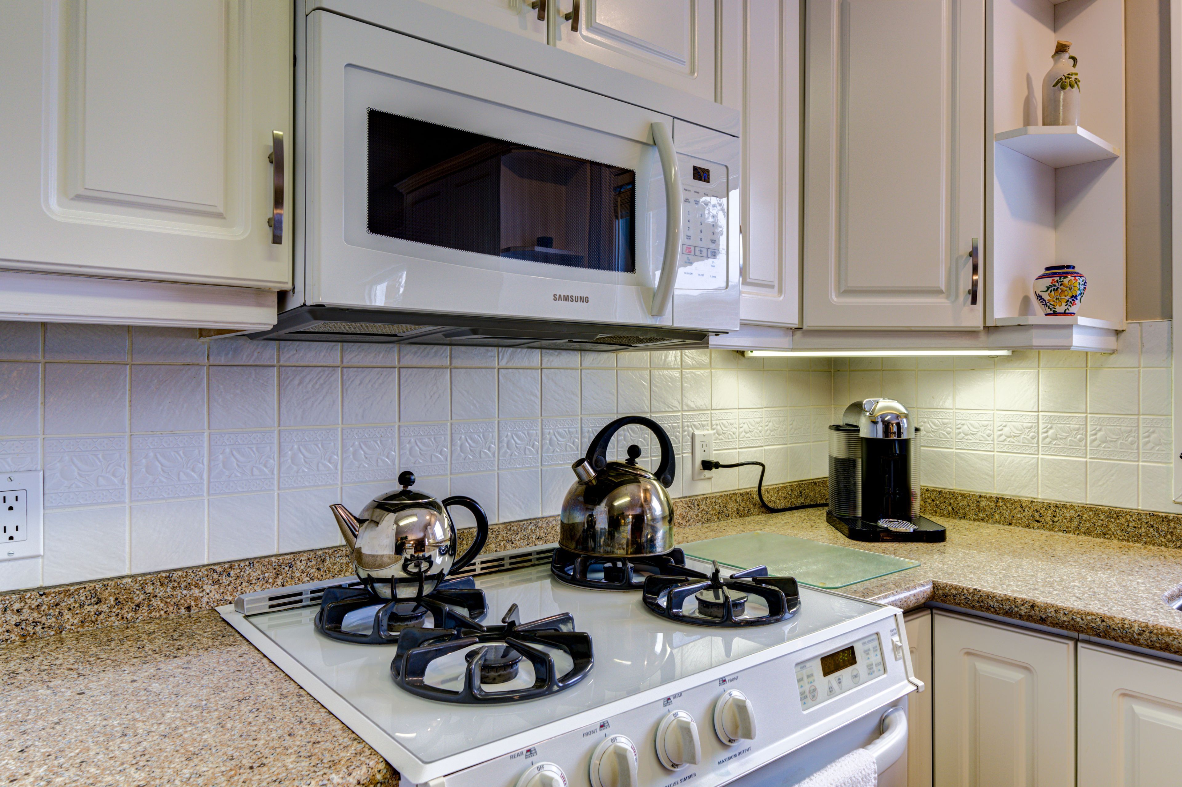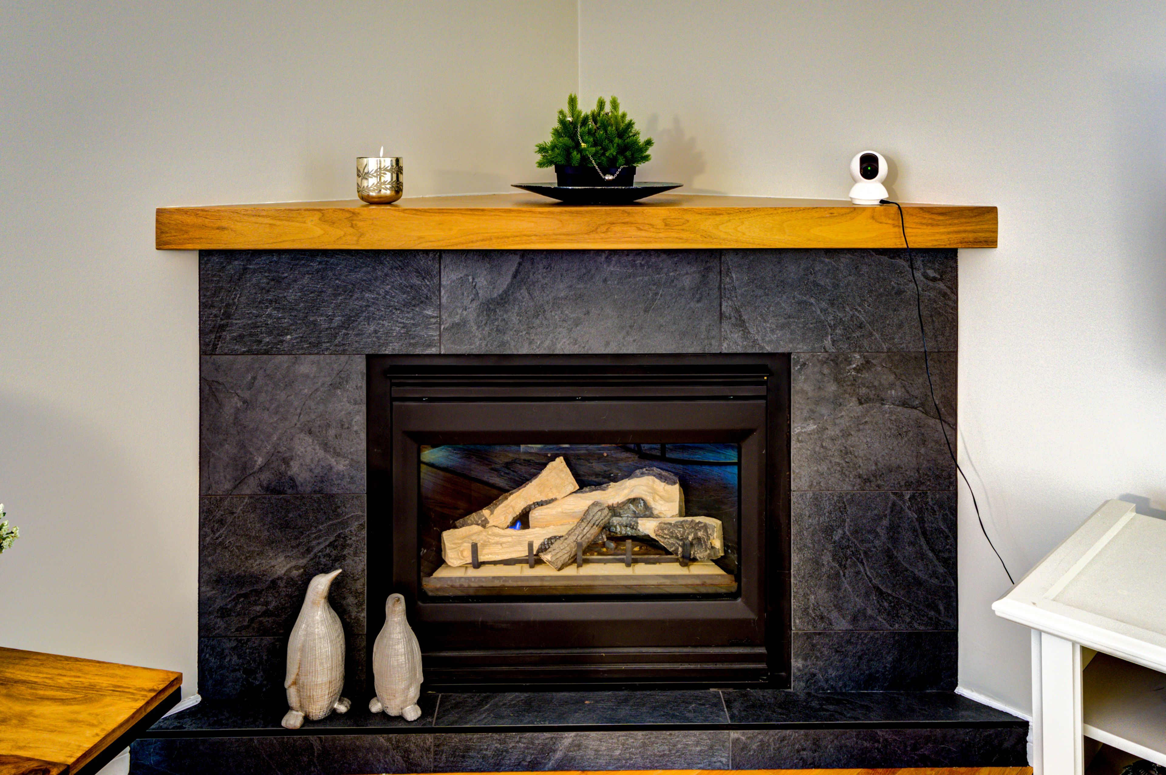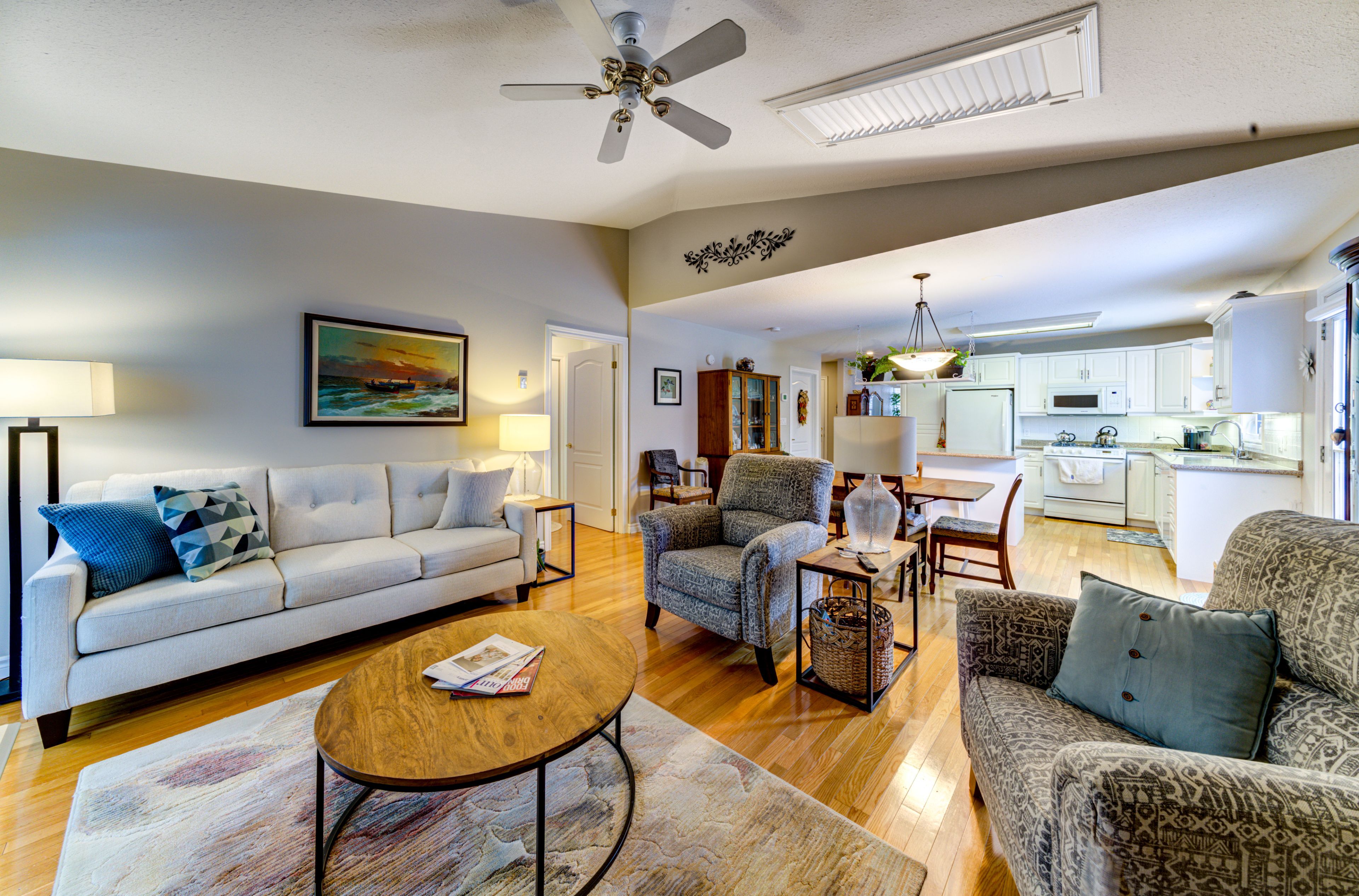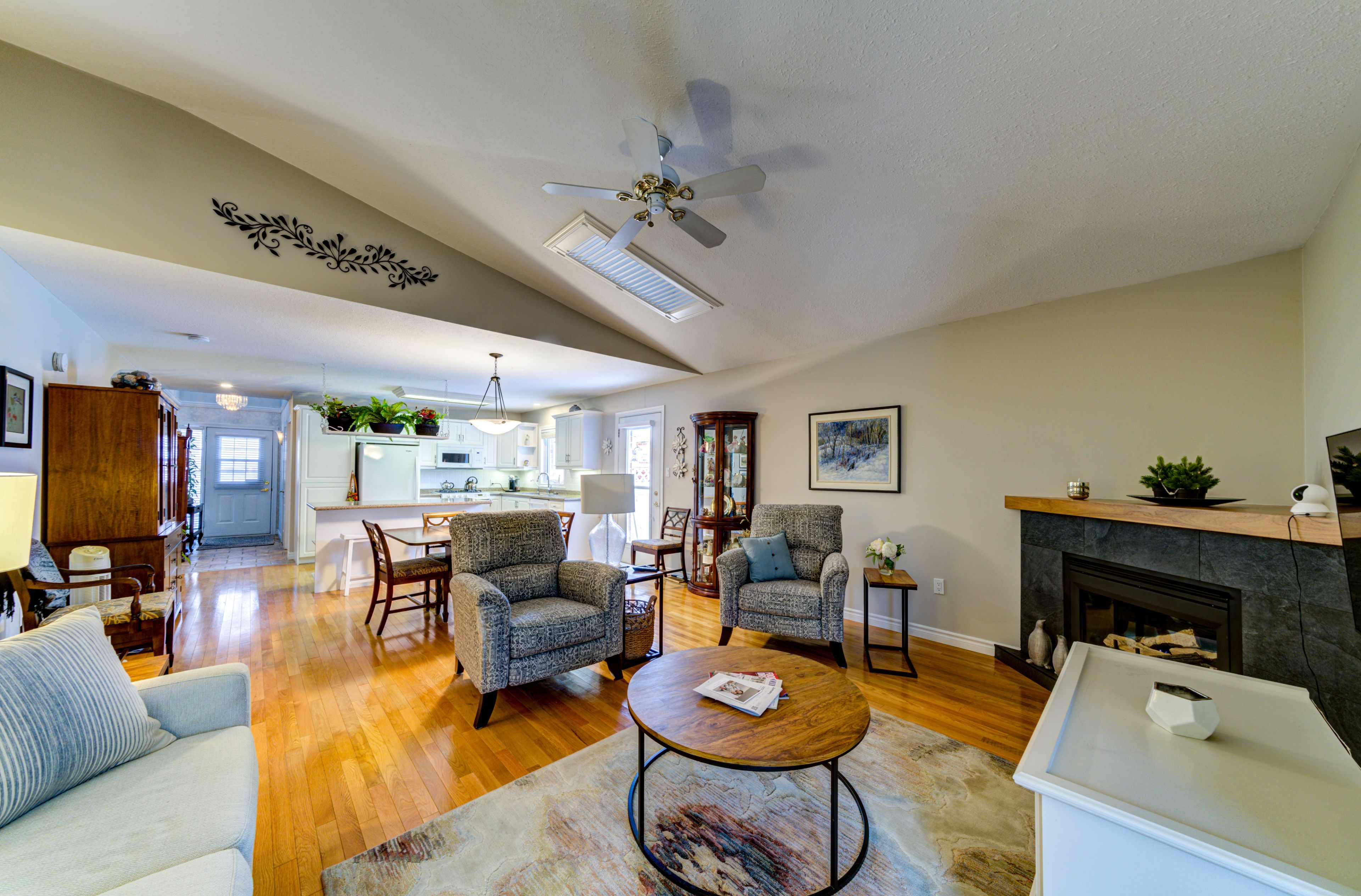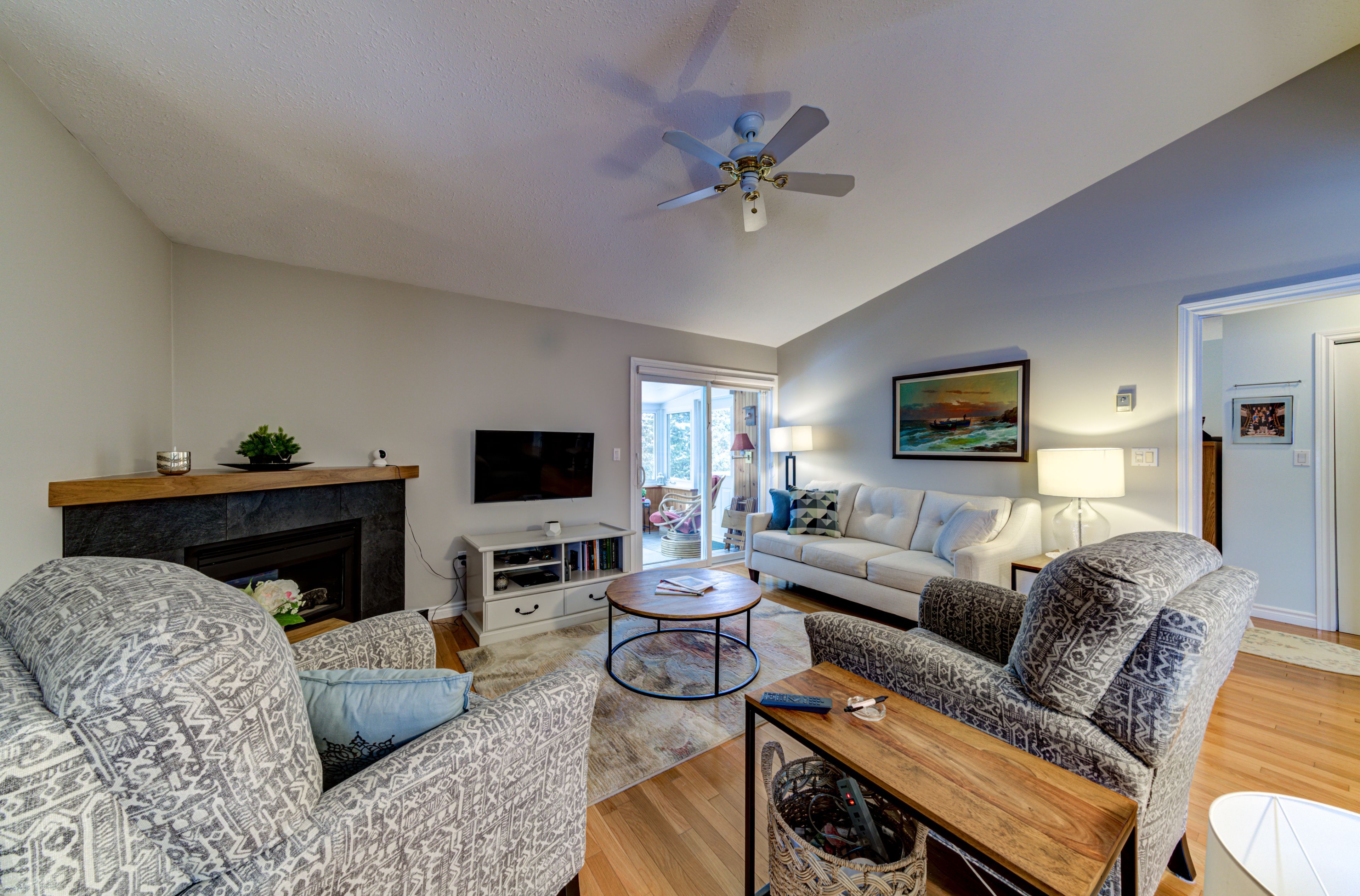 • Bright living room with gas fireplace and vaulted ceiling for natural light.