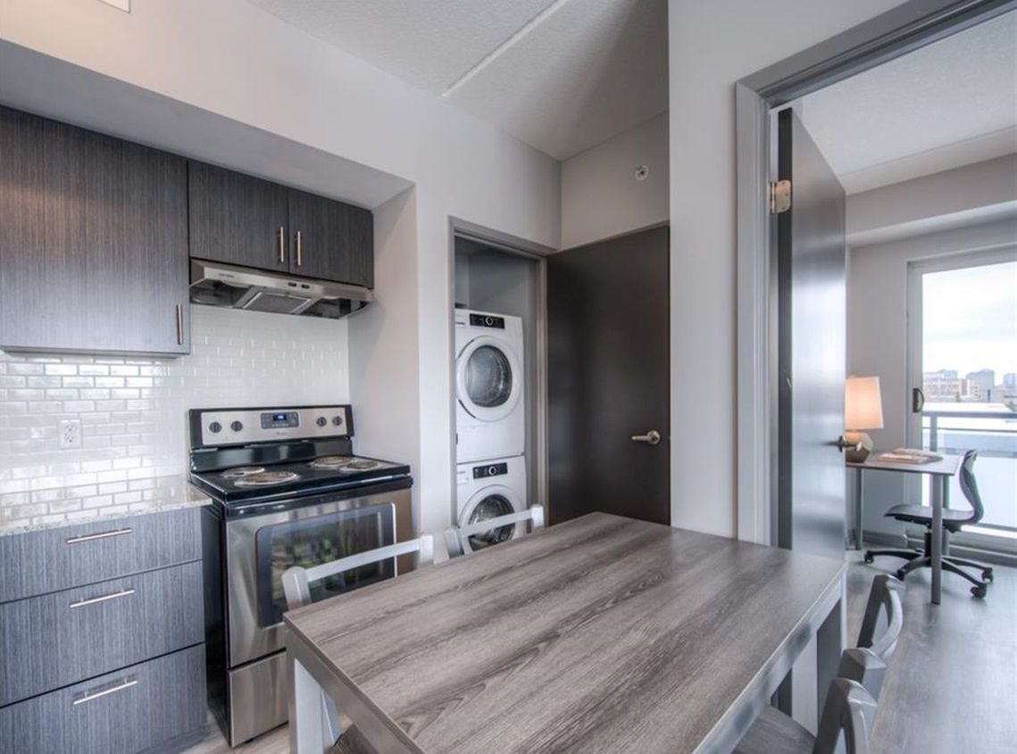 3rd floor corner unit with balcony, fully furnished 2 bedroom, 1 bathroom condo across the road from wlu's lazaridis school of business & economics ~ walk to wilfred laurier, u of waterloo, shopping, restaurants & transit stops. The primary bedroom has a walkout to the balcony. 2 years old with modern finishes, stainless steel appliances, granite countertops, in-suite laundry, laminate flooring and a 4pc bathroom. Unit comes complete with dishwasher, fridge, stove, stackable in-suite washer & dryer, 2 double bed frames, 2 mattresses, 1 nightstand, 2 desks, 2 chairs, 1 sofa, 1 coffee table, 1 media unit, 1 50" tv, 1 dining table, 4 chairs. The buildings at 275 larch will include a games room, theatre room, business centre, yoga room & fitness room. Rent includes water, gas/heat, central air, & high-speed wifi. Street parking or rent a spot underground for a reasonable cost from someone in the building.