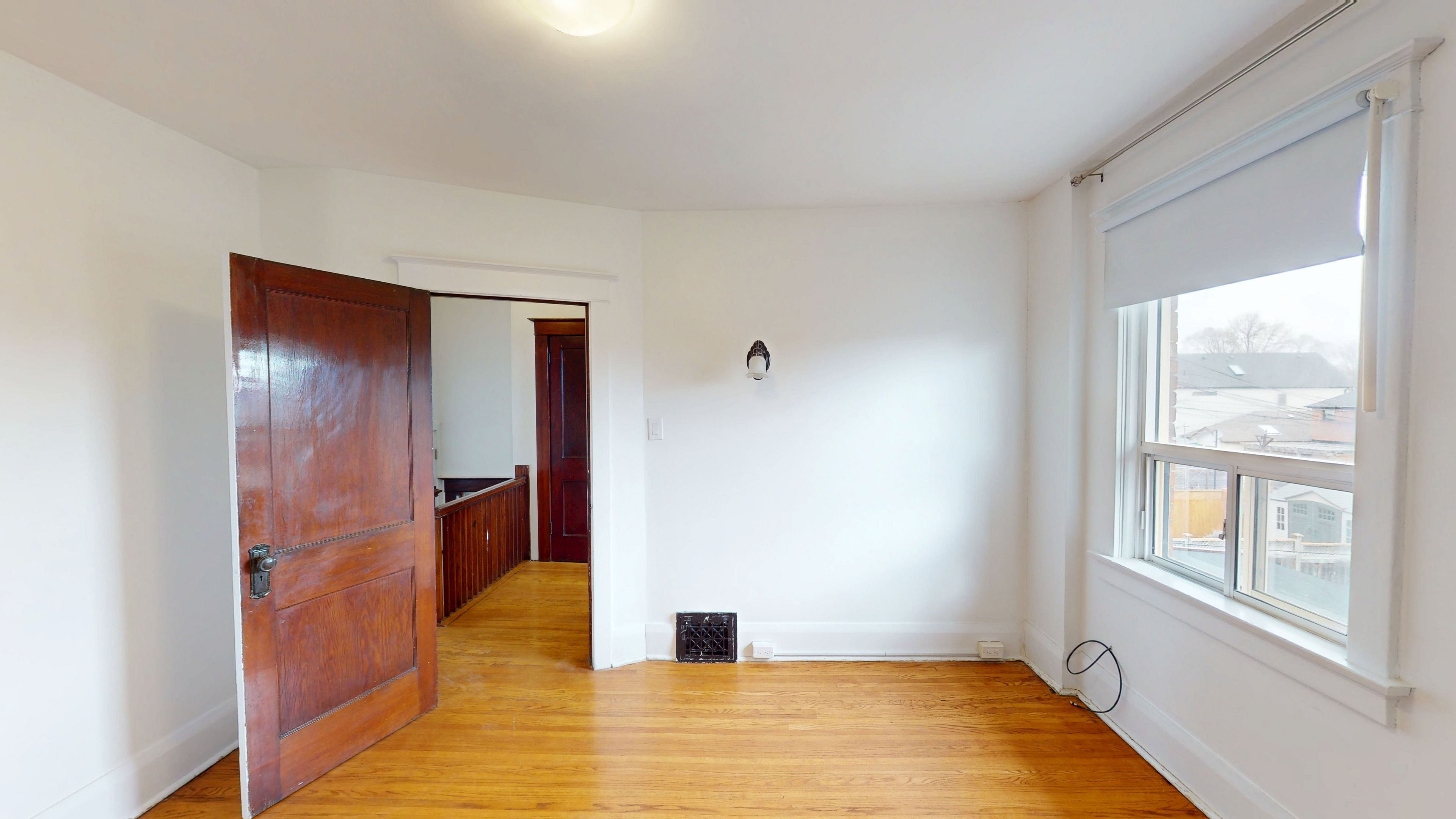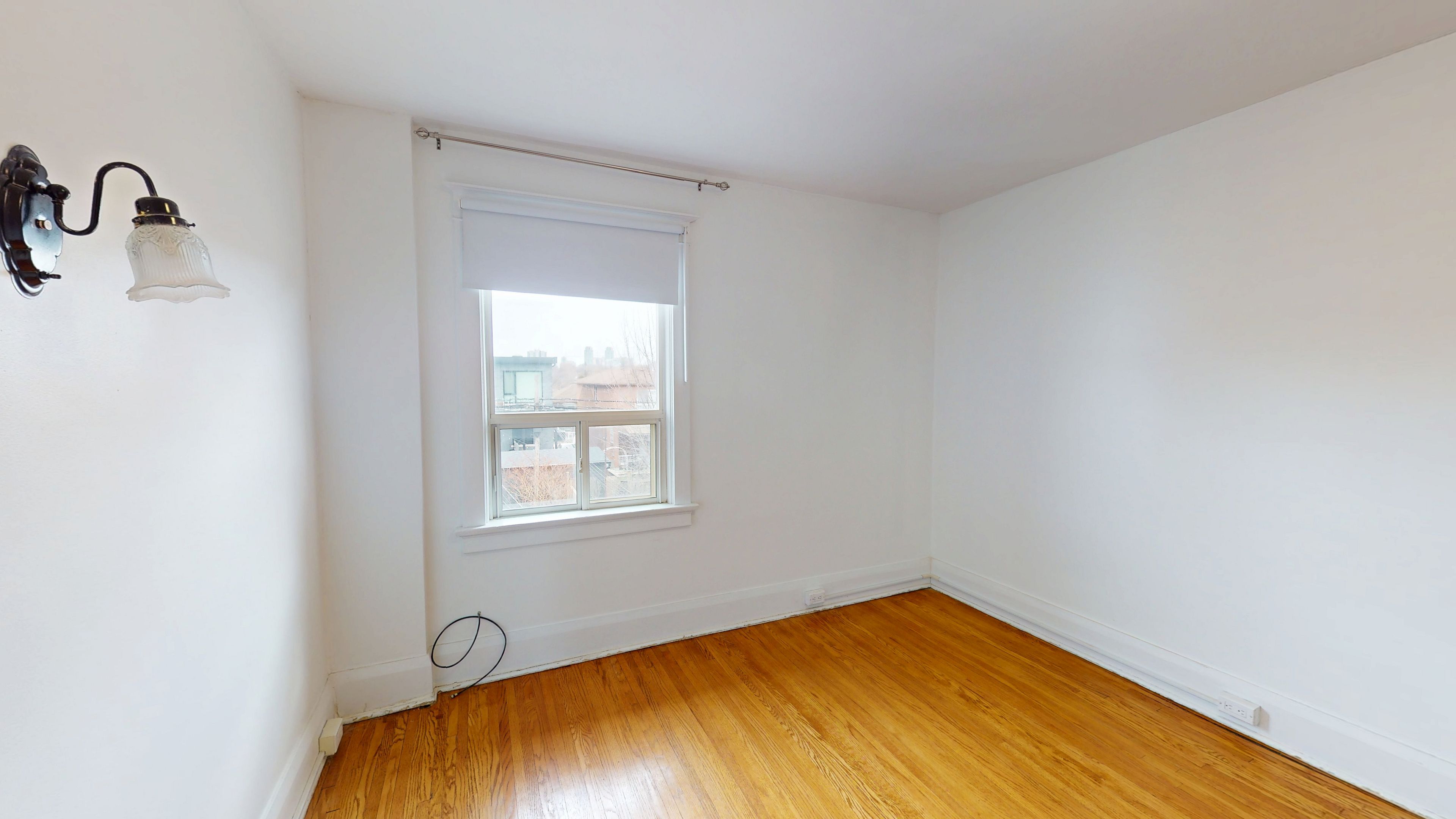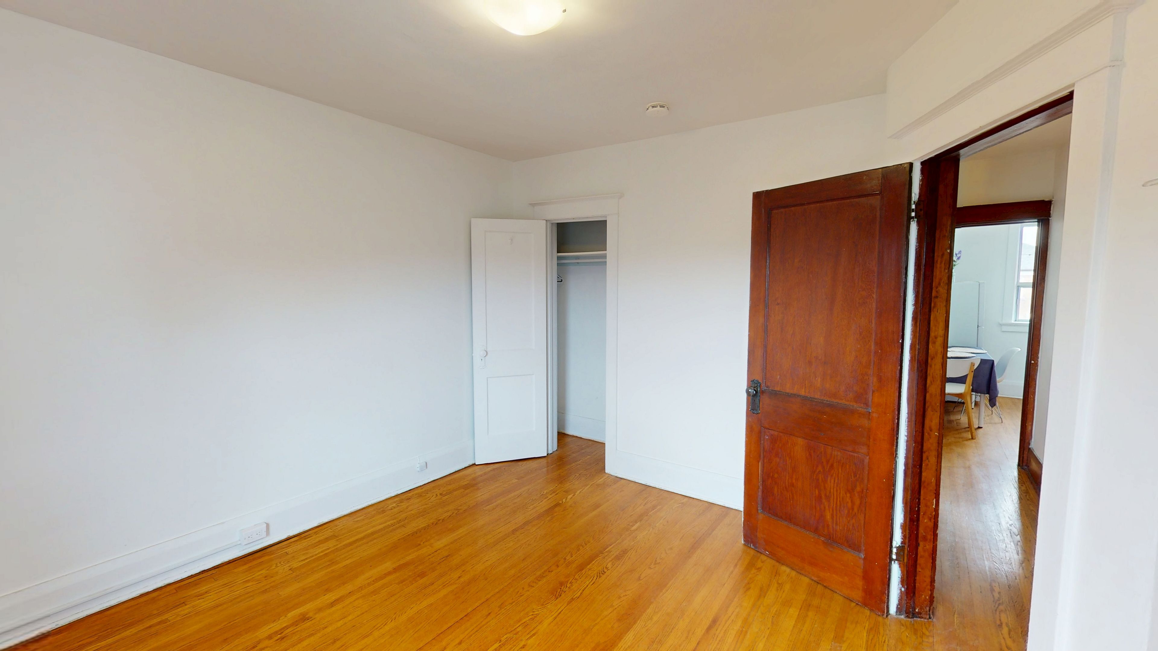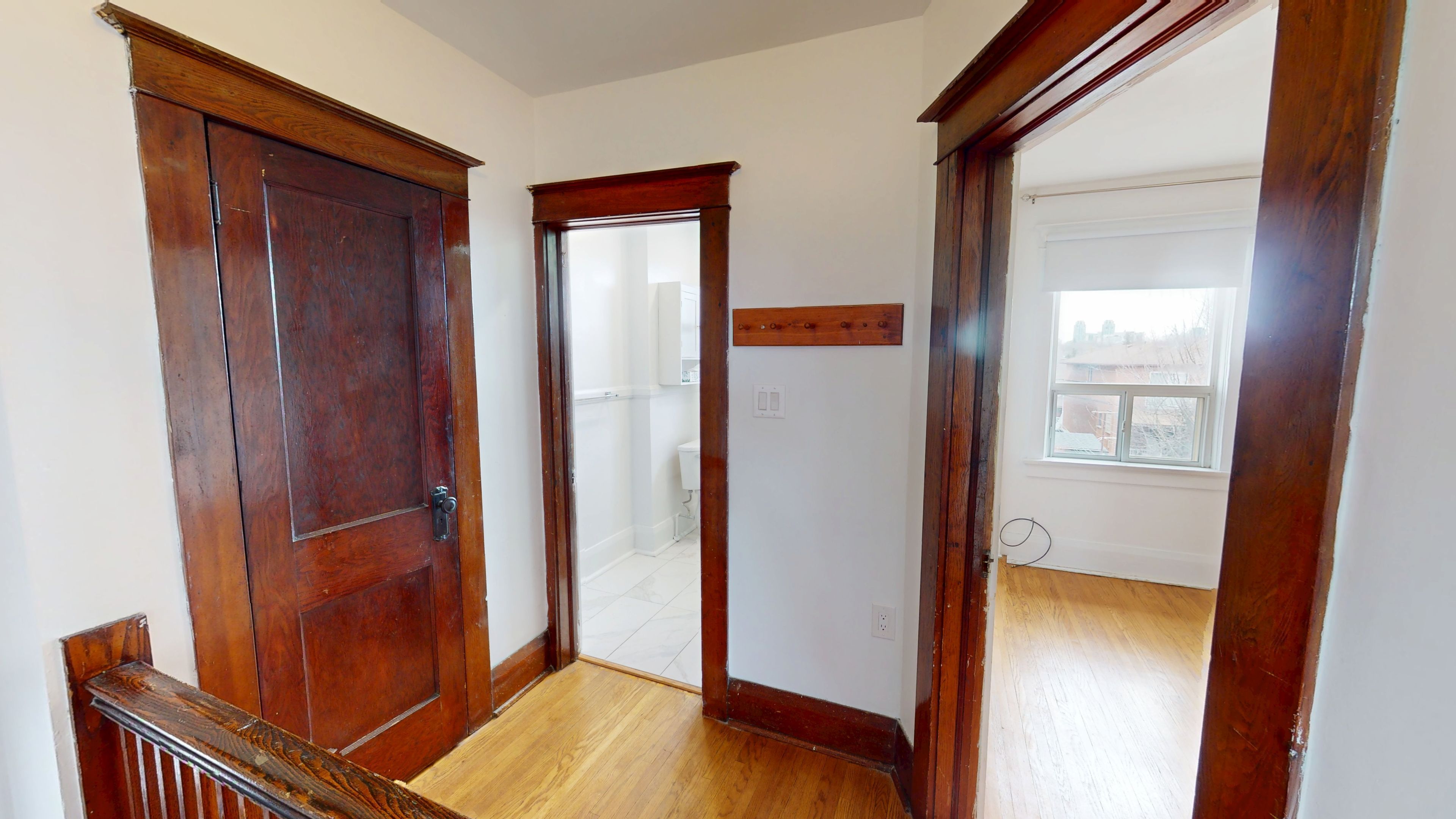 • Bright upper-level apartment filled with natural light and wood accents.