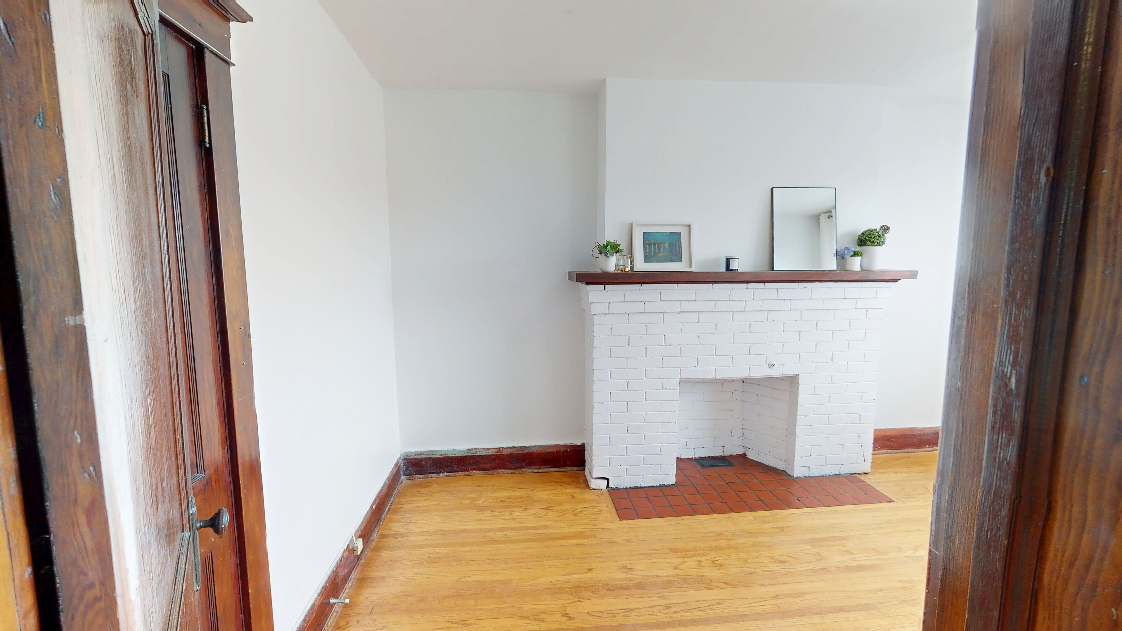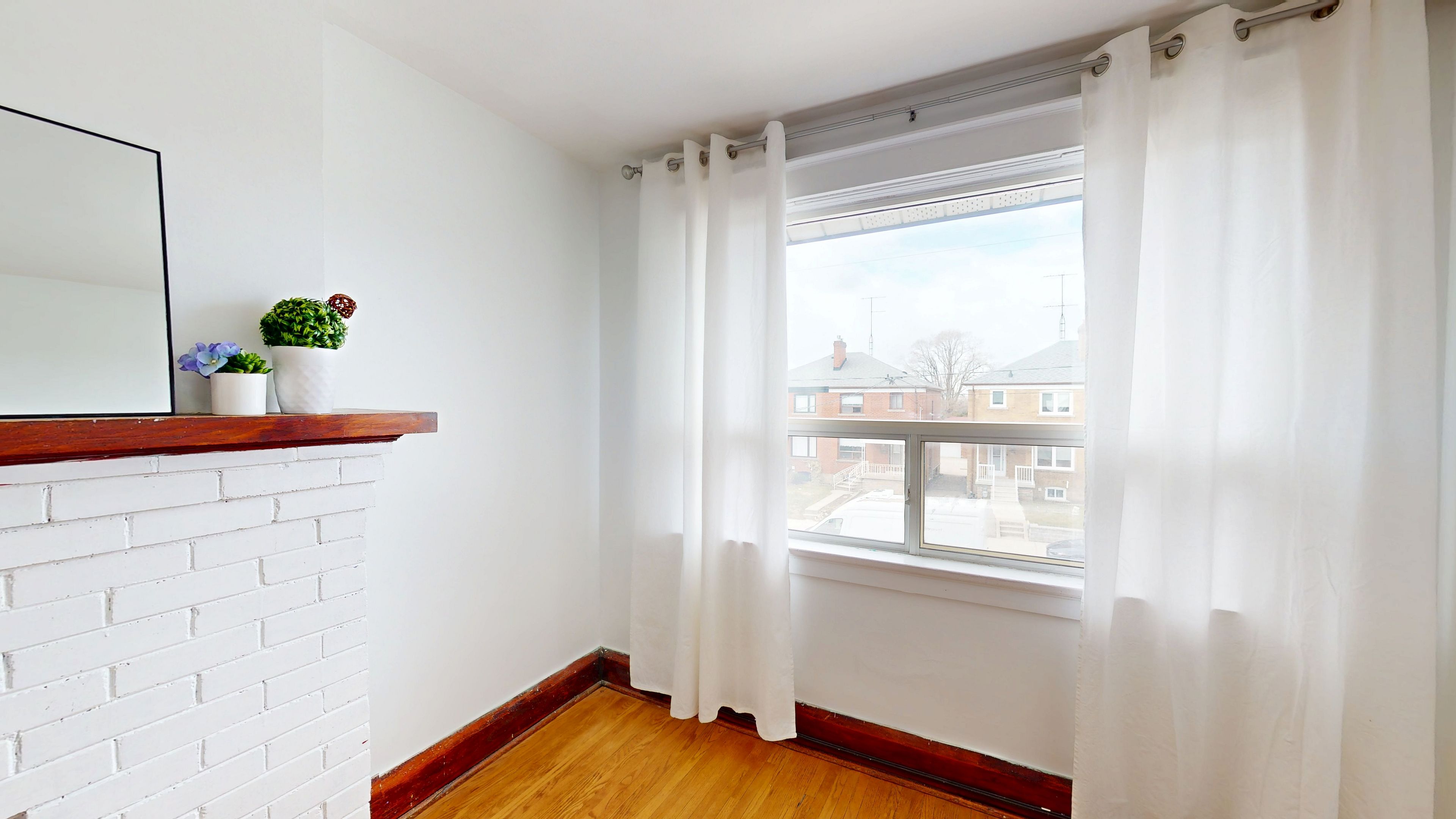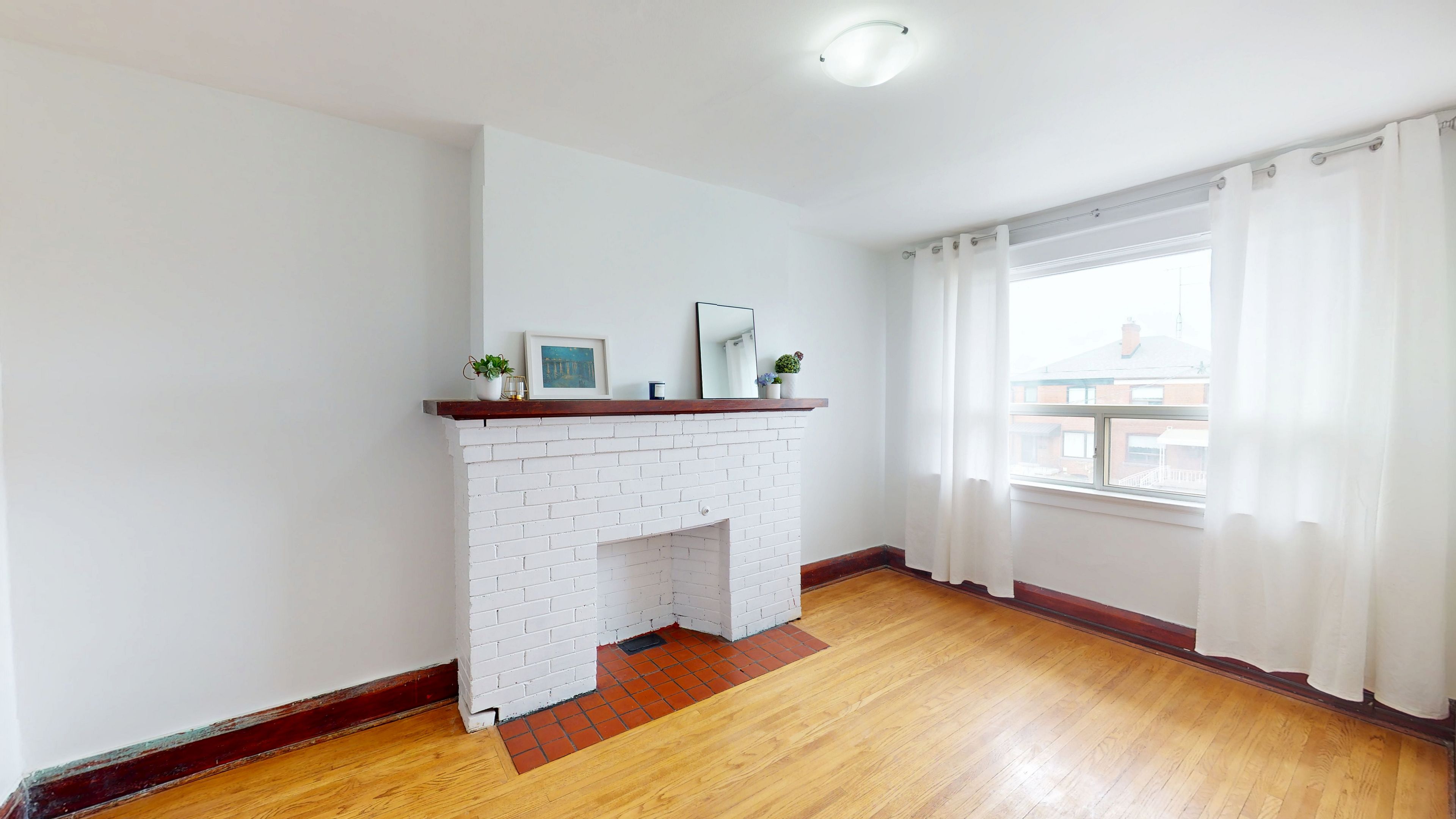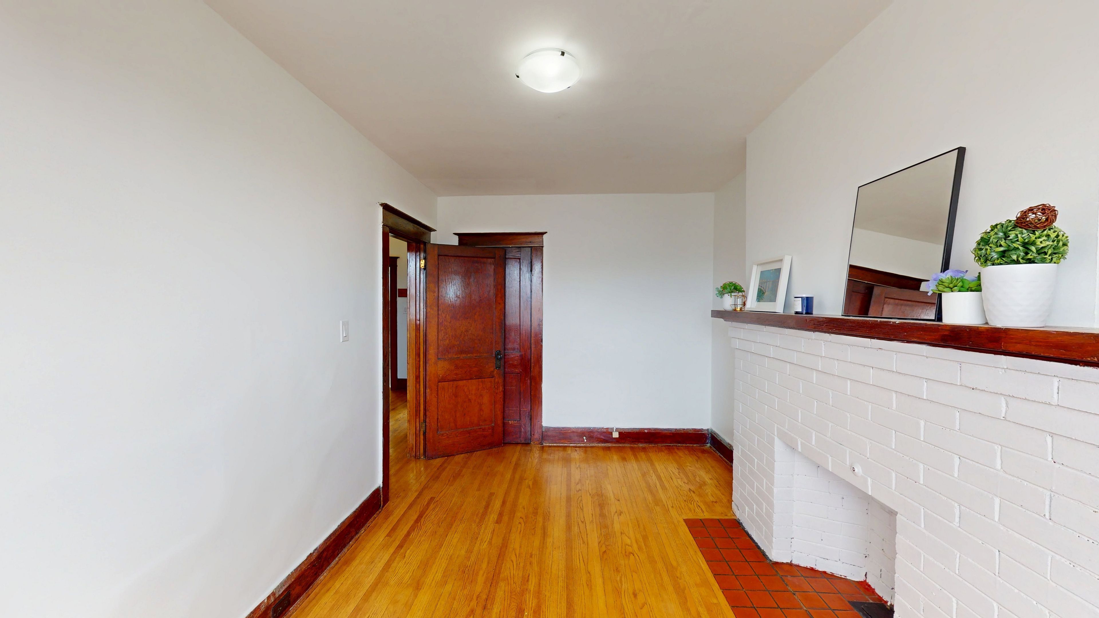 • Bright upper-level apartment filled with natural light and wood accents.