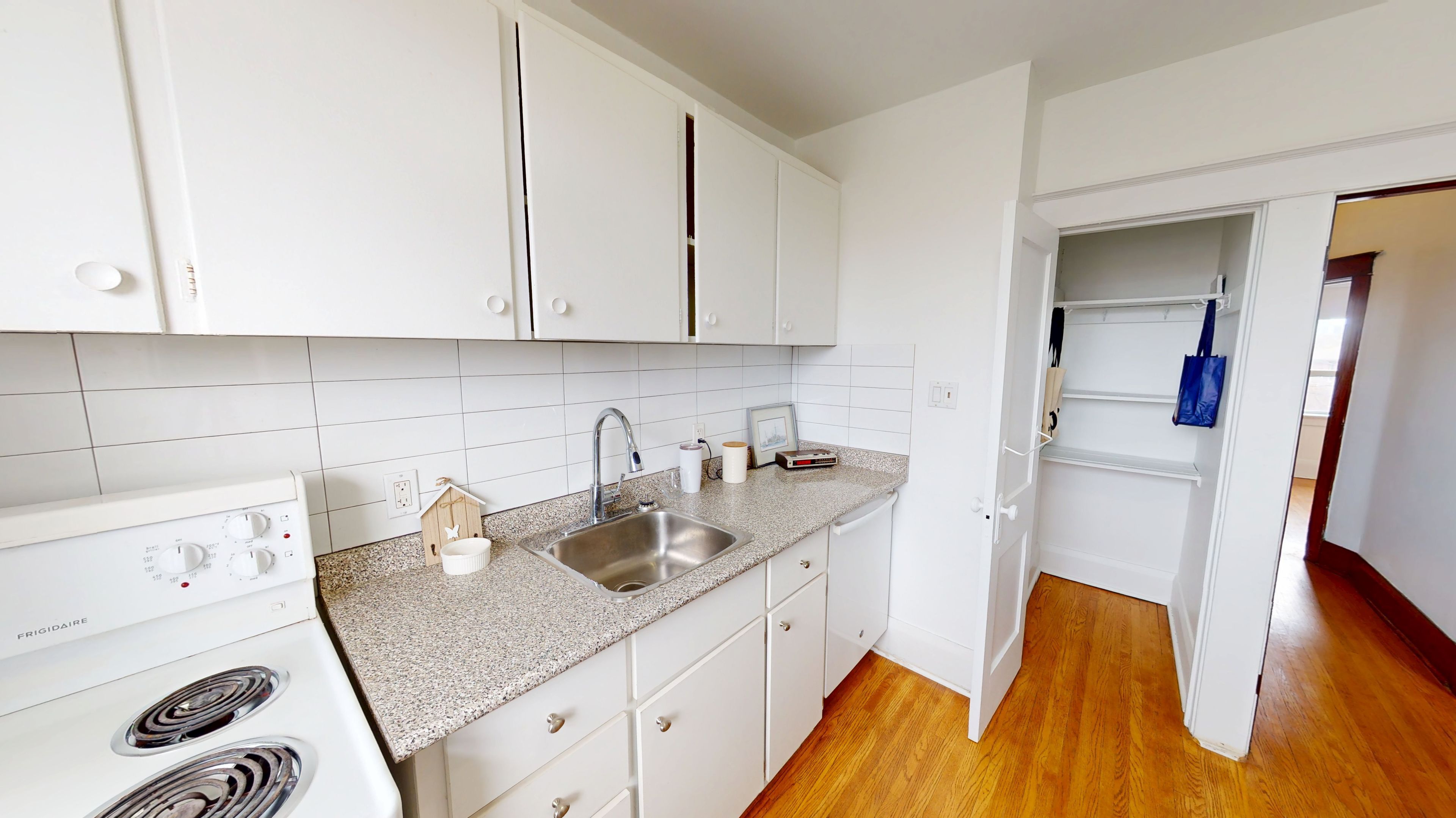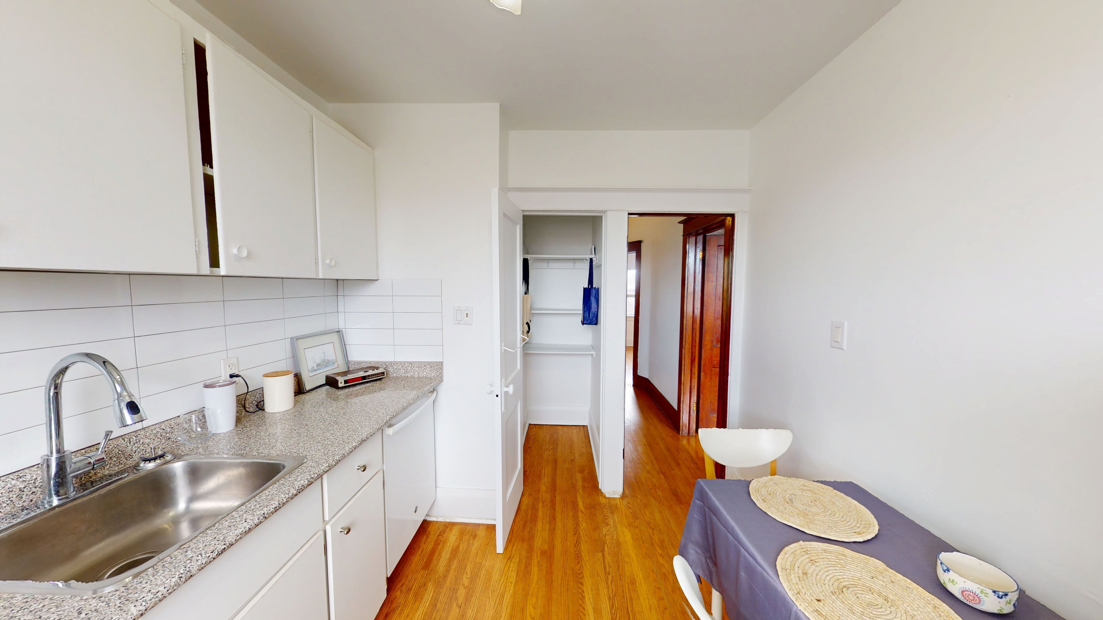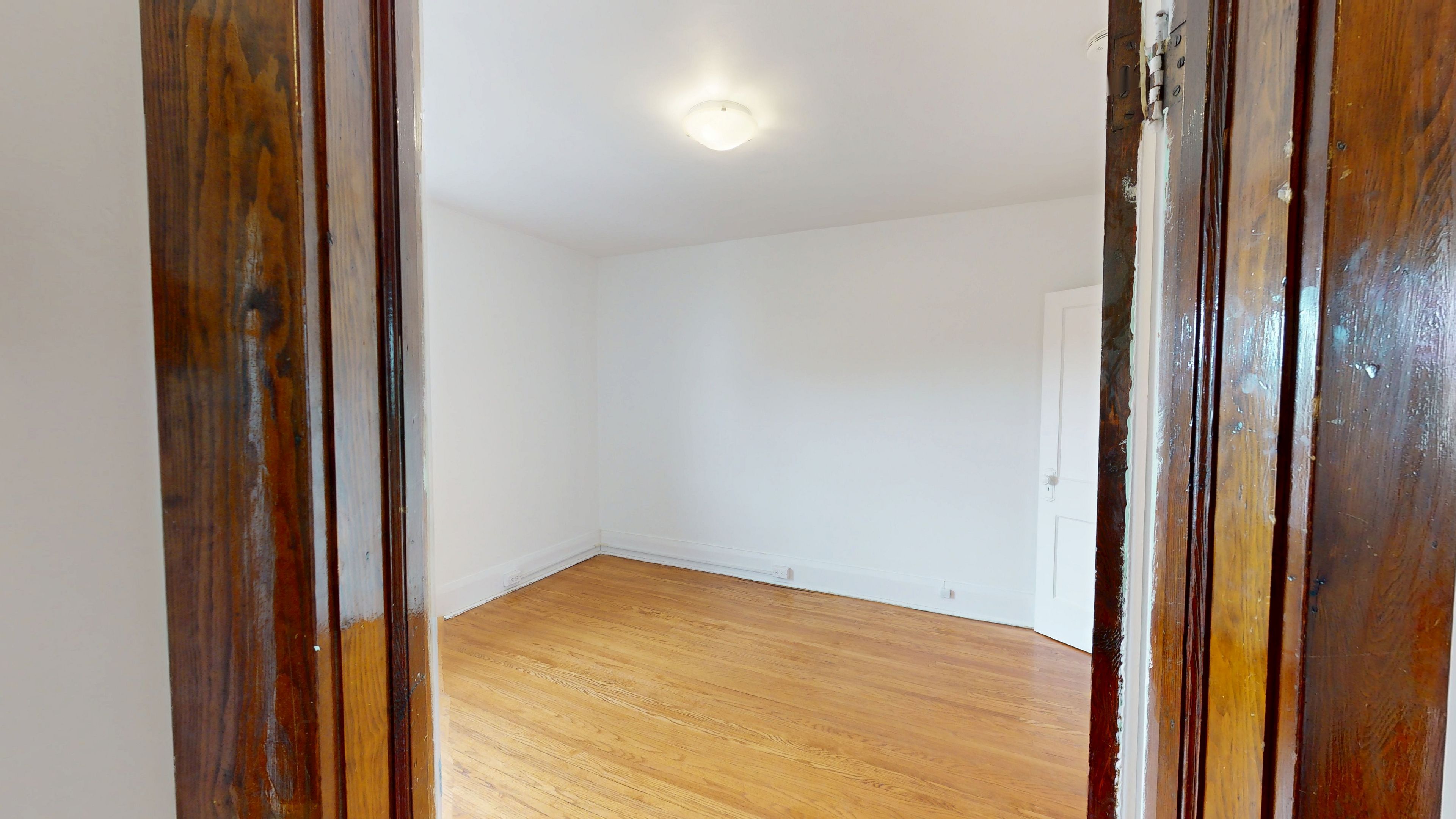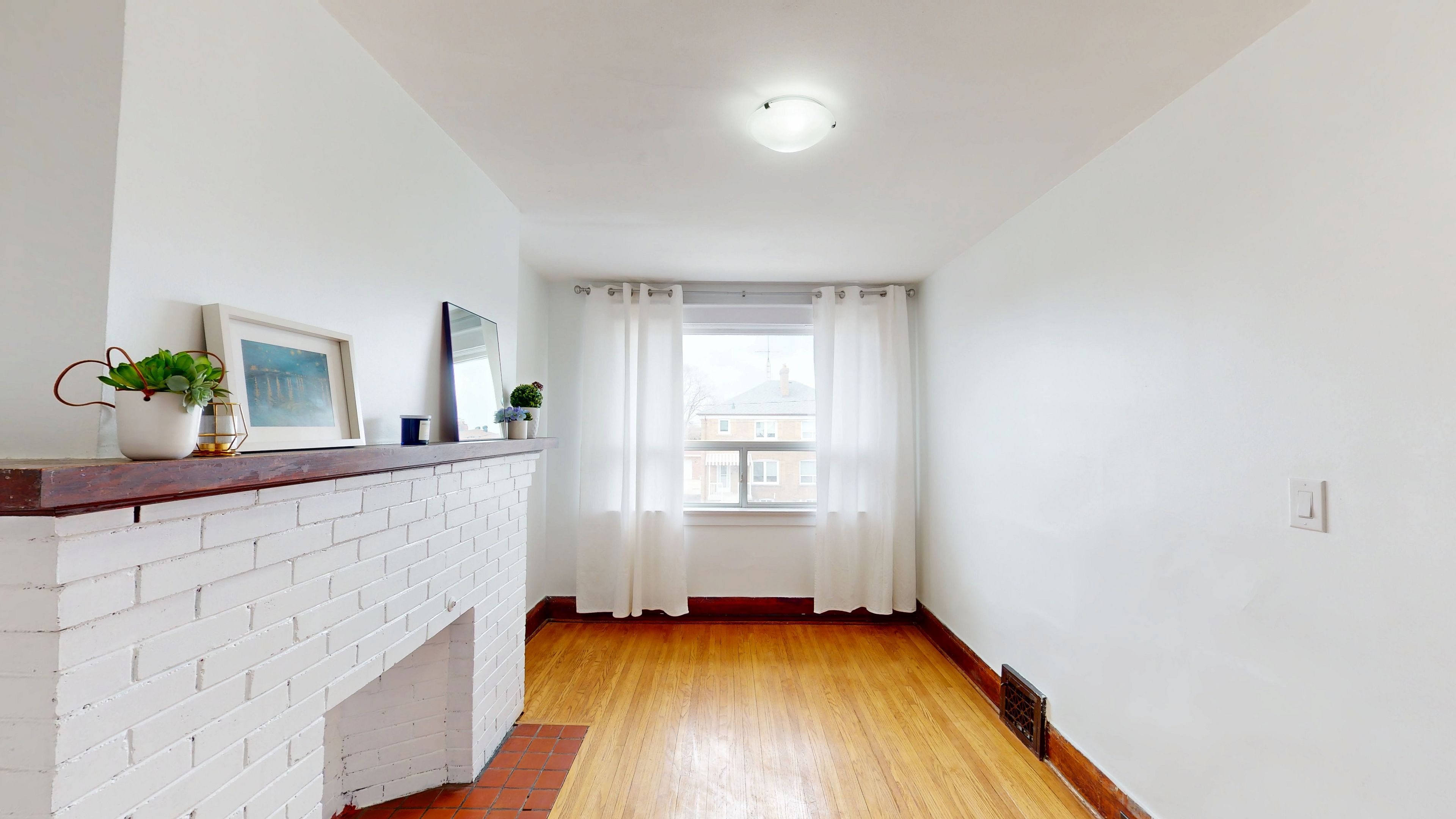 • Bright upper-level apartment filled with natural light and wood accents.