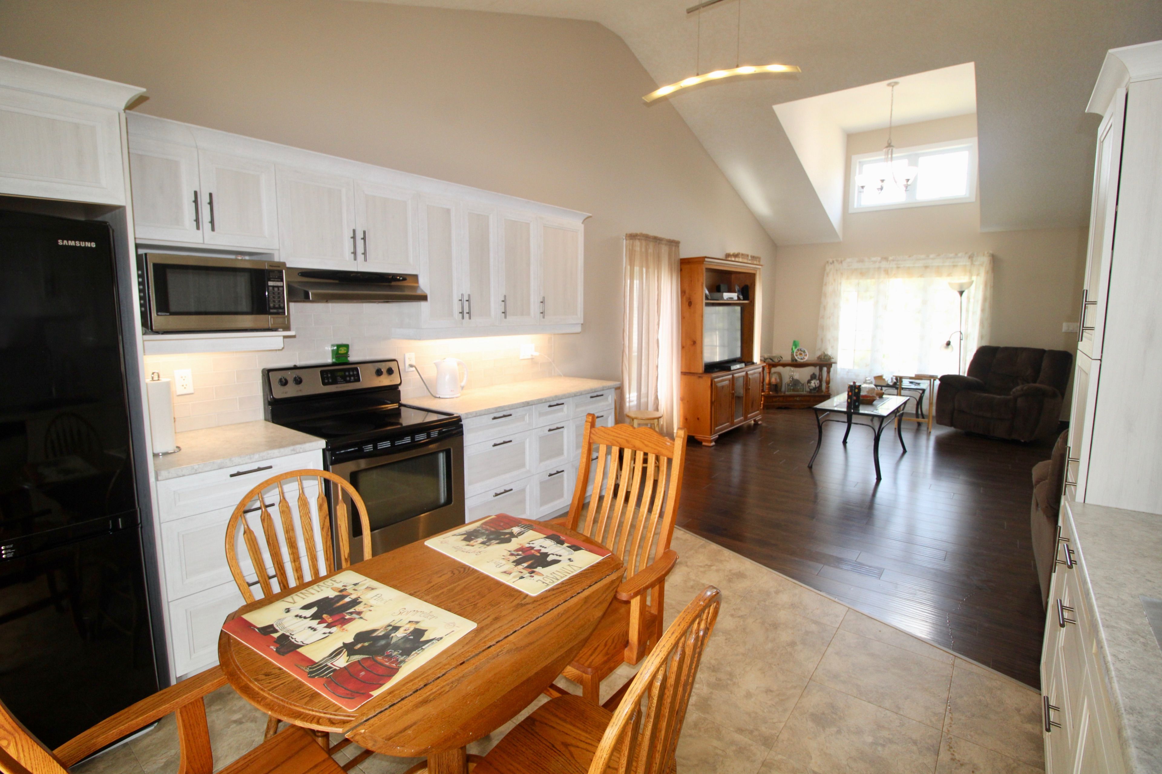 • Open living area with vaulted ceilings in living room and kitchen.
