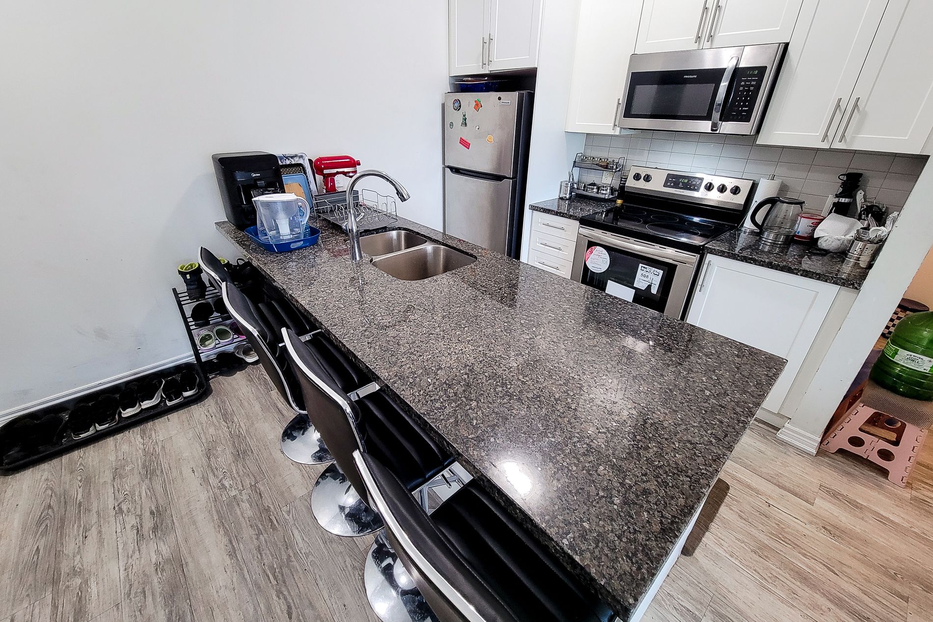 • Spacious open-concept layout with quartz countertops and breakfast bar.