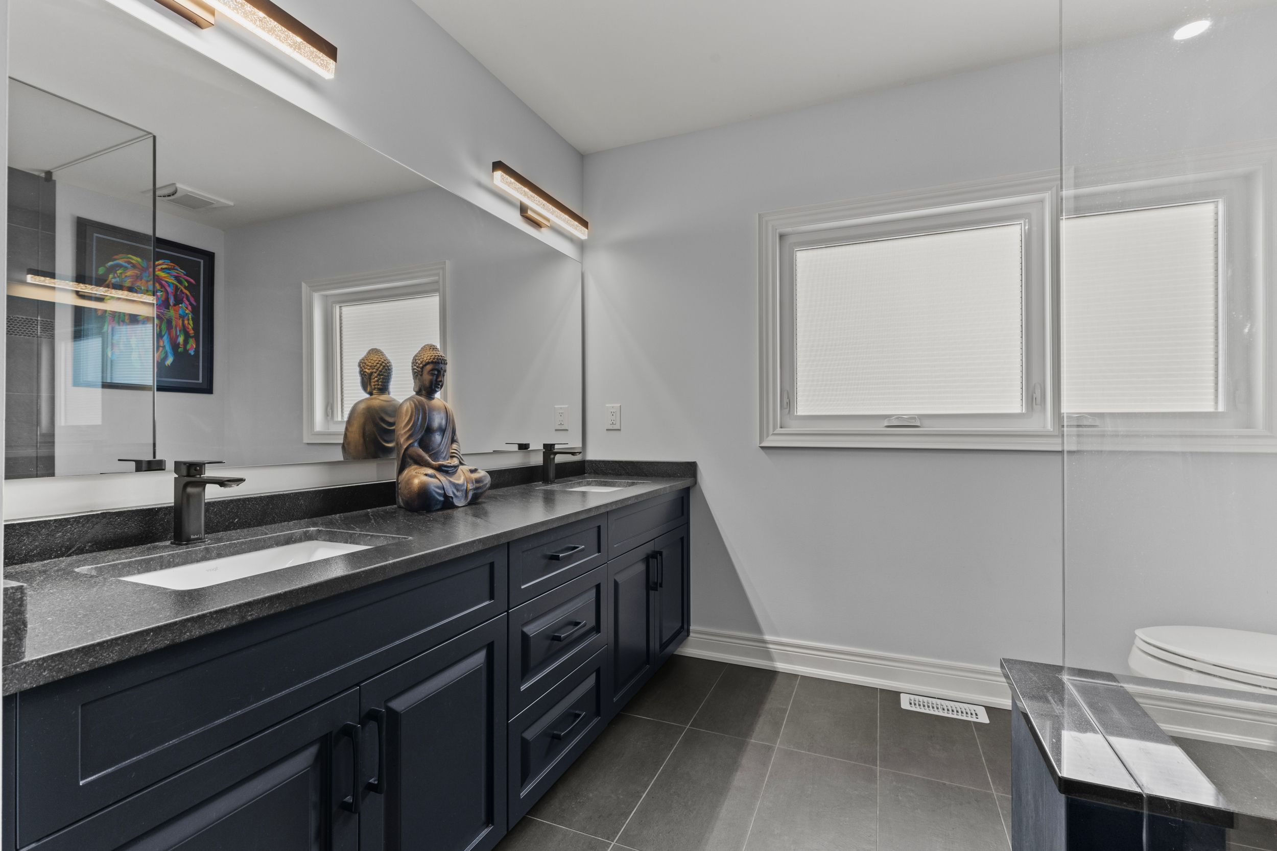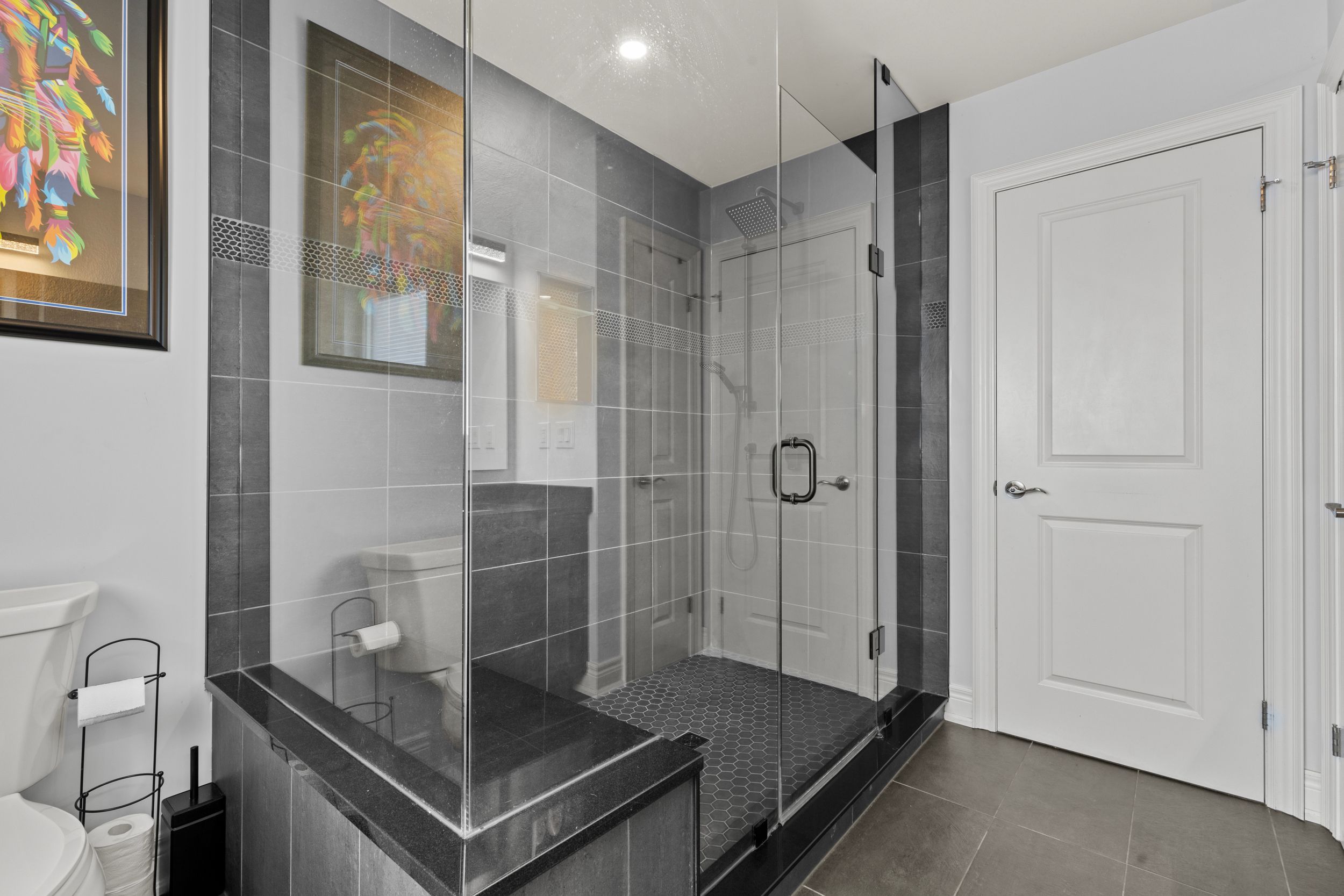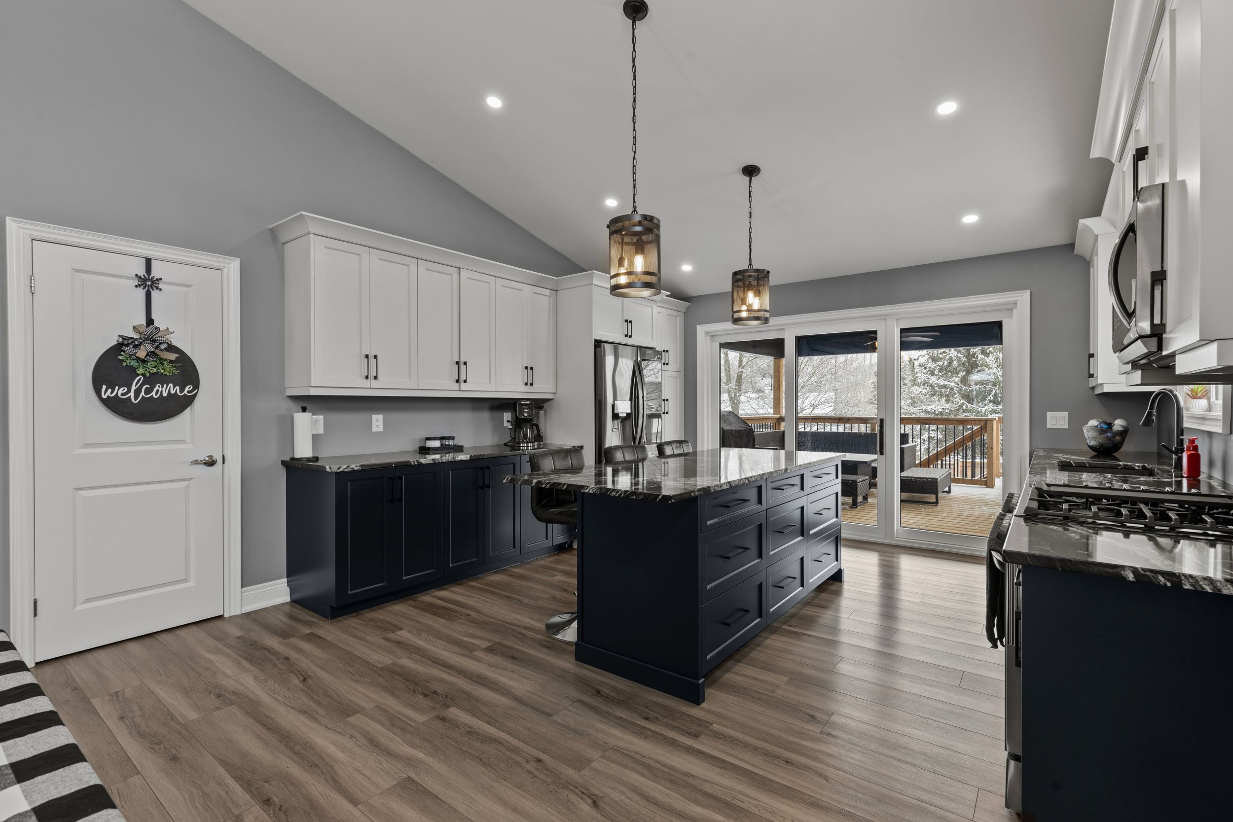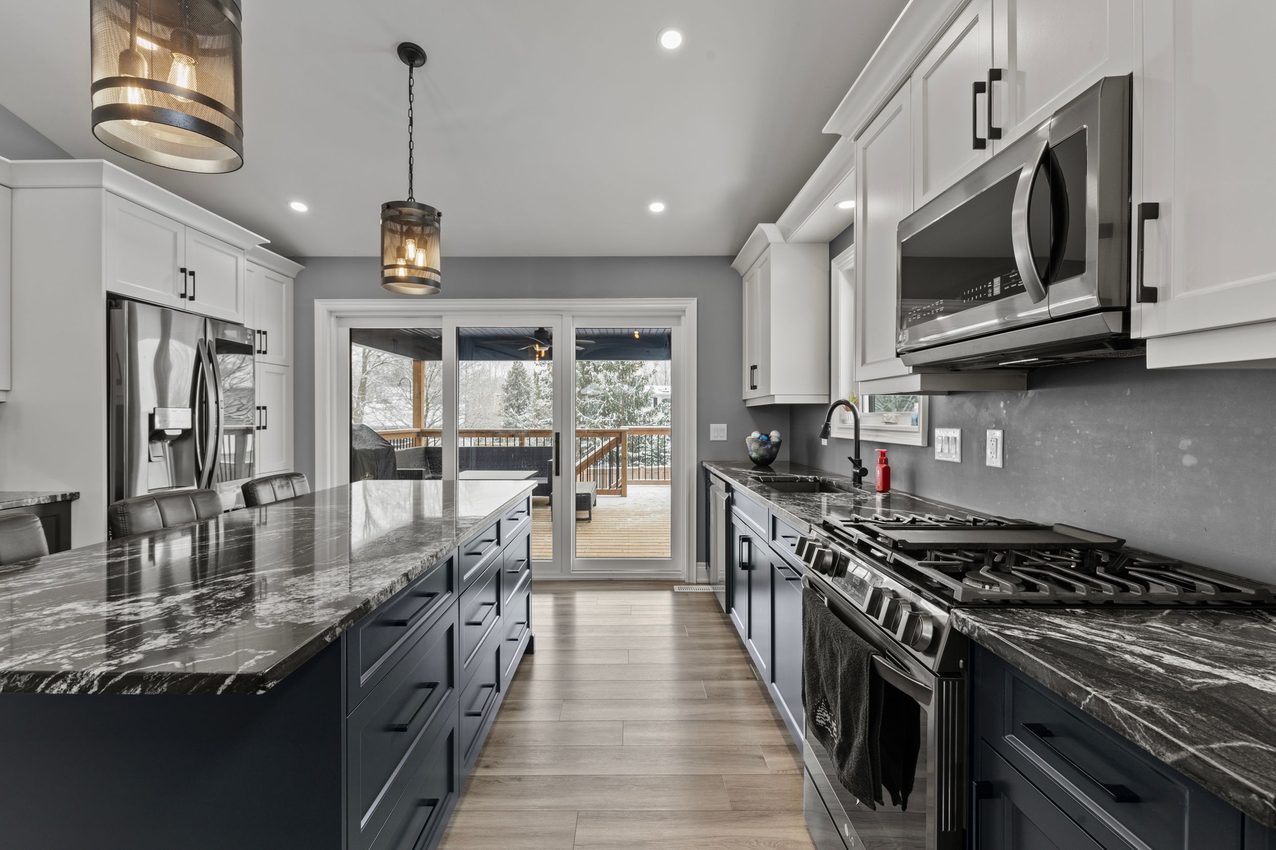 • Impressive kitchen features a large island, quartz counters, and quality appliances.